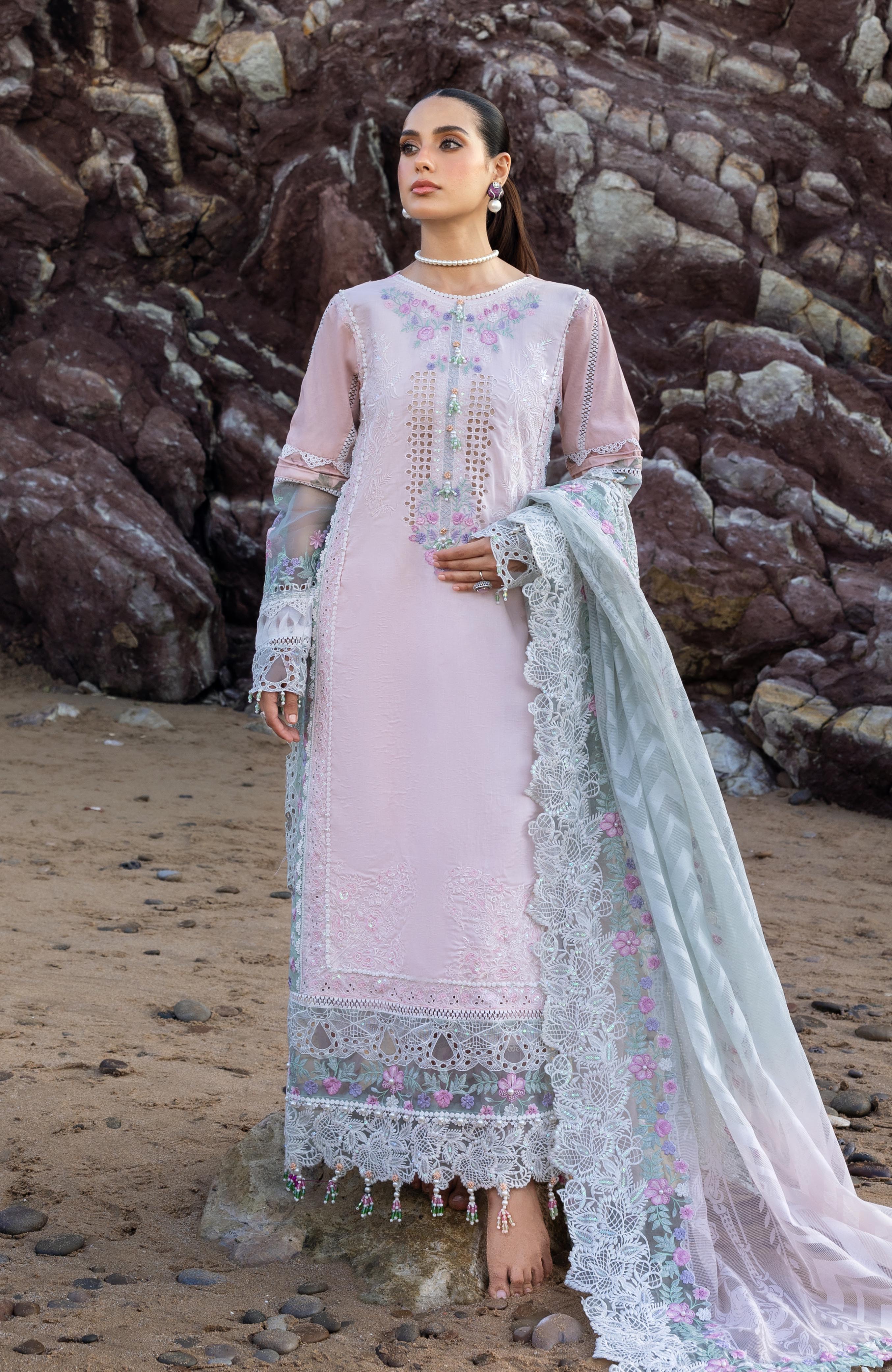 Summary: Exude timeless elegance in this stunning Pink Pakistani Lawn Suit from Al Zohaib's Mahiymaan Luxury Lawn collection, beautifully modeled by Iqra Aziz. The breathable lawn fabric makes this ethnic wear perfect for spring and summer festivities. The kameez is a masterpiece of craftsmanship, featuring intricate embroidery on the front, a detailed organza center panel, and an embellished gala and daman. Paired with an embroidered organza dupatta, this unstitched outfit is a premier choice for formal gatherings, Eid celebrations, or sophisticated parties. This festive ensemble allows for a custom fit, creating a truly graceful look.