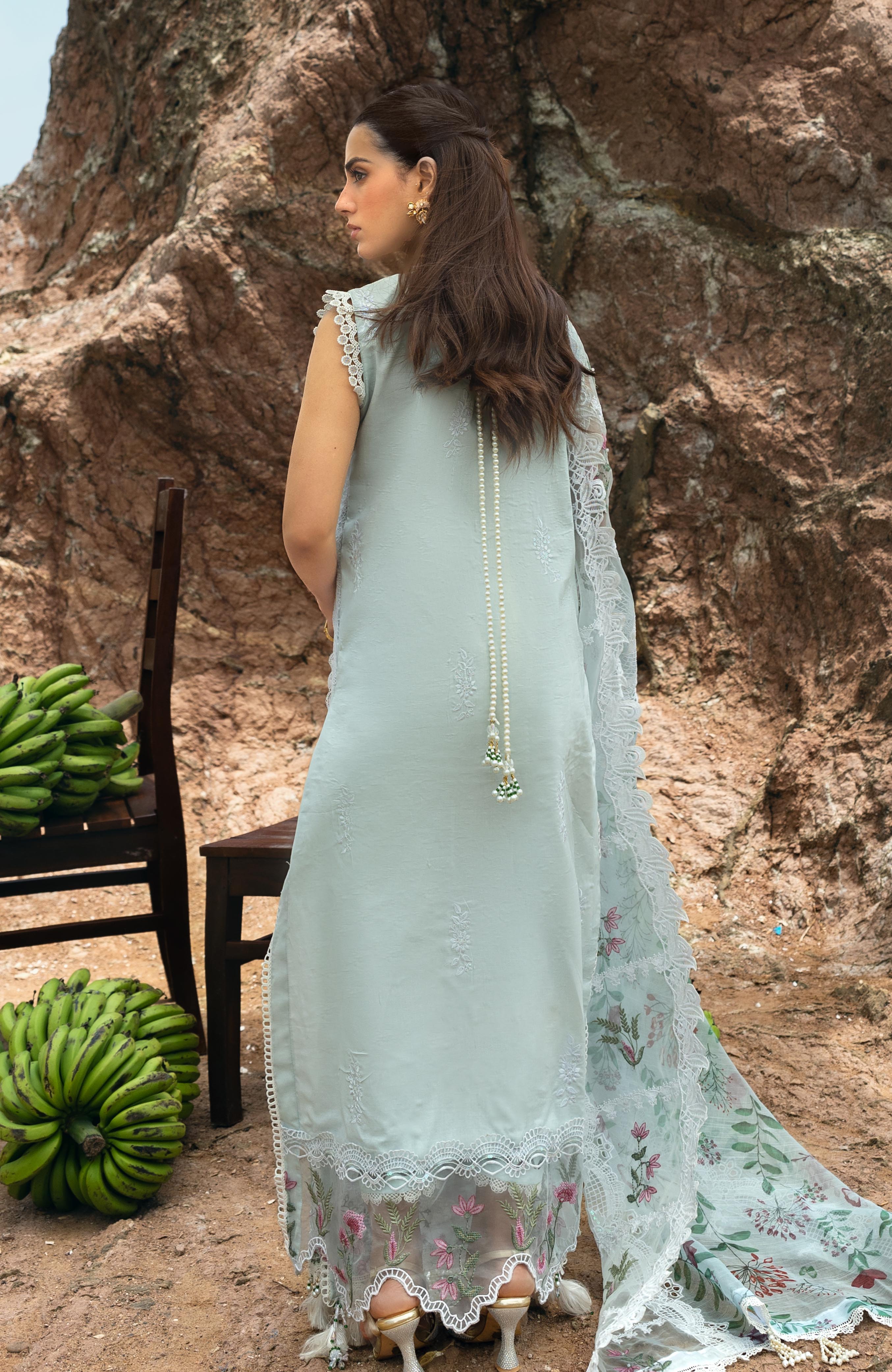 Summary: Embrace sublime elegance with the Al Zohaib Mahiymaan Luxury Lawn suit, beautifully showcased by Iqra Aziz. This unstitched Pakistani suit features a serene Sea Green kameez crafted from premium, breathable lawn fabric, making it a perfect summer outfit. The shirt is a canvas of artistry with its intricately embroidered front, sleeves, and appliqued daman bunches. Ideal for festive occasions and formal gatherings, this ethnic wear ensemble exudes sophistication. This stunning Pakistani lawn dress is a must-have for your Eid or party wear collection, offering grace and style for any daytime celebration.