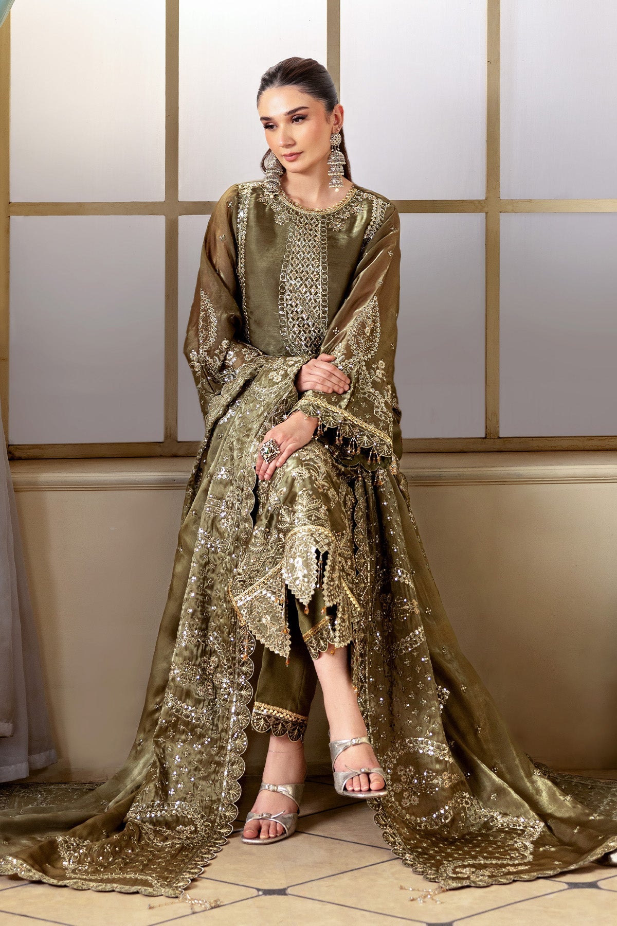 Summary: Radiate elegance with this exquisite Olive Green Pakistani Suit from the Alizeh Aaina collection. The main kameez is crafted from lustrous Sheesha Silk, heavily embellished with intricate traditional embroidery and shimmering mirror work that defines luxury. This unstitched formal dress material captures the essence of ethnic sophistication, making it an ideal choice for Mehndi ceremonies and wedding parties. The rich olive hue complements the sheen of the silk fabric, offering a regal look for festive occasions. Whether styled for an evening gala or a cultural celebration, this ensemble promises timeless beauty. Shop online to add this statement festive wear to your wardrobe.