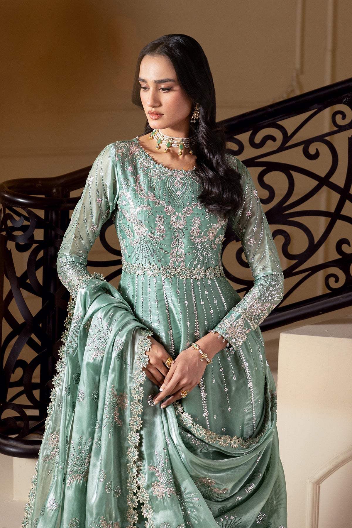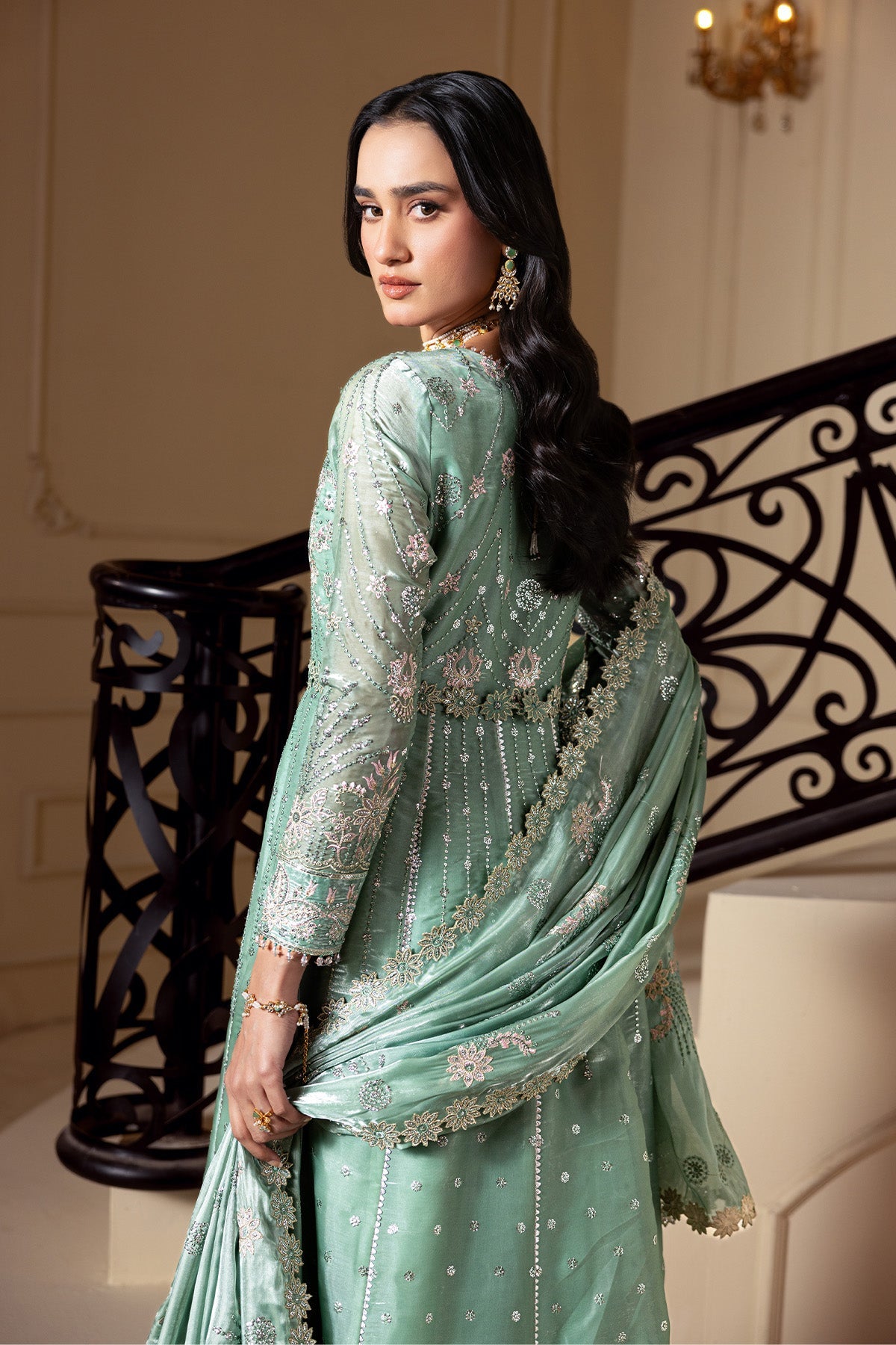 Summary: Embrace the allure of ethnic luxury with this breathtaking Sea Green Pakistani suit from the Alizeh Aaina collection. Crafted from premium Sheesha Silk, this floor-length unstitched ensemble features dazzling mirror work and intricate embroidery across the front, back, and sleeves, creating a regal silhouette. The lustrous silk fabric and pastel hue make it a sophisticated choice for Spring/Summer festivities, including Walima functions and engagement parties. Paired with a matching embroidered dupatta, this dress epitomizes traditional craftsmanship meets modern elegance. Elevate your formal wardrobe with this timeless masterpiece, perfect for making a radiant statement at any wedding event.