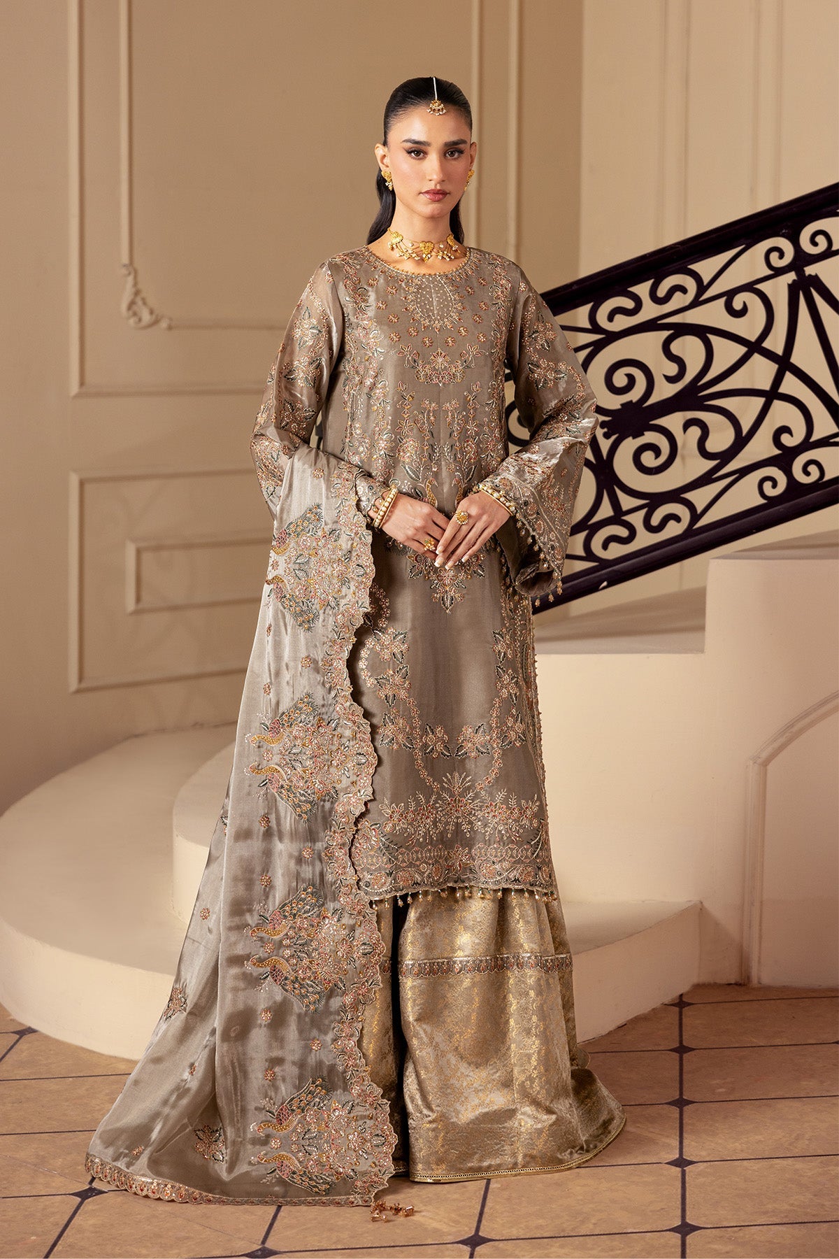 Summary: Elevate your festive wardrobe with this stunning Alizeh Aaina Sheesha Silk Pakistani suit in a sophisticated metallic grey. The unstitched ensemble features a lustrous silk kameez with intricate embroidery on the front, back, and sleeves, radiating luxury and grace. Paired with a traditional dyed Jamawar trouser and a matching embroidered silk dupatta, this outfit is the epitome of ethnic elegance. Perfectly suited for wedding guests, formal parties, and festive celebrations, this dress material offers versatility and style. Experience the charm of premium Pakistani formal wear with this exquisite design. Shop this timeless look online today for your next special event.