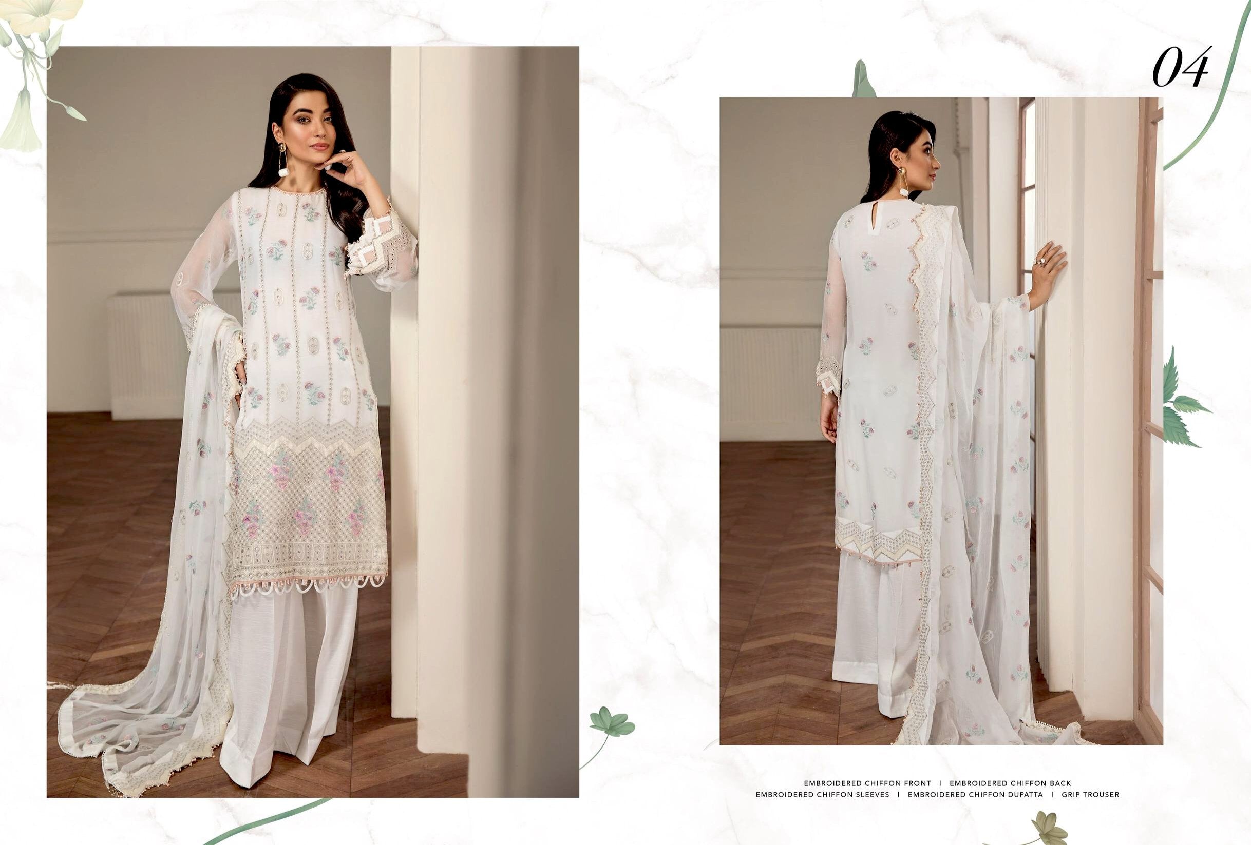 Fabric: Embroidered Chiffon Front Embroidered Chiffon Back Embroidered Chiffon Sleeves Embroidered Chiffon Dupatta Grip Trouser |