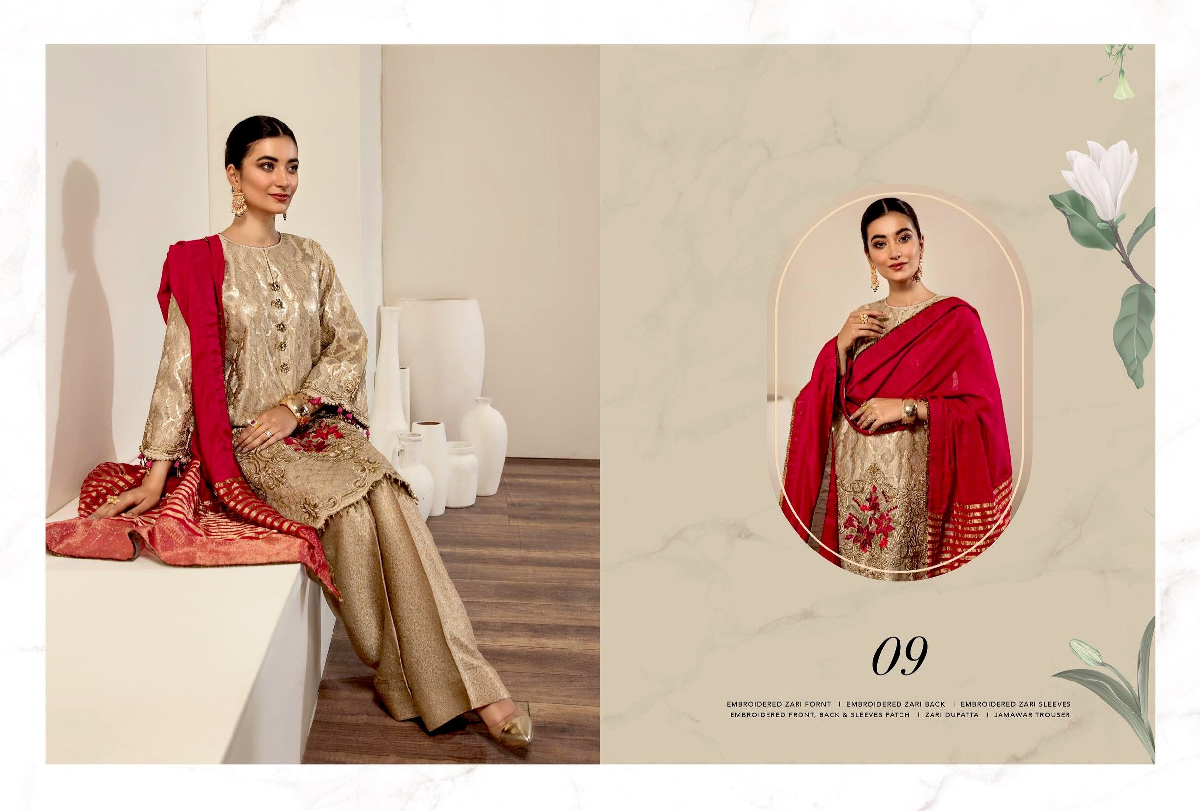 Fabric: Embroidered Zari Fornt Embroidered Zari Back Embroidered Zari Sleeves Embroidered Front, Back & Sleeves Patch Zari Dupatta Jamawar Trouser |