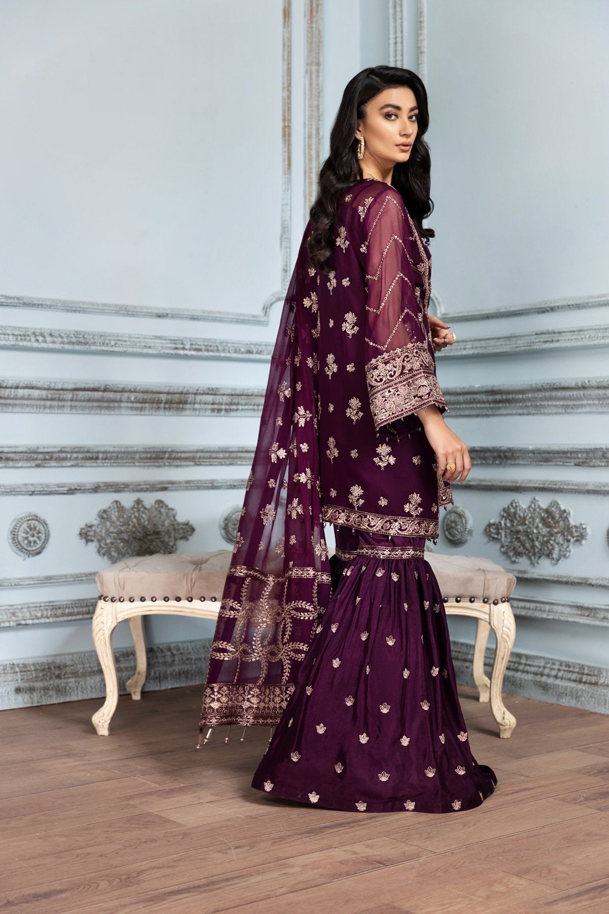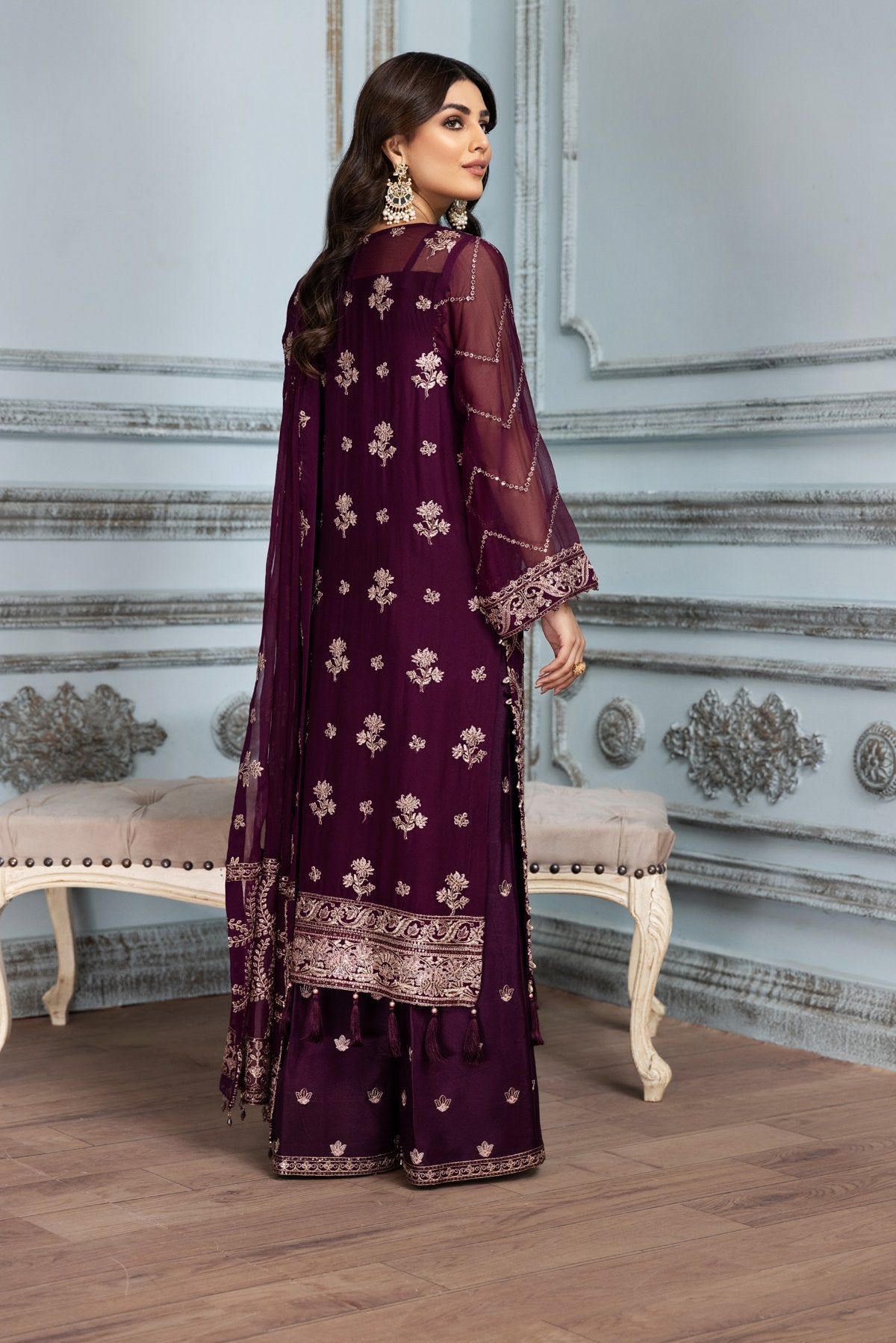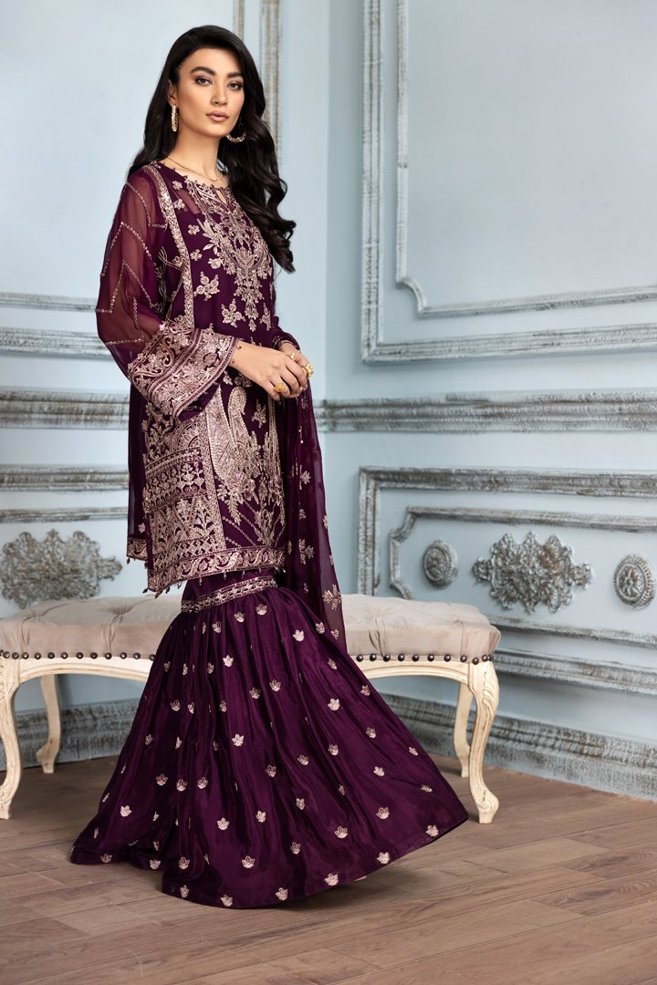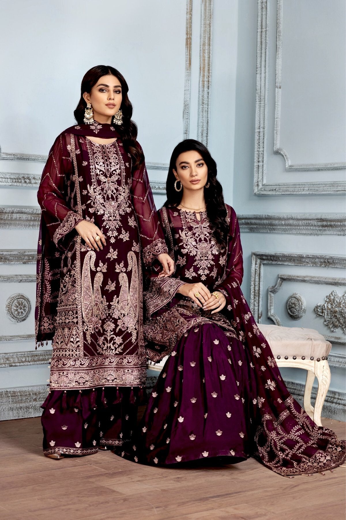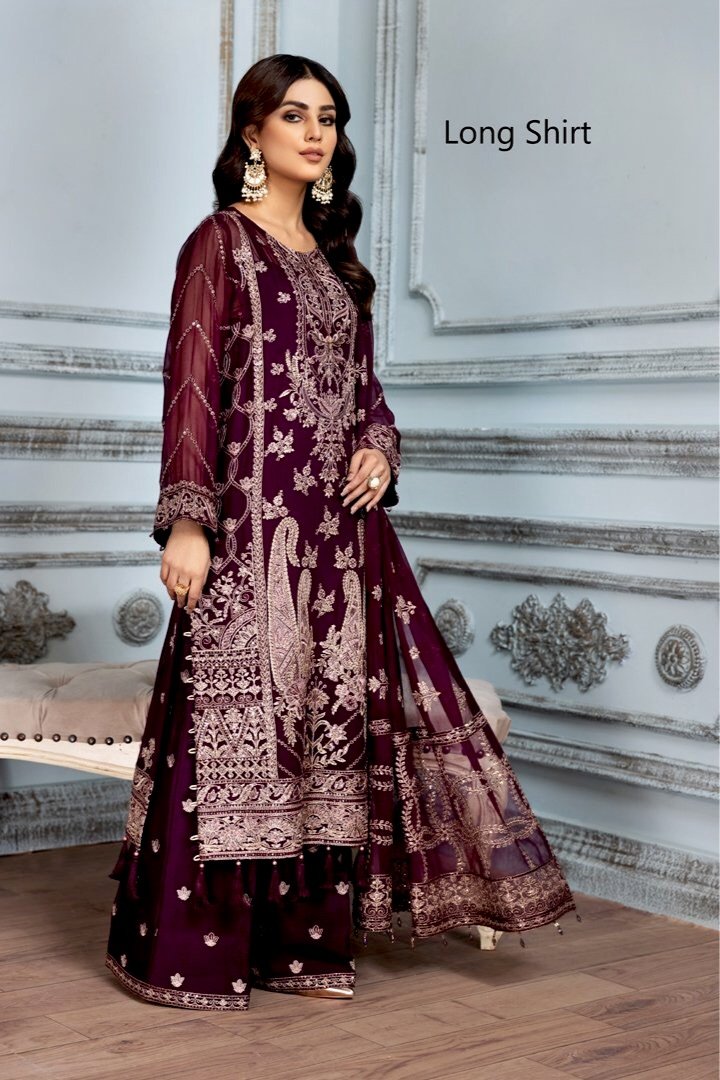 Fabric: Embroidered Chiffon Front Center Panel Embroidered Chiffon Right + Left Panel Embroidered Chiffon Front + Back Patch 2 Embroidered Chiffon Back Embroidered Chiffon Sleeves Embroidered Chiffon Pallu Dupatta Embroidered Chiffon Trouser Patch Embroidered Russian Grip Trouser |