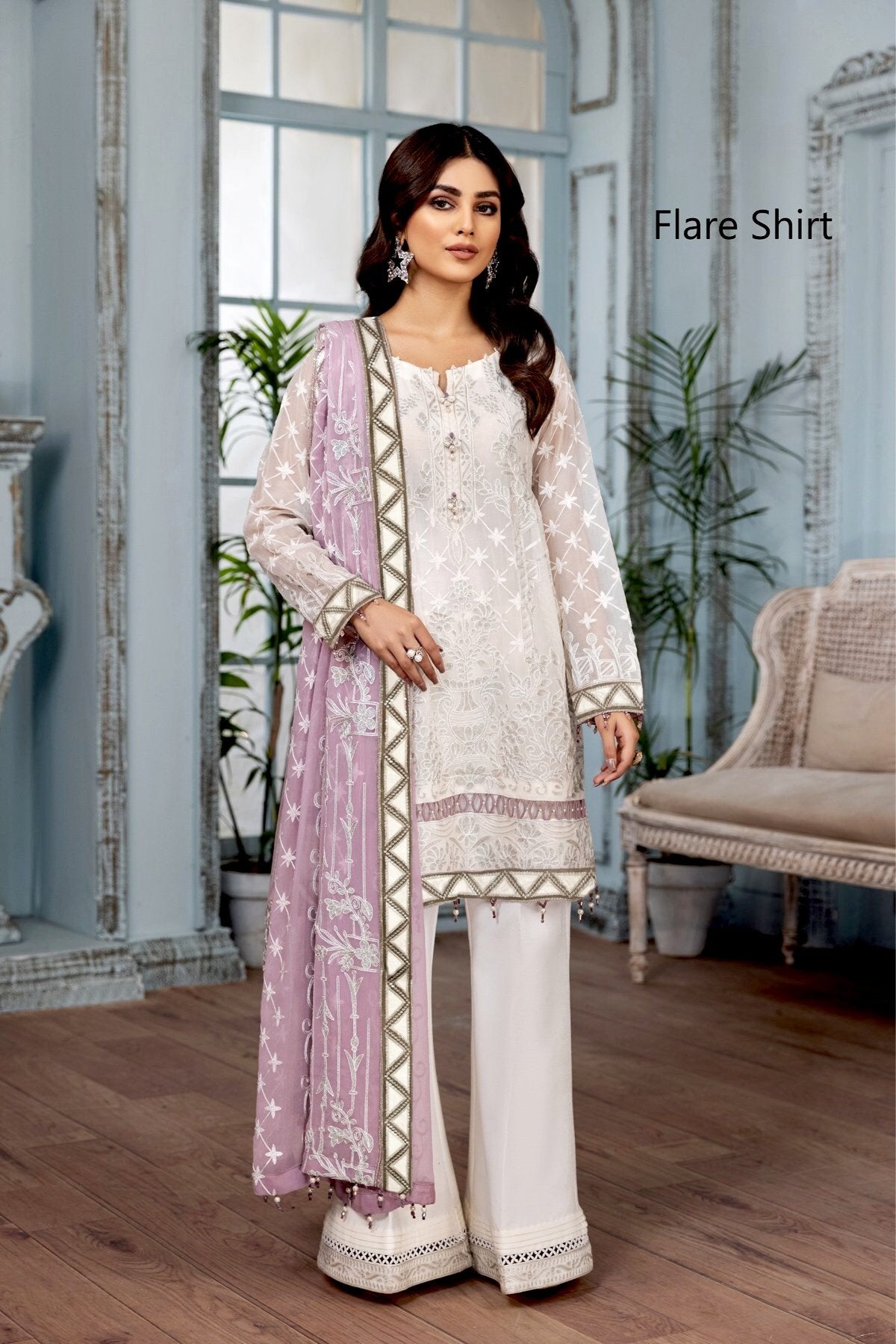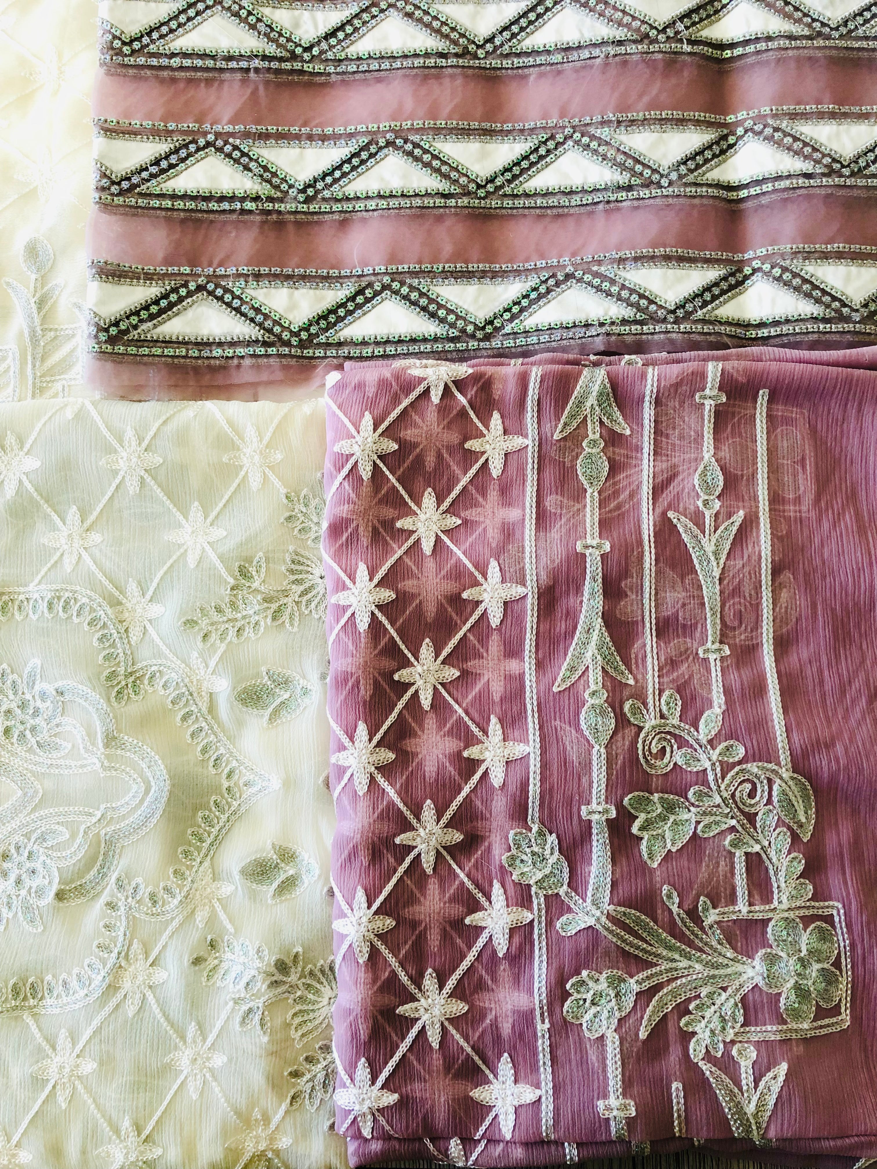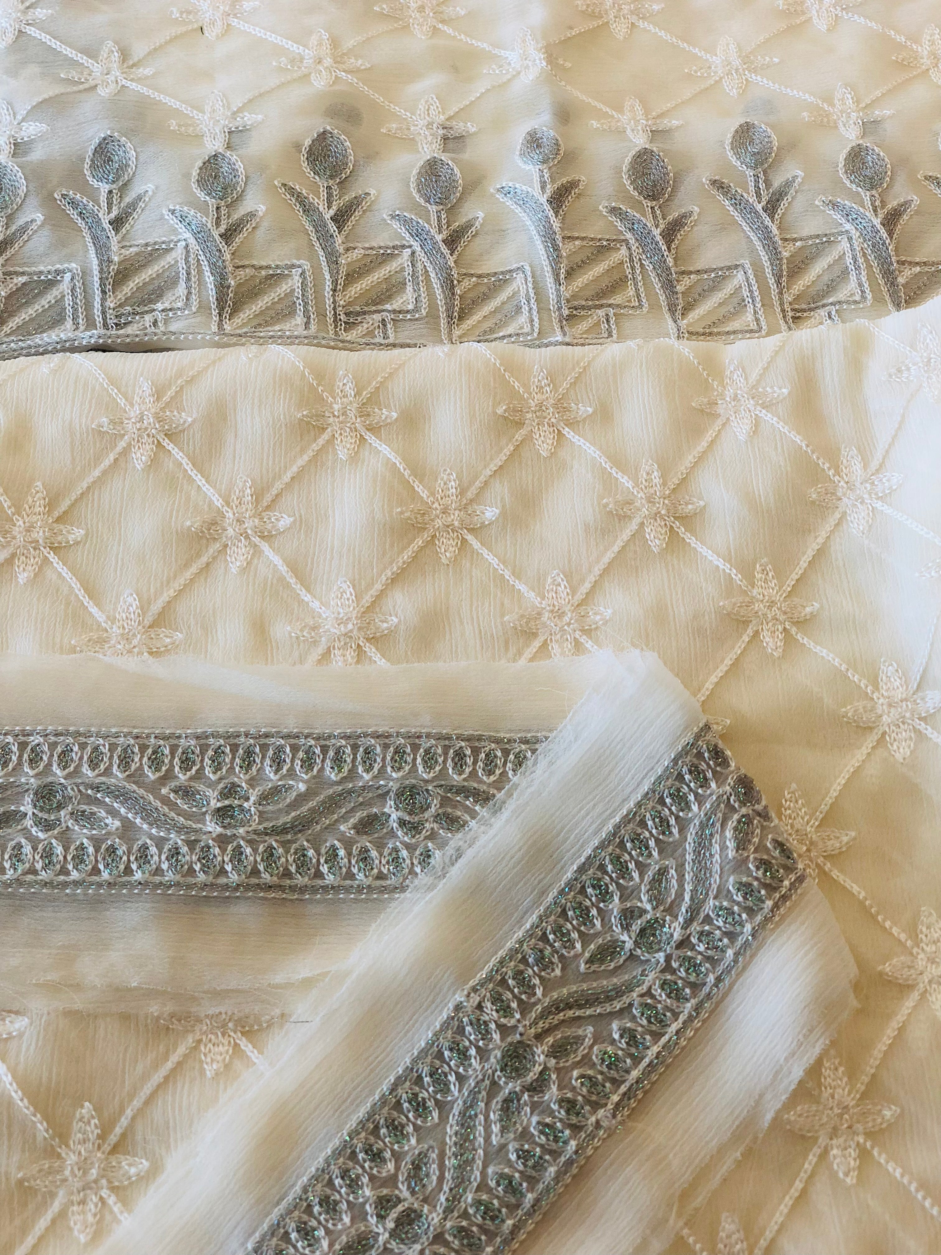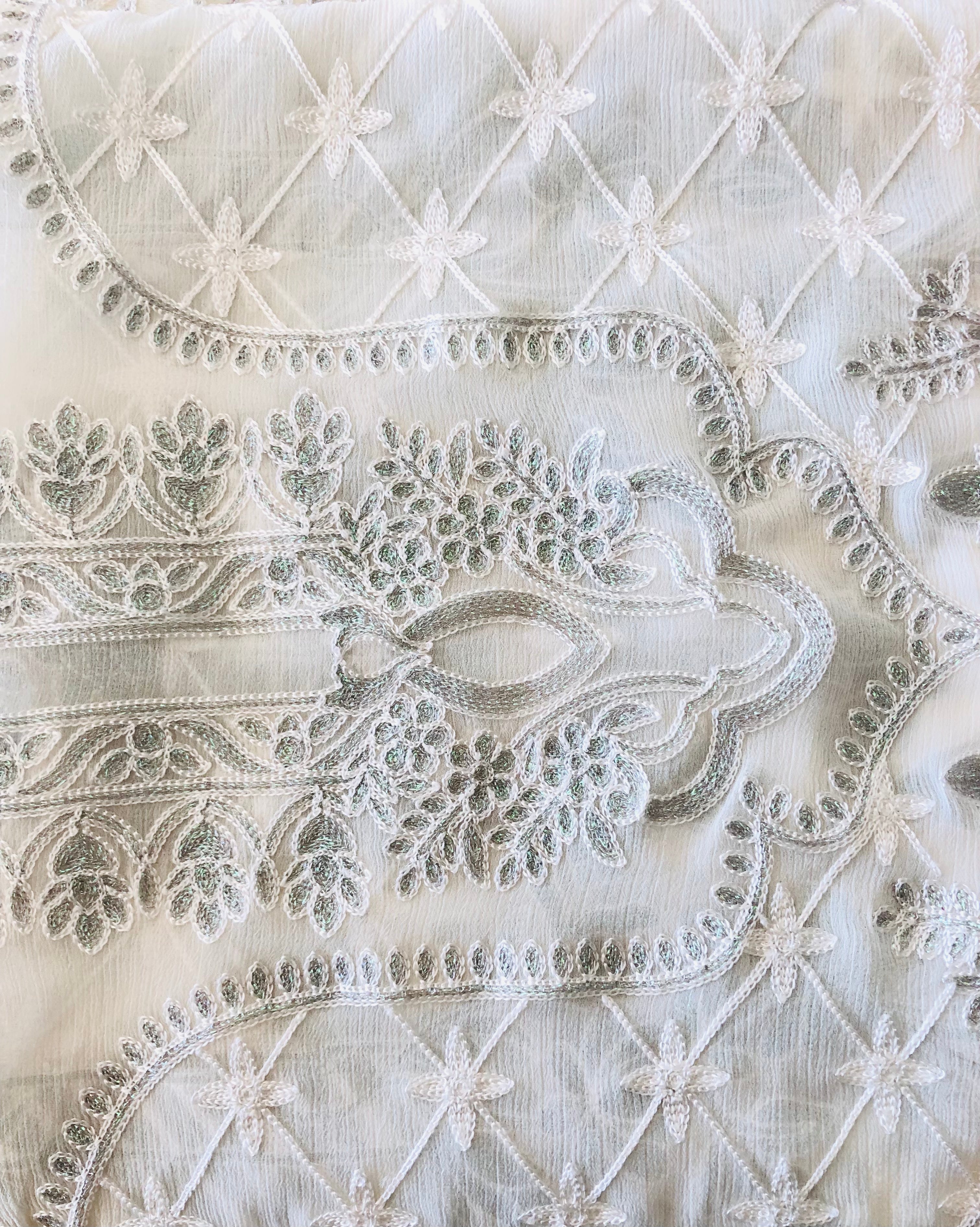 Fabric: Embroidered Chiffon Front Embroidered Chiffon Right + Left Kalli Embroidered Chiffon Front + Back Patch 2 Embroidered Chiffon Back Embroidered Chiffon Sleeves Embroidered Chiffon Dupatta Embroidered Organza Laser Dupatta Patch Dyed Raw Silk Trouser |