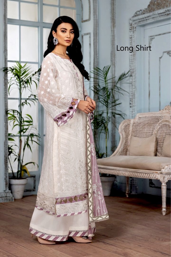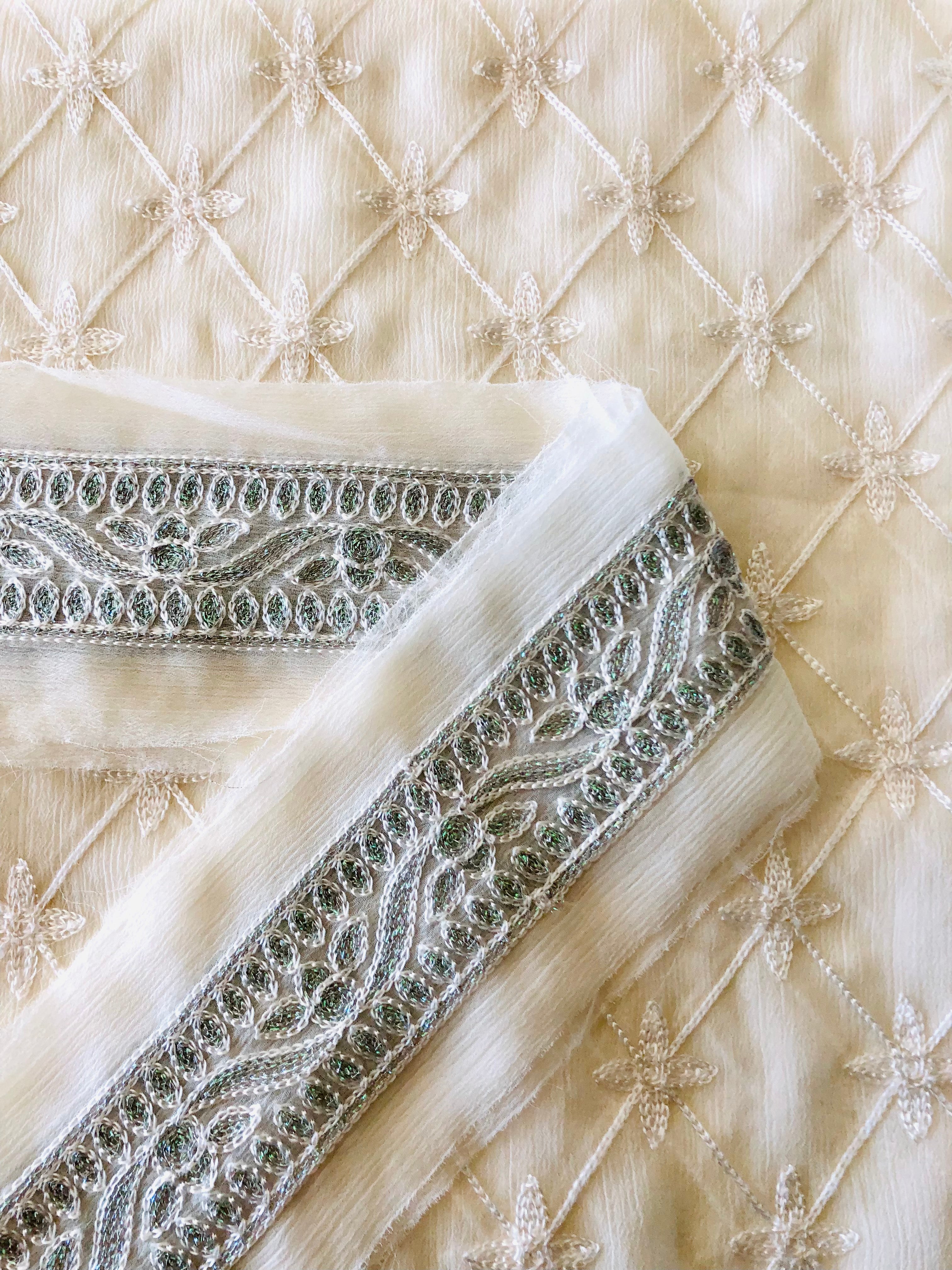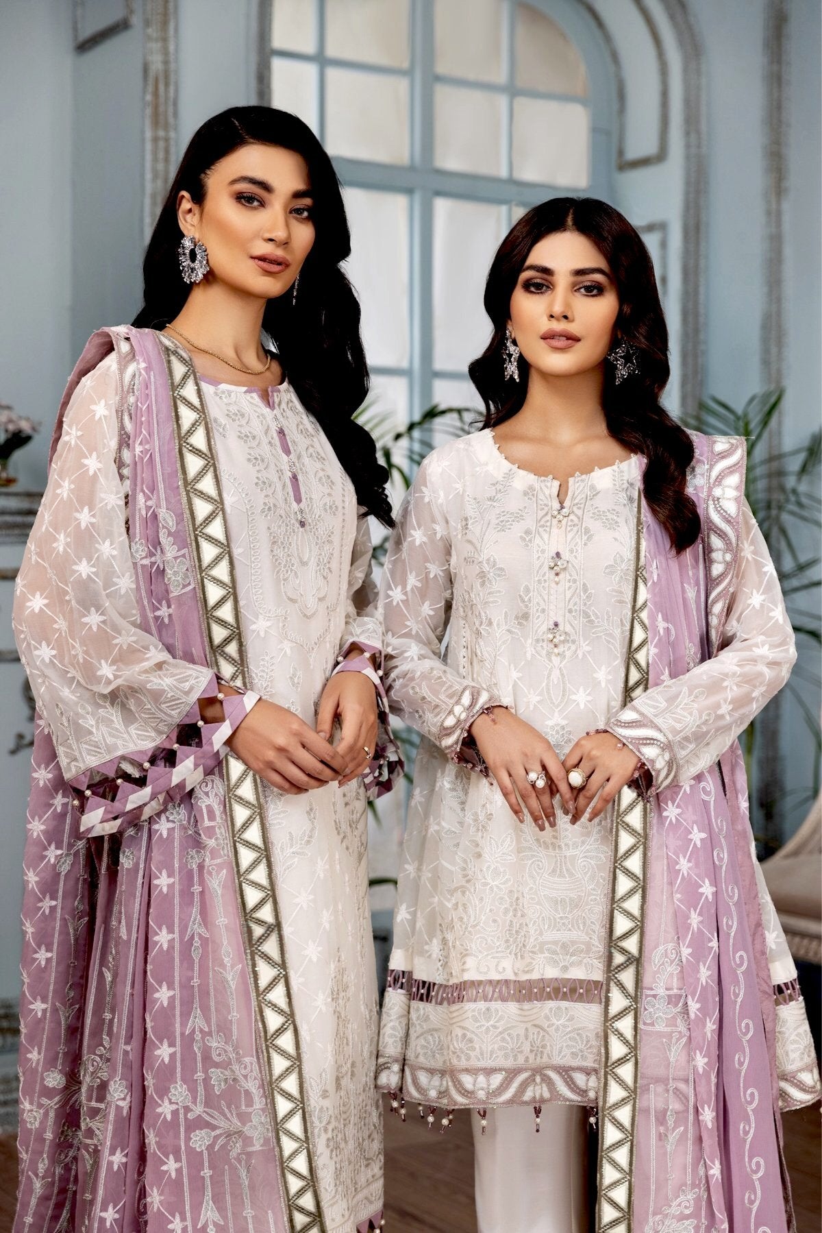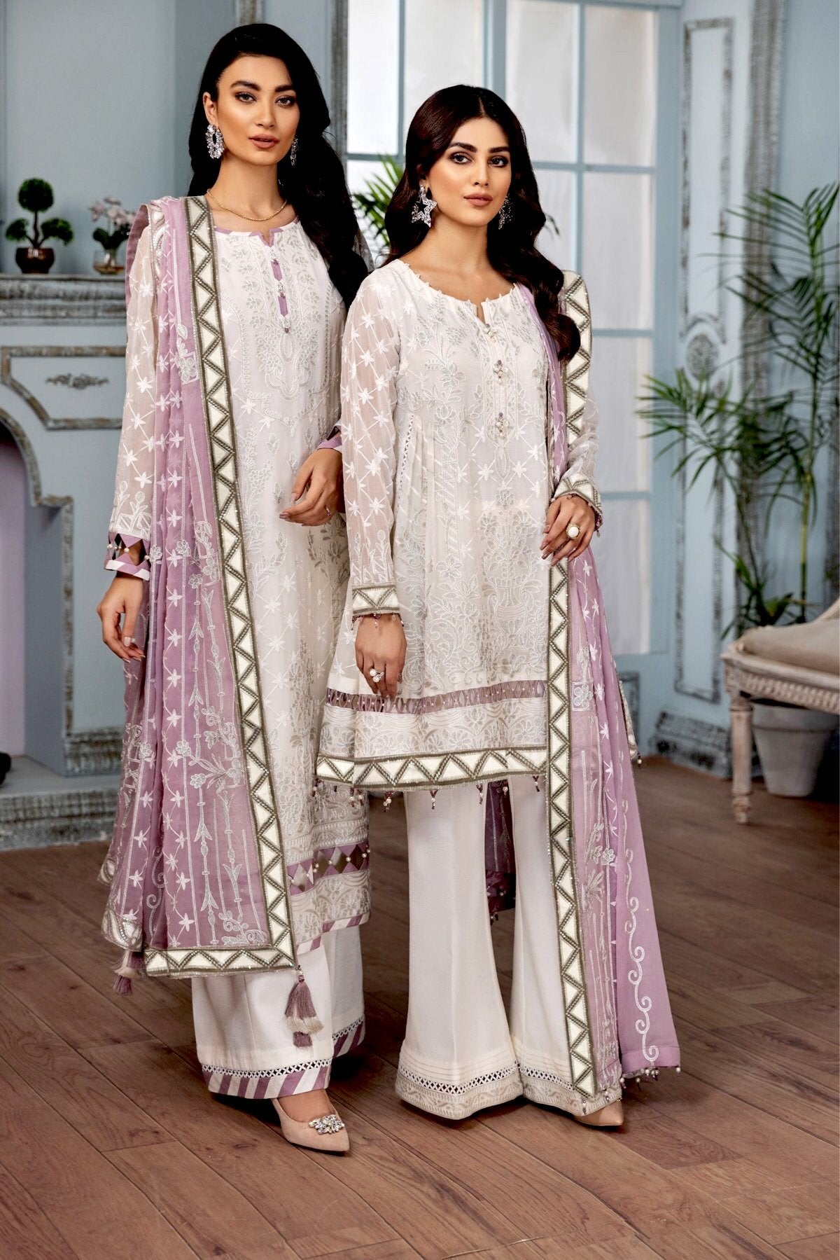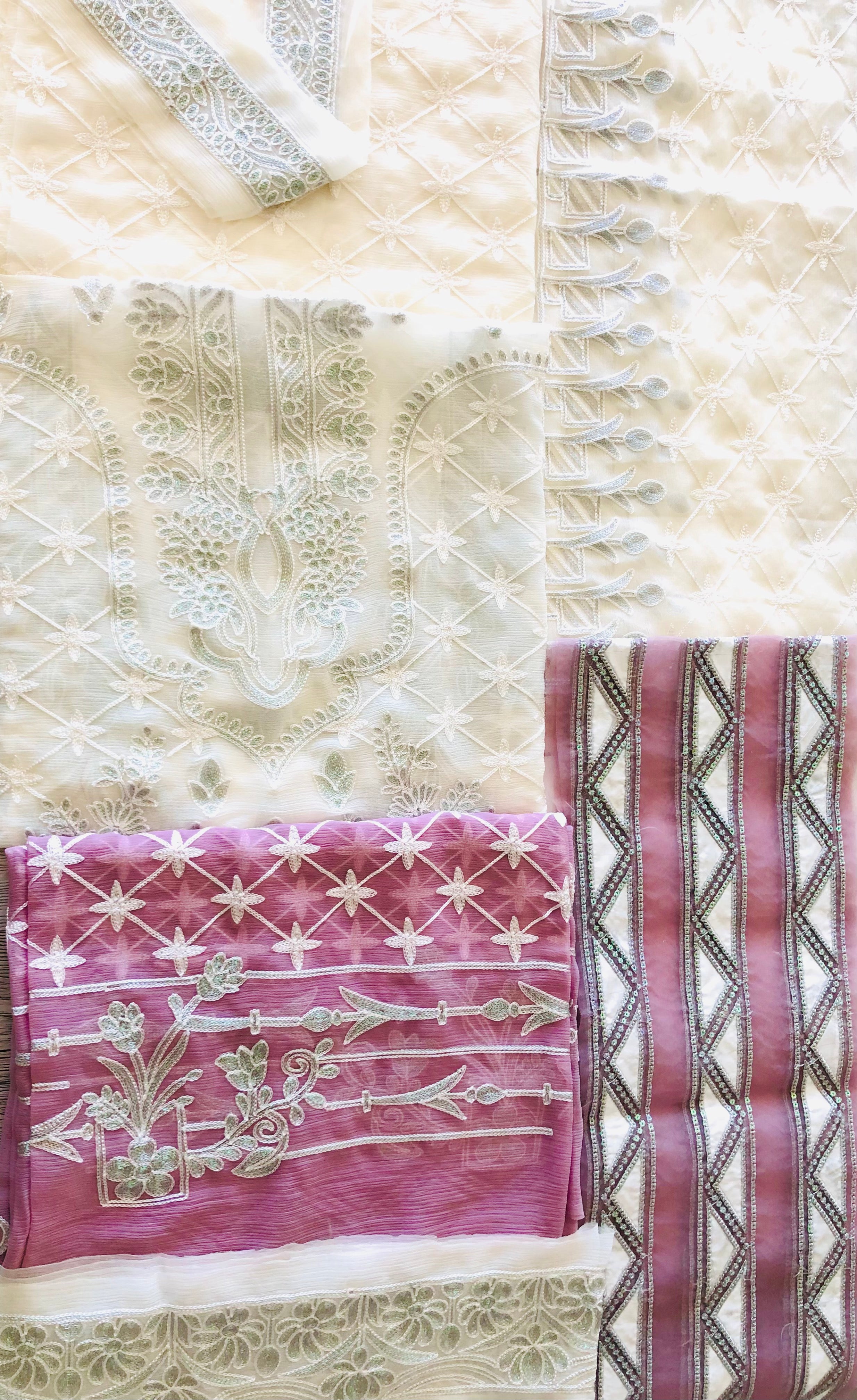 Fabric: Embroidered Chiffon Front Embroidered Chiffon Right + Left Kalli Embroidered Chiffon Front + Back Patch 2 Embroidered Chiffon Back Embroidered Chiffon Sleeves Embroidered Chiffon Dupatta Embroidered Organza Laser Dupatta Patch Dyed Raw Silk Trouser |