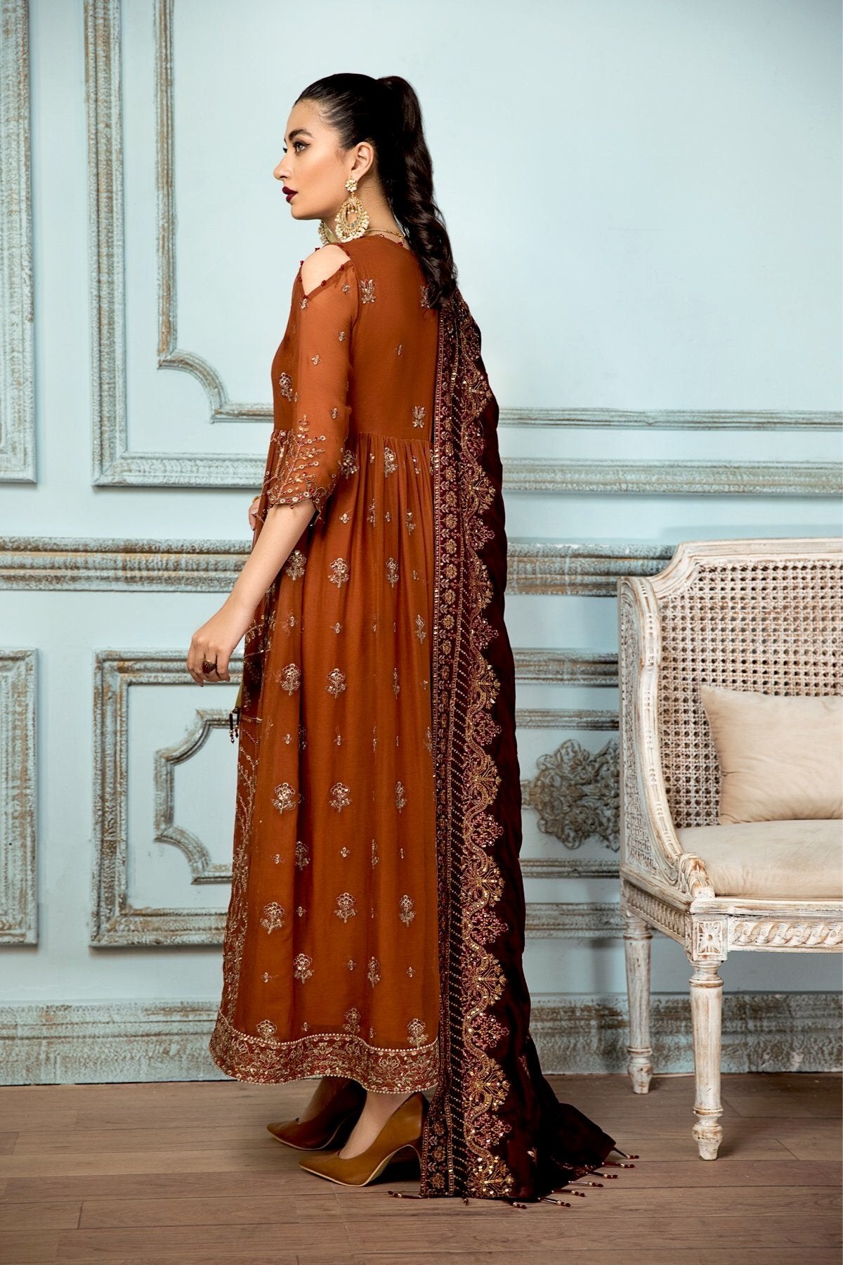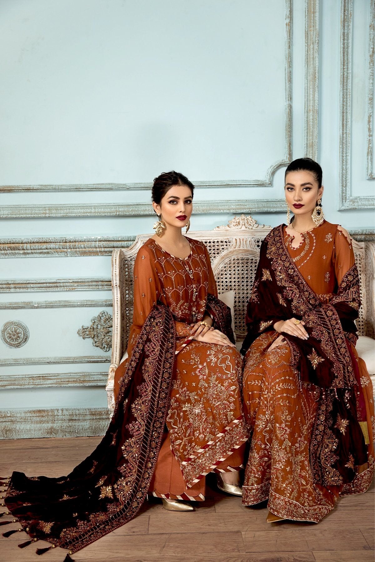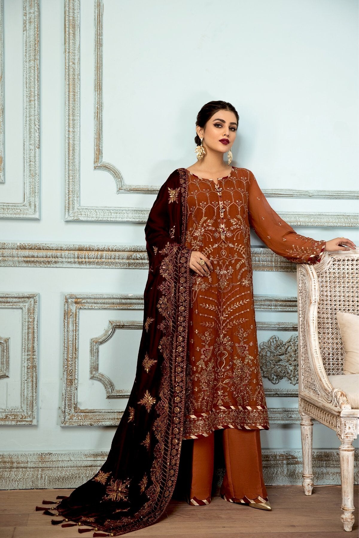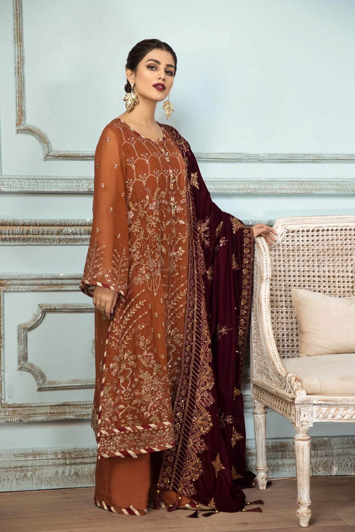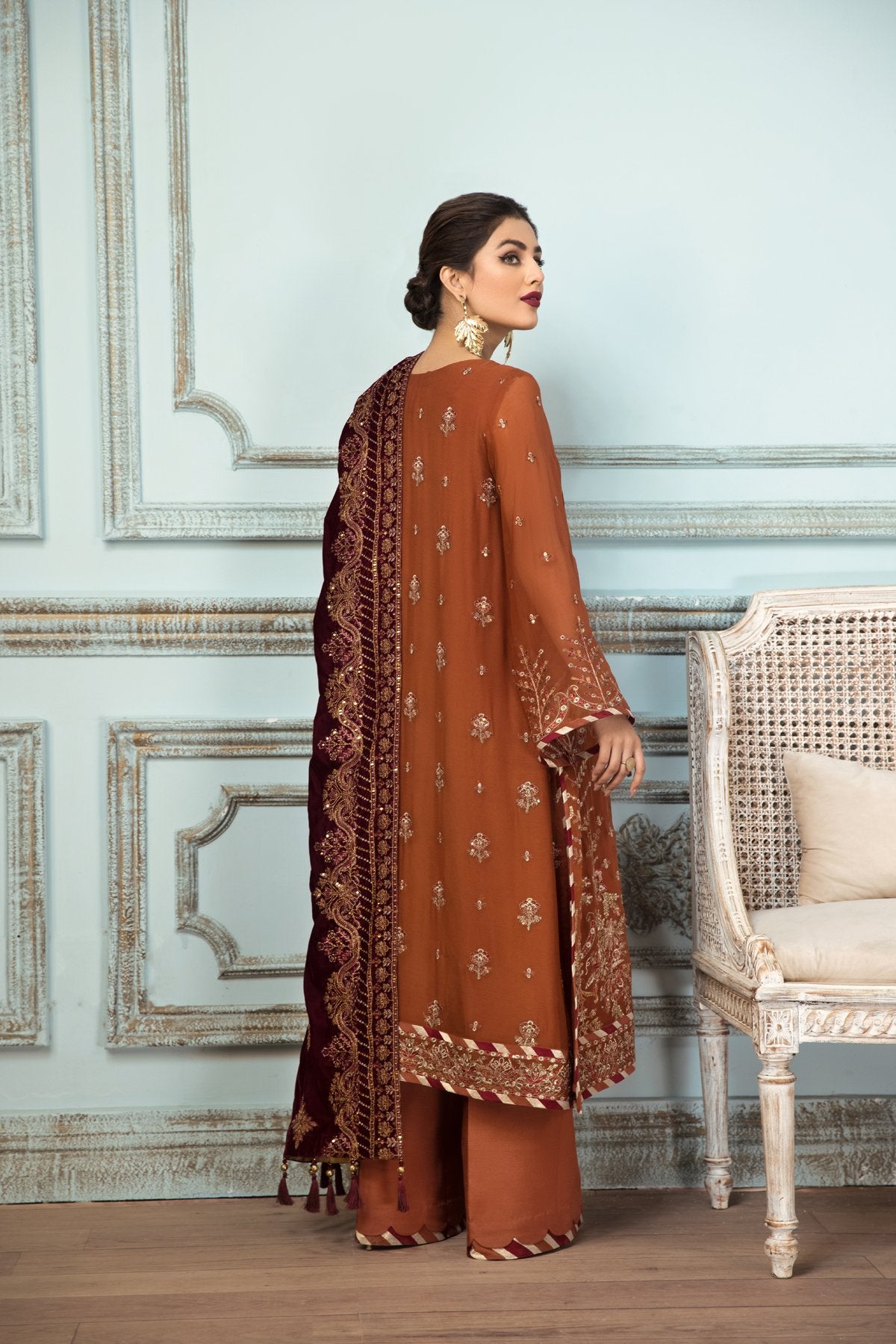 Fabric: Embroidered Chiffon Front Embroidered Chiffon Back Embroidered Chiffon Front + Back Body Embroidered Chiffon Front + Back Patch Embroidered Chiffon Sleeves Embroidered Micro Velvet 9000 Shawl Dyed Raw Silk Trouser |