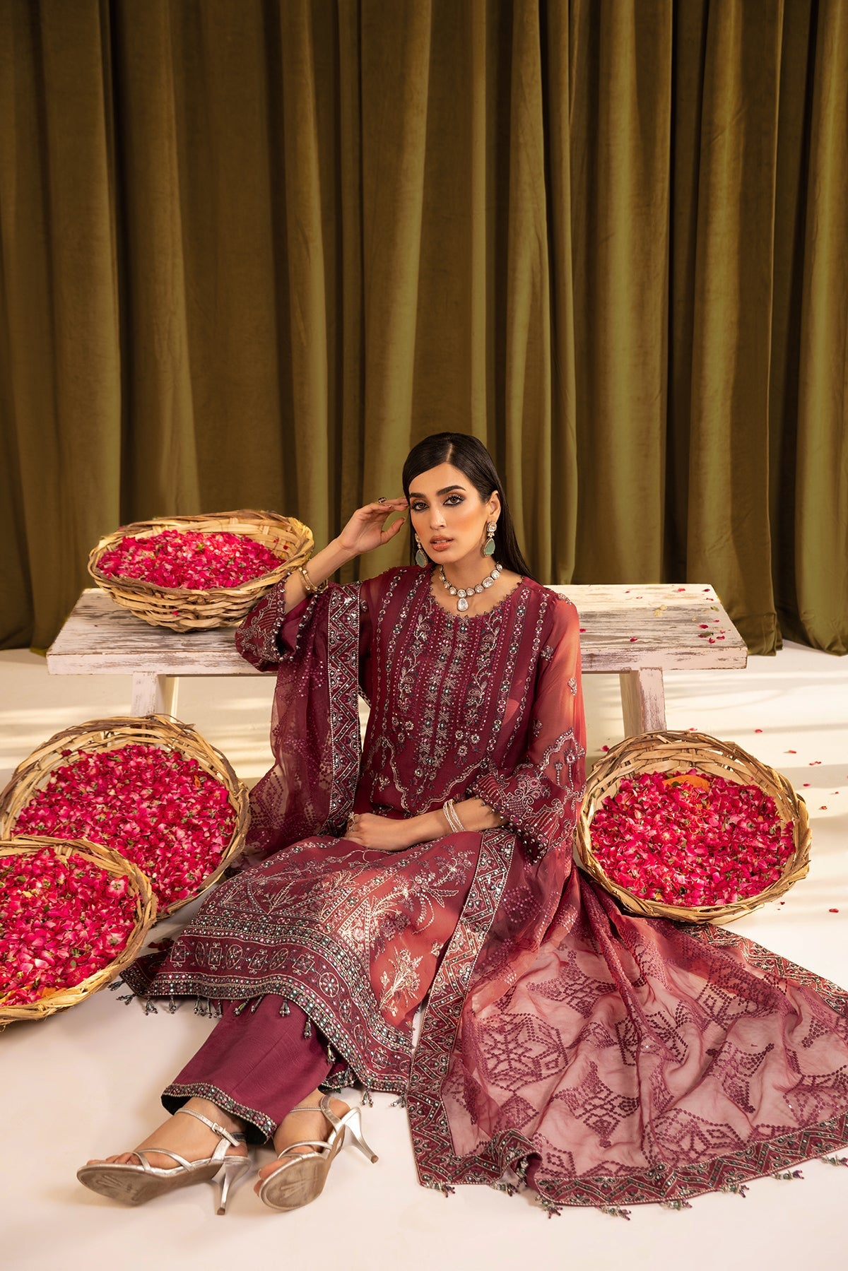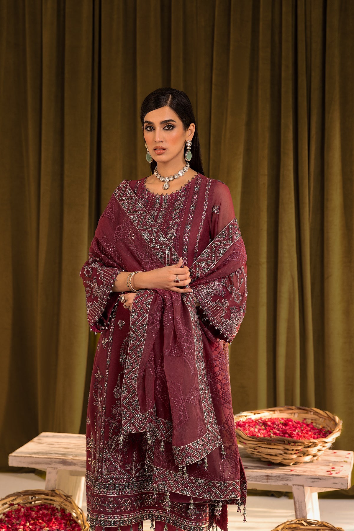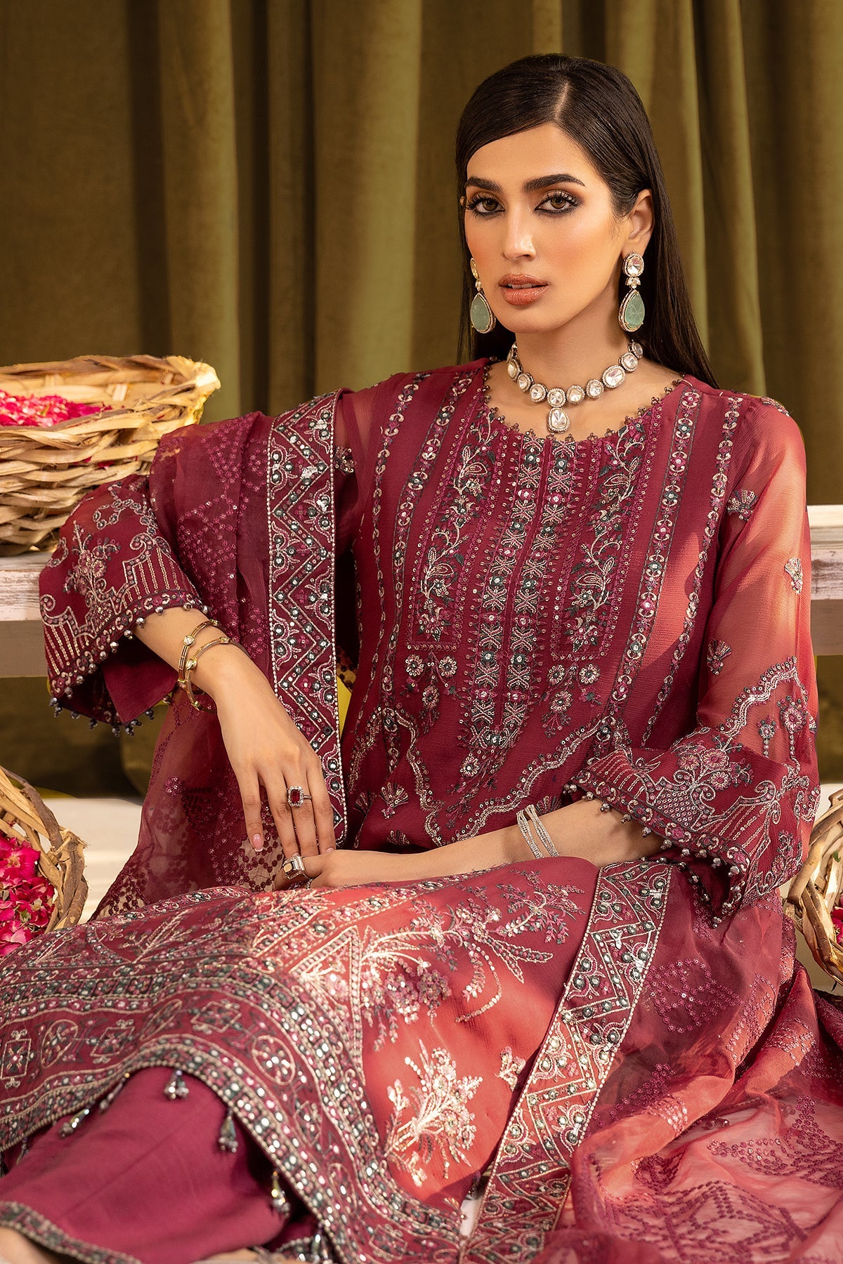 Fabric: Embroidered Chiffon Front Panel Embroidered Chiffon Right + Left Panel Embroidered Chiffon Back Embroidered Chiffon Sleeves Embroidered Front + Back Patch (2) Embroidered Organza Shawl Dyed Grip Trouser Embroidered Trouser Patch |