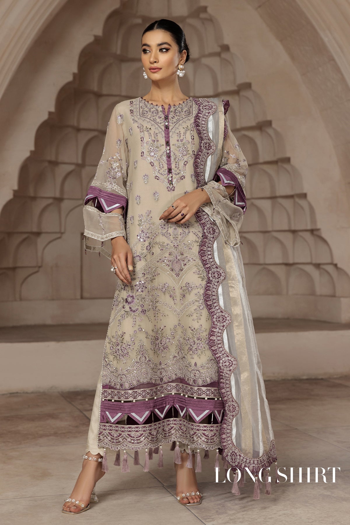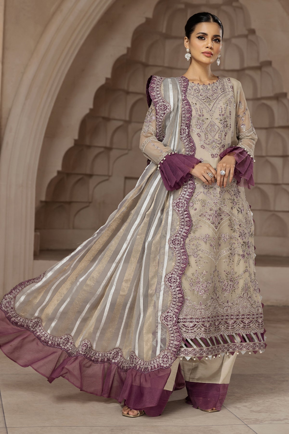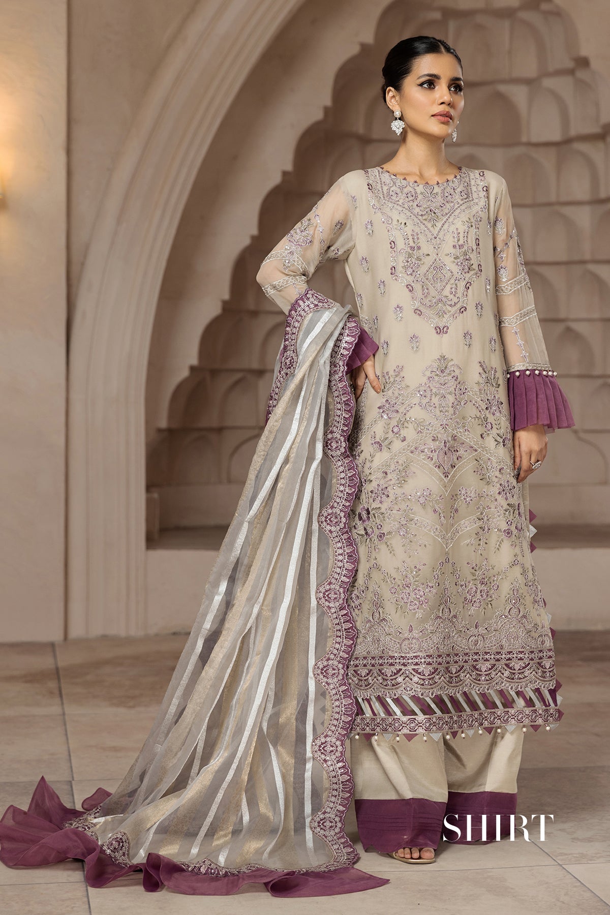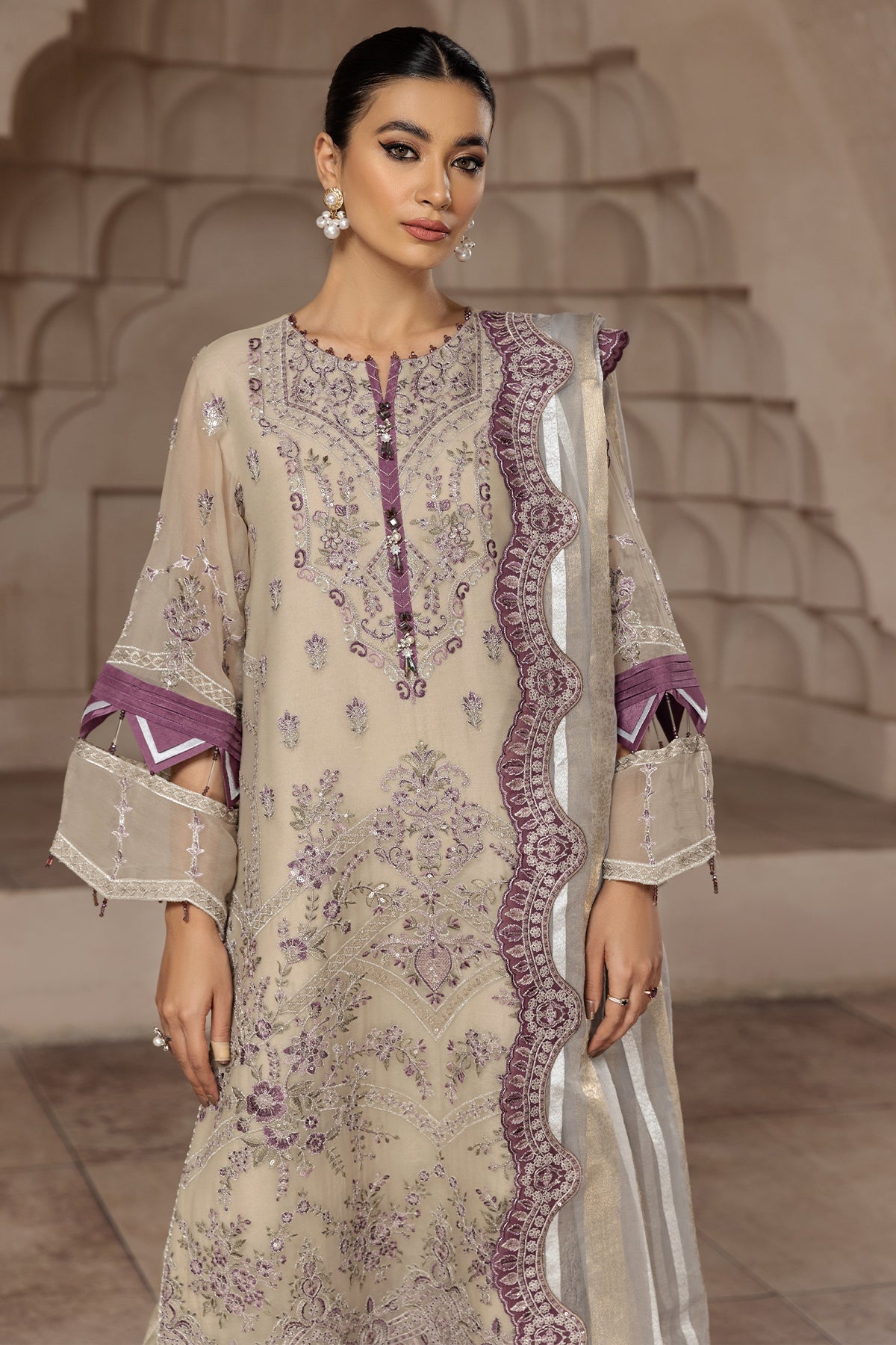 Fabric: Embroidered Chiffon Front Embroidered Chiffon Back Embroidered Chiffon Sleeves Embroidered Organza Front + Back Patch (2) Zari Organza Dupatta Embroidered Organza Dupatta Patch (1) Dyed Raw Silk Trouser |