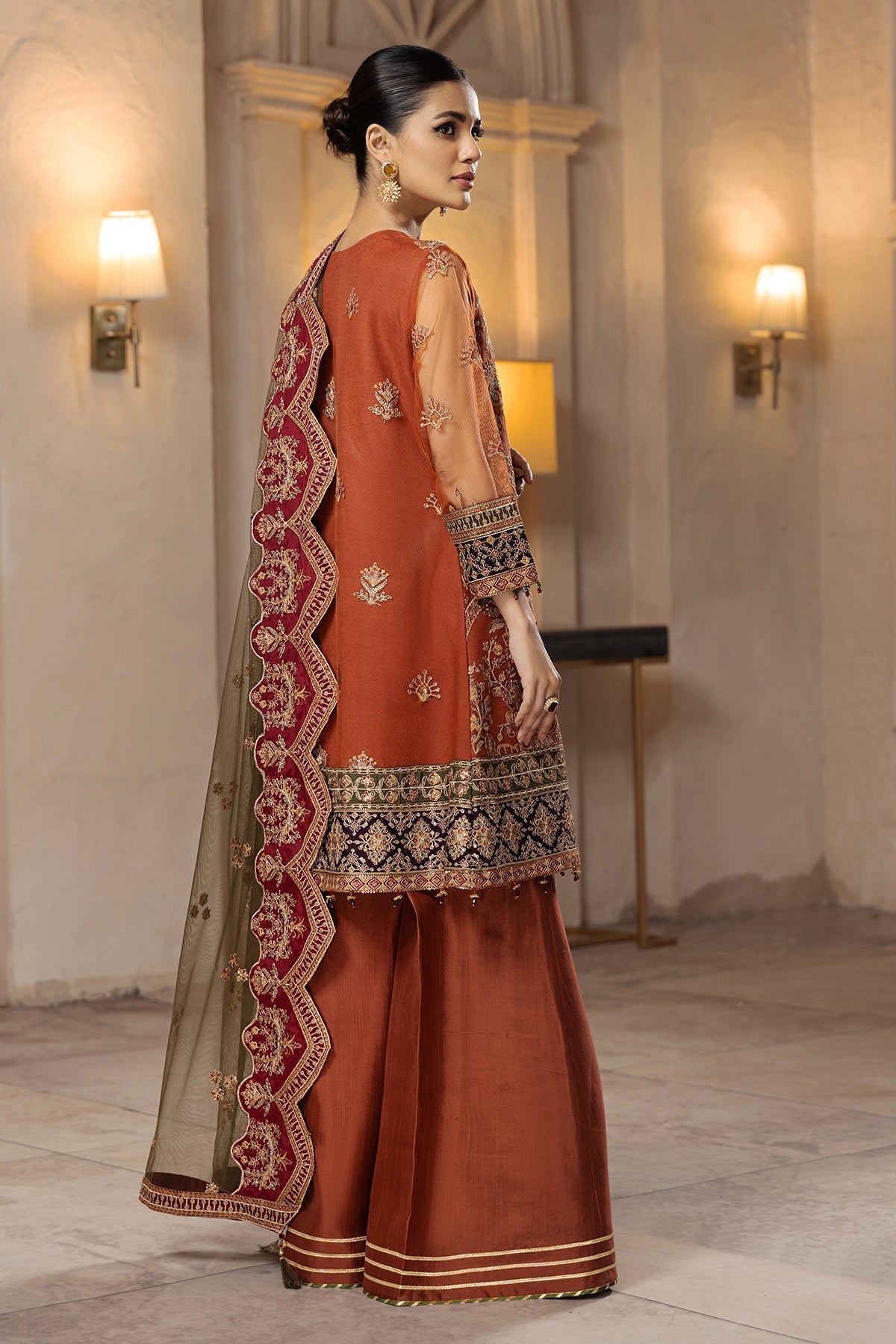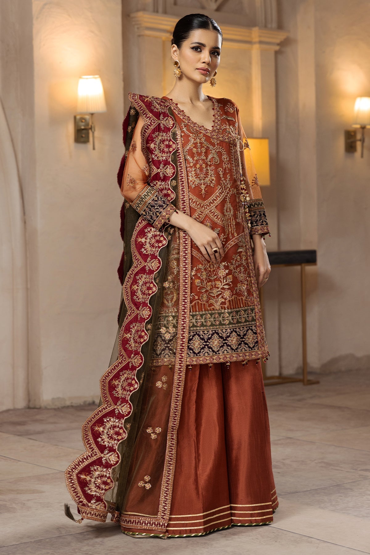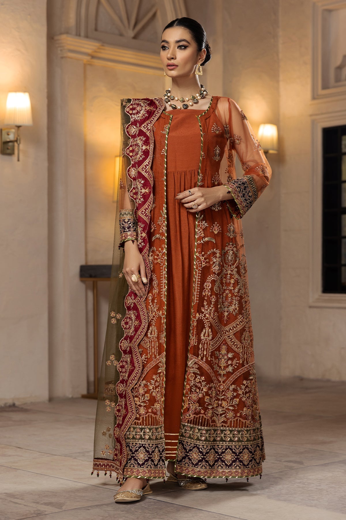 Fabric: Embroidered Net Front Embroidered Net Back Embroidered Net Sleeves Embroidered Net Front + Back Patch (3) Embroidered Net Dupatta Embroidered Grip Dupatta Patch (2) Embroidered Grip Sleeves Patch (3) Dyed Raw Silk Trouser |