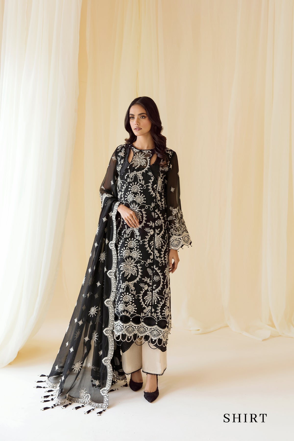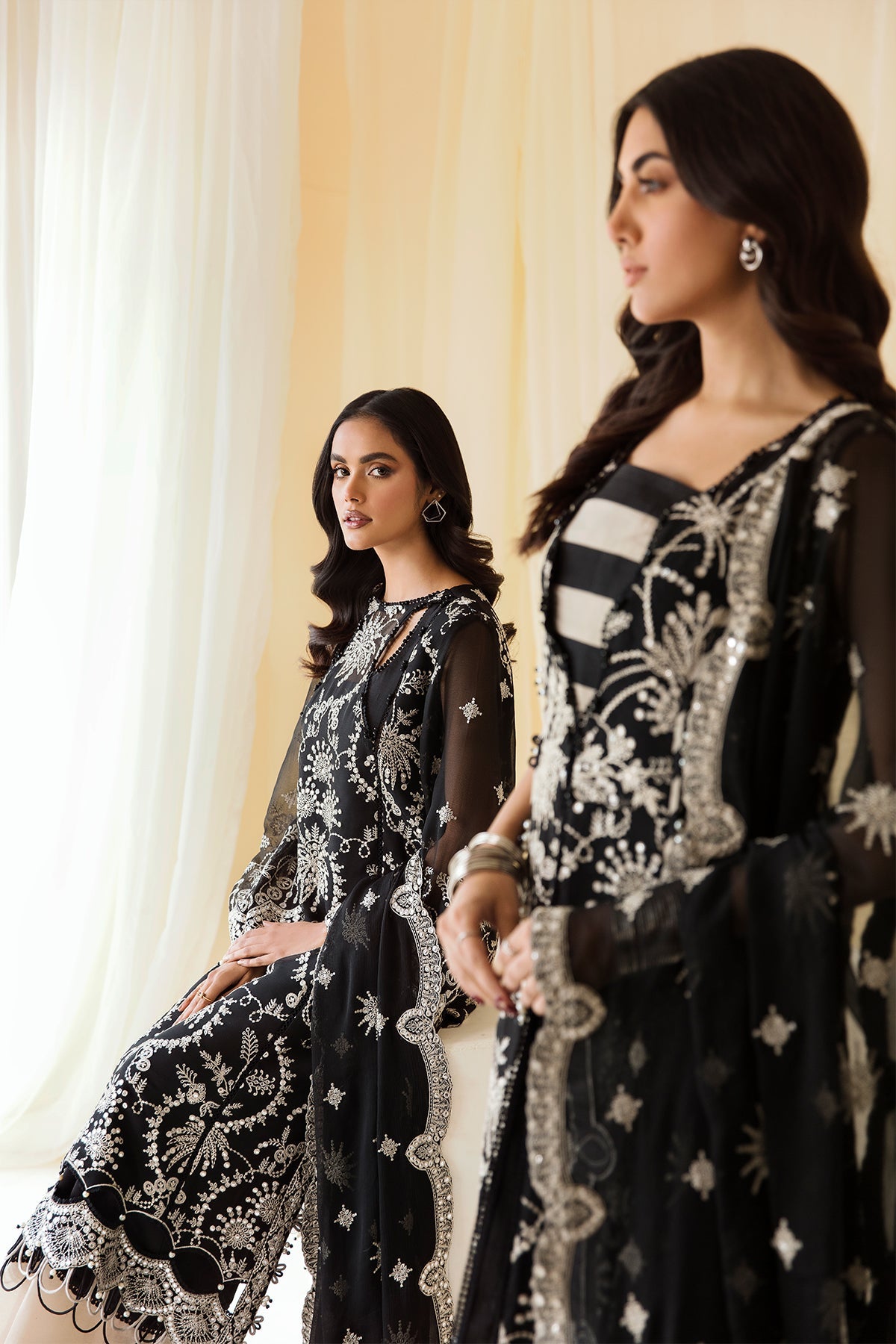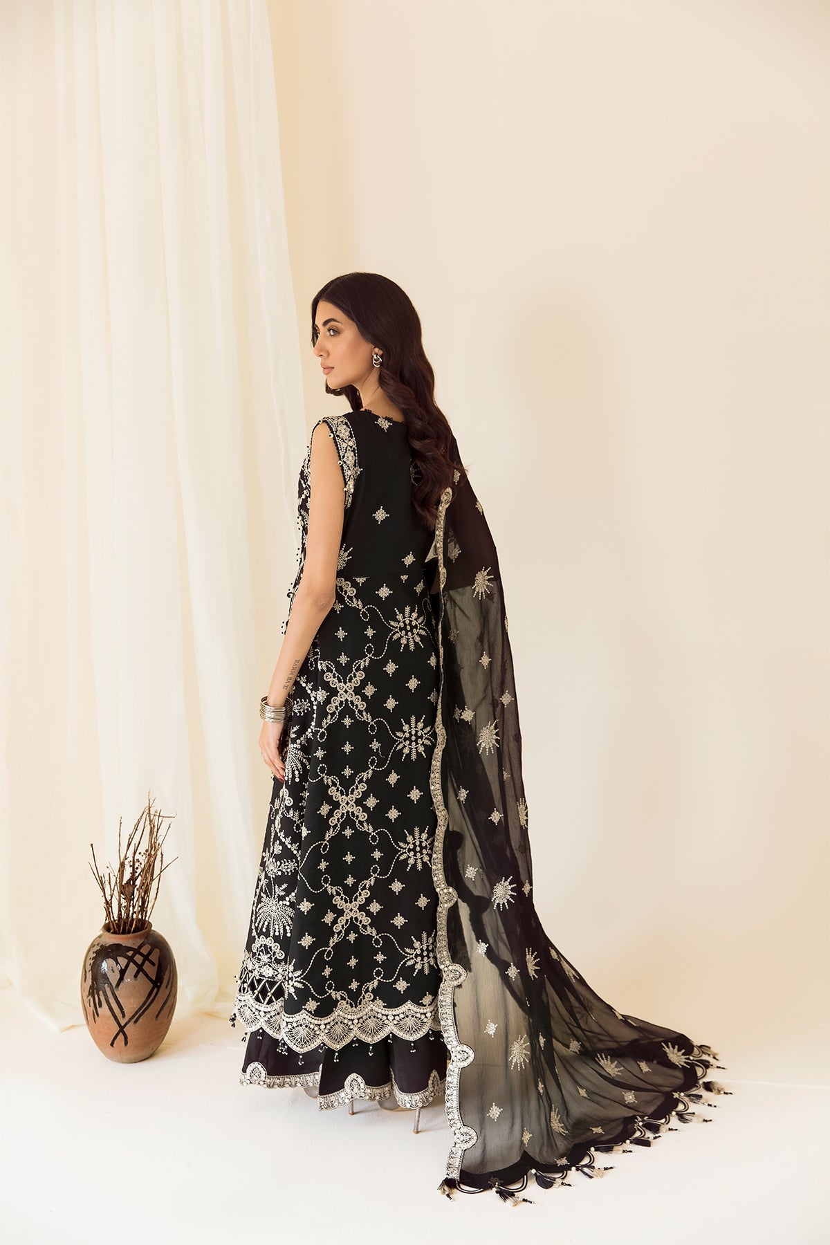 Fabric: Embroidered Chiffon Front Embroidered Chiffon Back Embroidered Chiffon Sleeves Embroidered Front + Back Body Embroidered Front + Back Patch (2) Embroidered Sleeves Patch Embroidered Chiffon Dupatta Dyed Raw Silk Trouser |