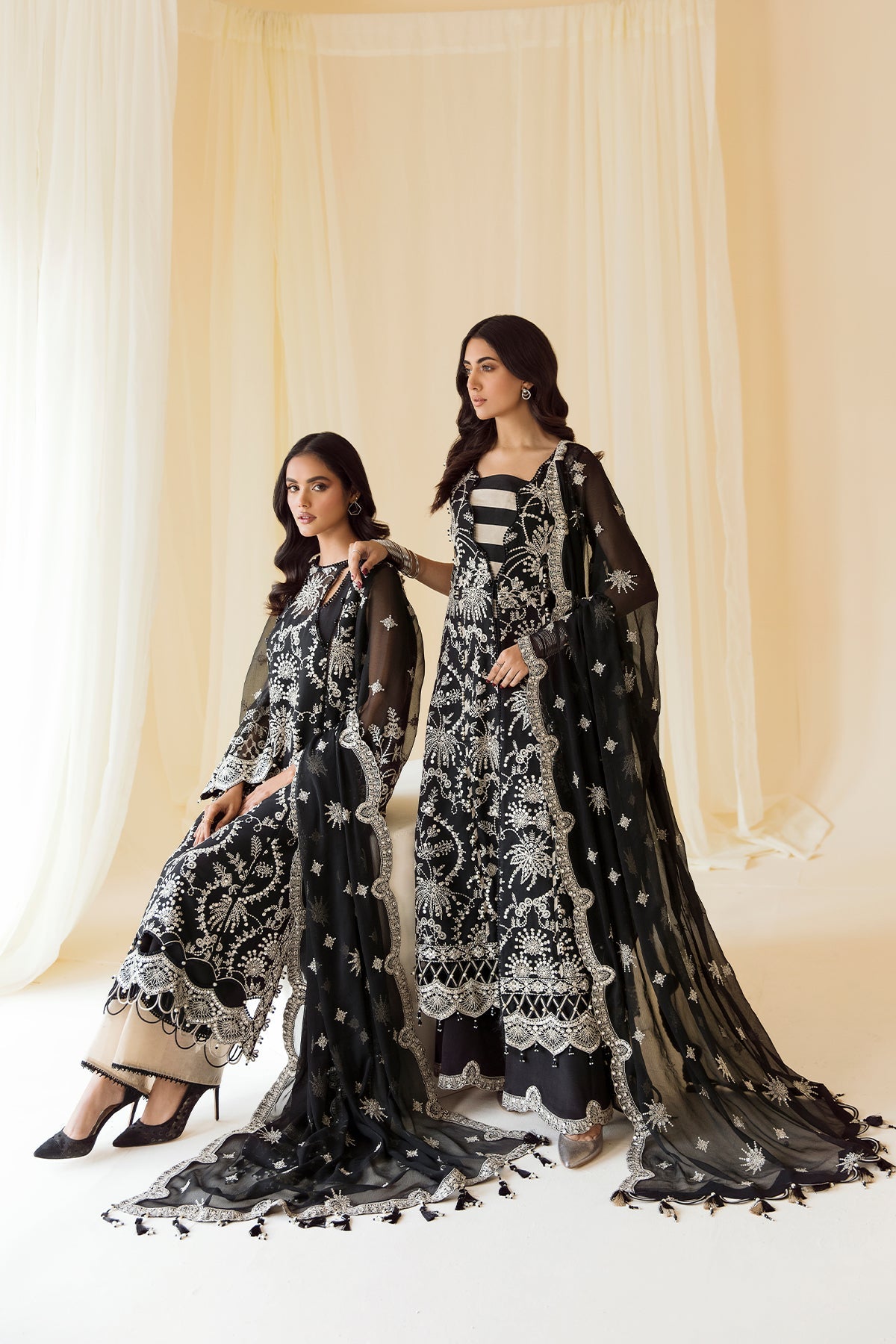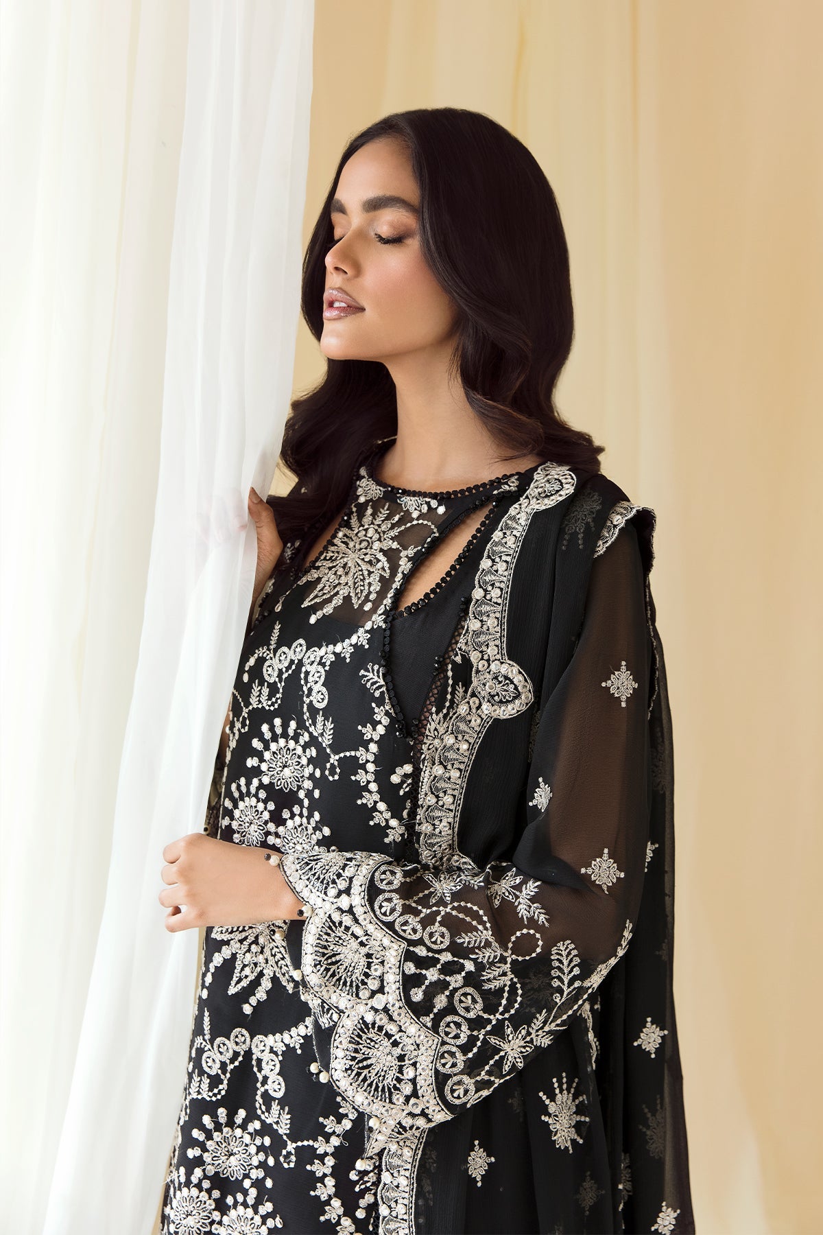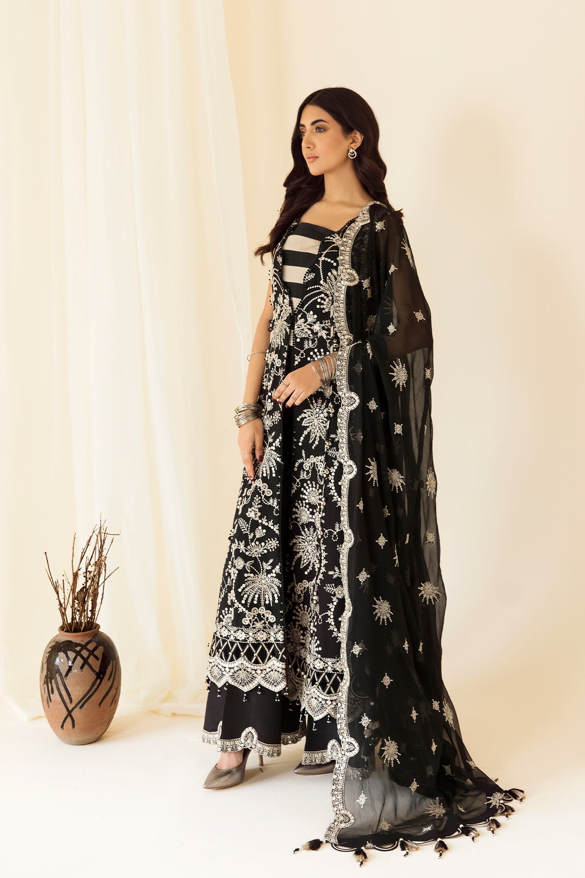 Fabric: Embroidered Chiffon Front Embroidered Chiffon Back Embroidered Chiffon Sleeves Embroidered Front + Back Body Embroidered Front + Back Patch (2) Embroidered Sleeves Patch Embroidered Chiffon Dupatta Dyed Raw Silk Trouser |