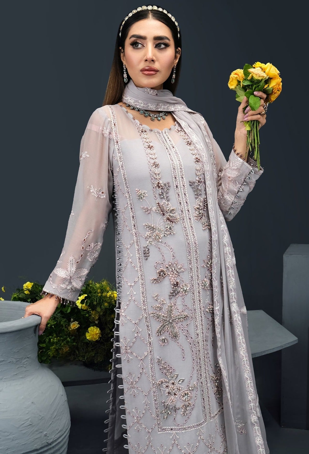 Summary: The Alizeh Reena Luxury Chiffon Formals in Asra-Reena-V01D01 presents an ethereal grey chiffon kameez, perfect for making a statement at your next formal event. This unstitched three-piece suit allows for custom tailoring to flatter your unique silhouette. The kameez is crafted from luxurious chiffon, offering a graceful drape and lightweight comfort. The delicate hand embellishments and embroidery work add a touch of opulence, creating a captivating interplay of textures and shimmer. The matching chiffon dupatta complements the kameez beautifully, while the raw silk trouser adds a rich contrast in texture, promising both comfort and style. This Pakistani suit offers a perfect blend of traditional elegance and contemporary design, making it an ideal choice for weddings, parties, or any special occasion where you want to exude sophistication and charm. This design comes as unstitched fabric, allowing you to personalize the fit and style to your preference. Experience the luxury of Alizeh with this stunning ensemble, guaranteed to make you feel like royalty.