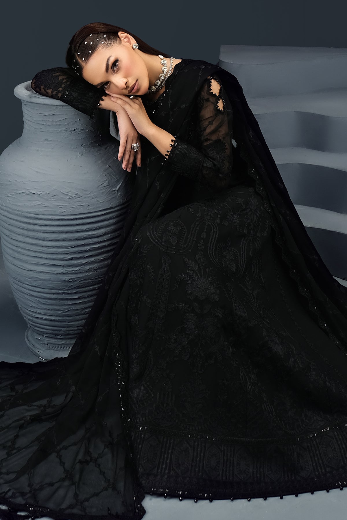 Fabric: Embroidered Hand Embellished Chiffon Front Body Embroidered Chiffon Back Body Embroidered Chiffon Front Kali (5) Embroidered Chiffon Back Kali (5) Embroidered Front & Back Daman Patch (2) Embroidered Chiffon Sleeves Embroidered Sleeves Patch (2) Embroidered Belt Patti Embroidered Chiffon Dupatta Dyed Grip Trouser |