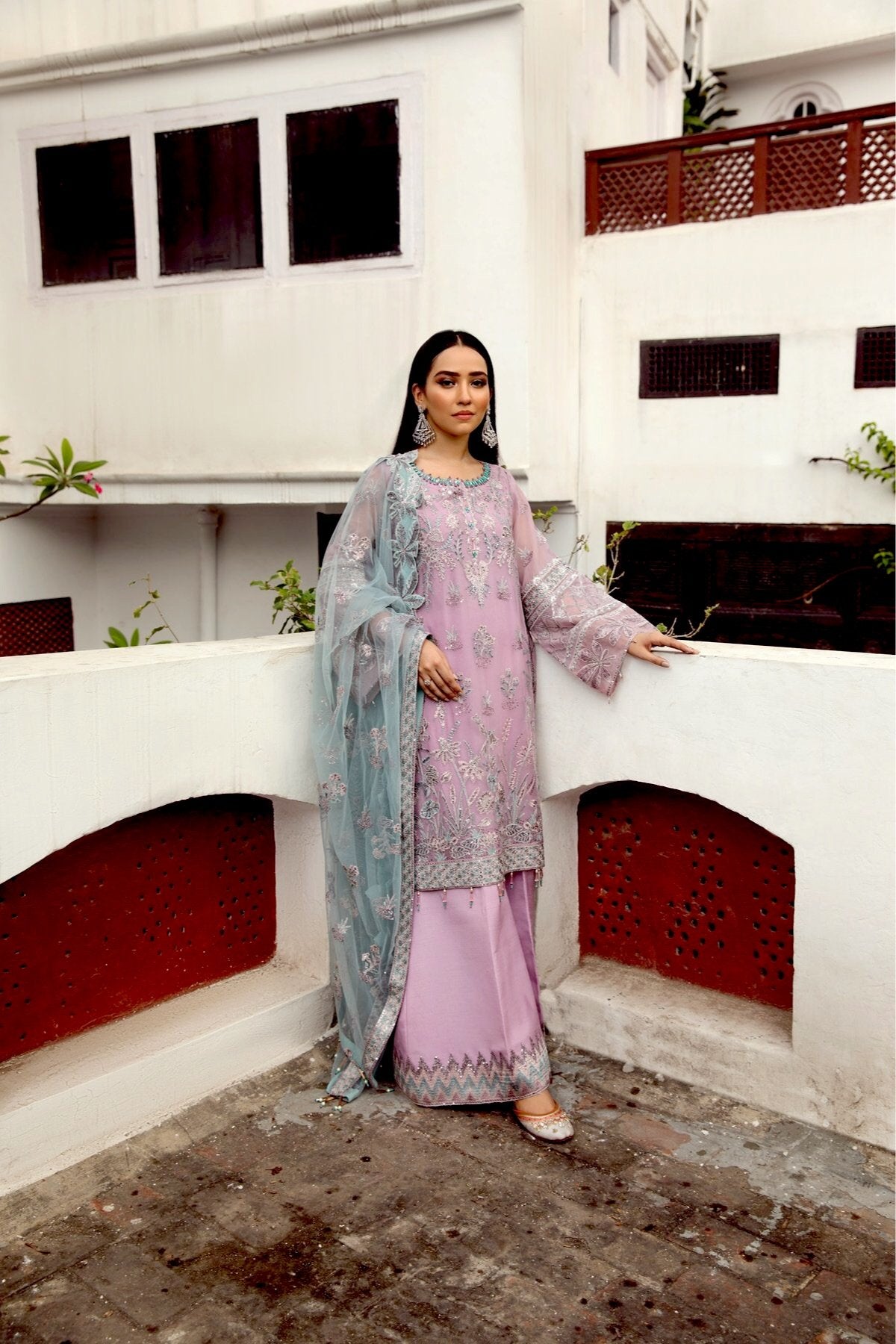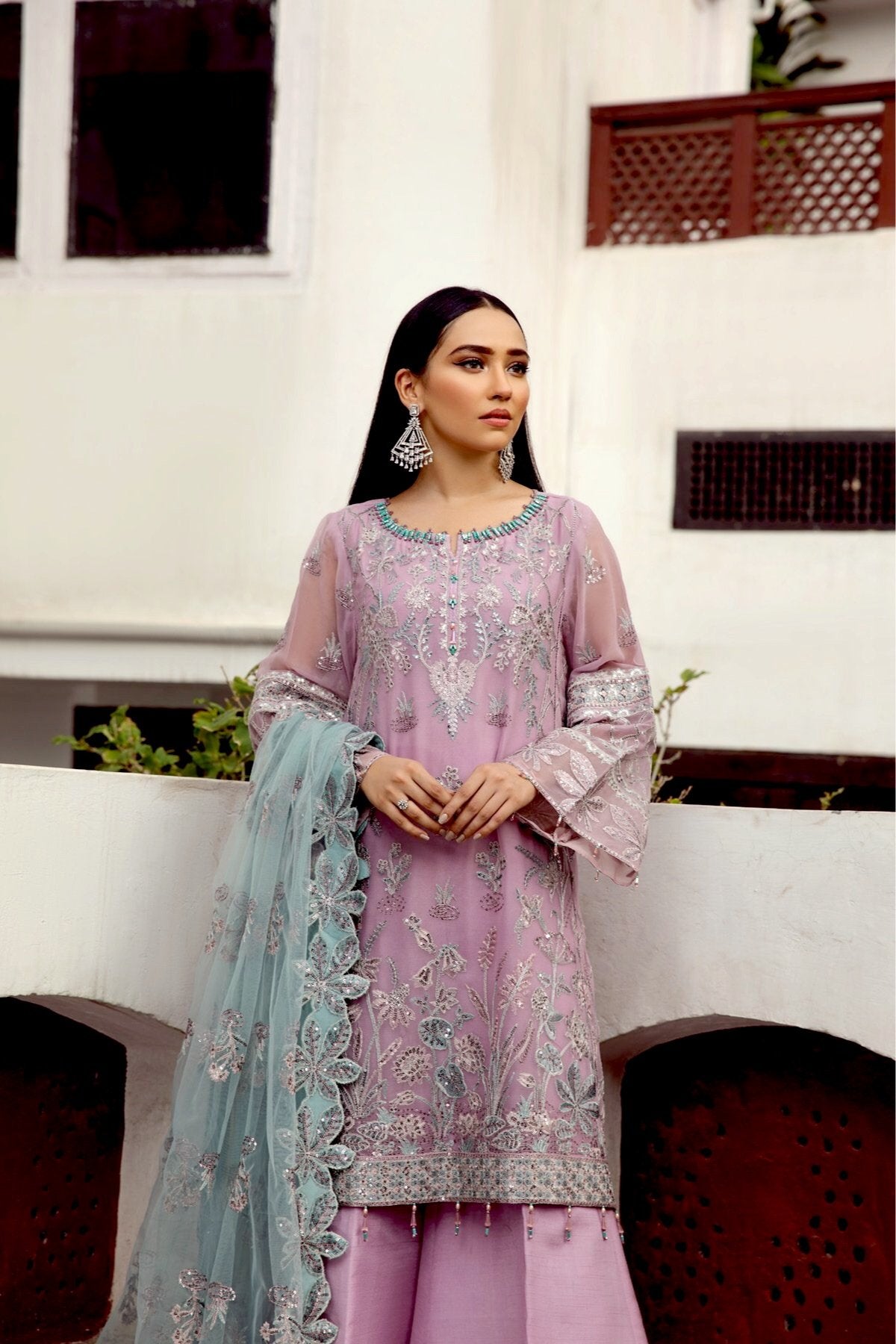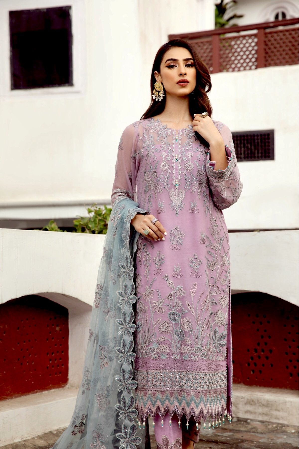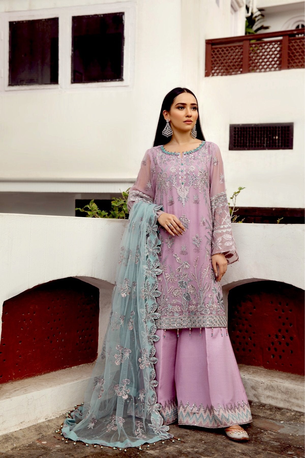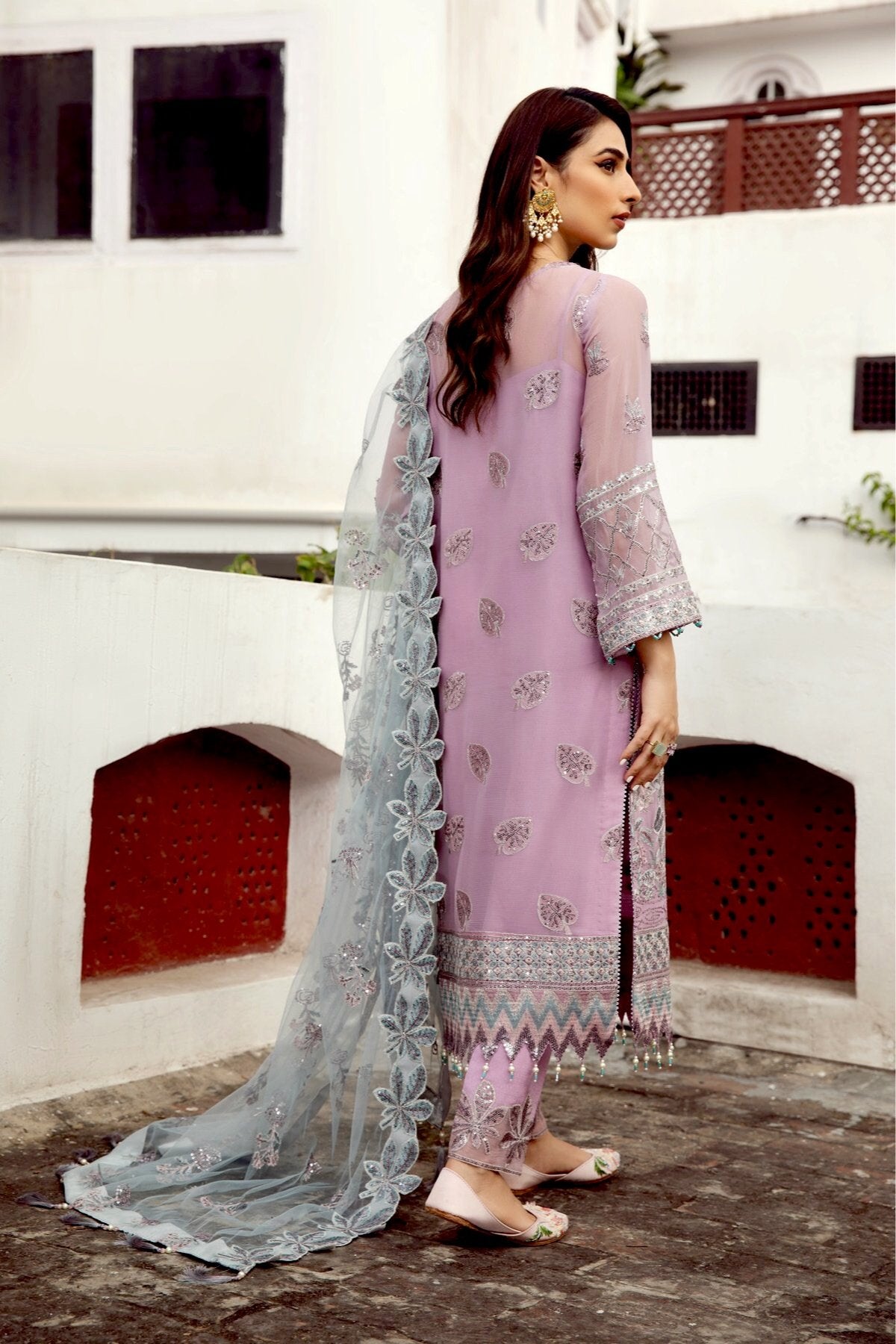Fabric: Embroidered Chiffon Front Kali Embroidered Chiffon Back Kali Embroidered Chiffon Front Body Embroidered Chiffon Back Body Embroidered Chiffon Sleeves Embroidered Chiffon Belt Patch Embroidered Chiffon Front + Back Patch Embroidered Chiffon Dupatta Embroidered Chiffon Dupatta Patch Dyed Raw Silk Trouser |