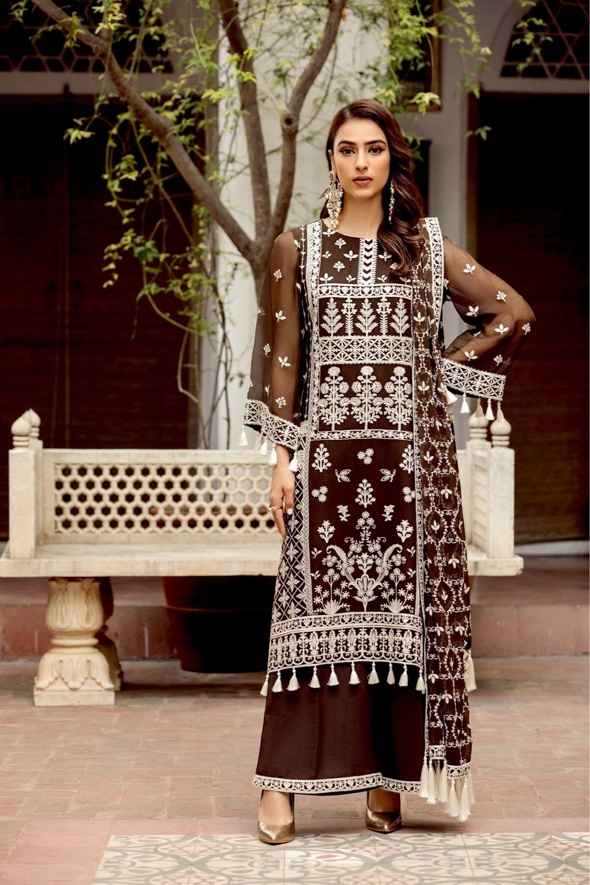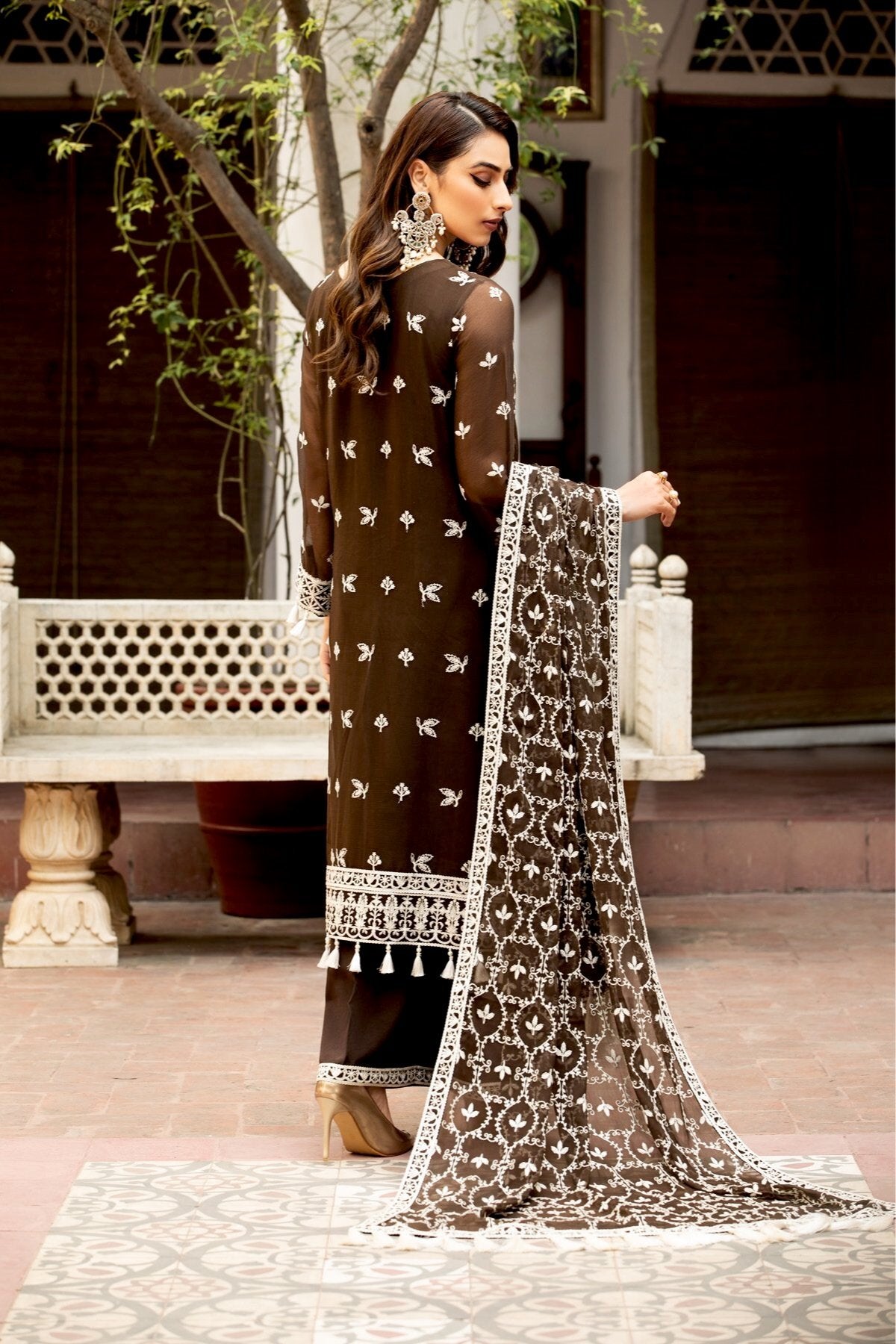 Fabric: Embroidered Chiffon Front Embroidered Chiffon Back Embroidered Chiffon Front + Back Body Embroidered Chiffon Sleeves Embroidered Front + Back Patch 2 Embroidered Sleeves Patch 2 Tissue Zari Dupatta Dyed Slub Trouser |