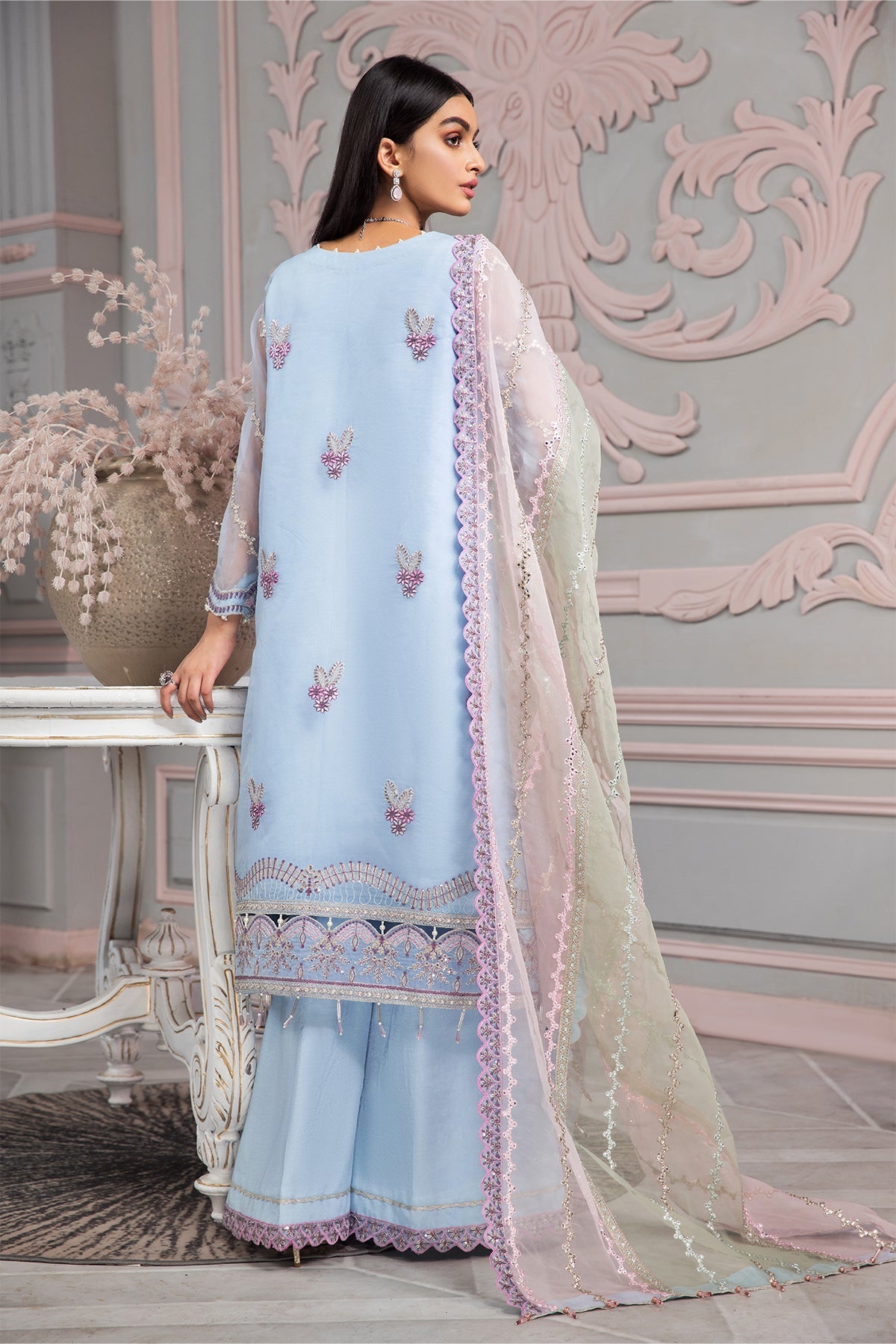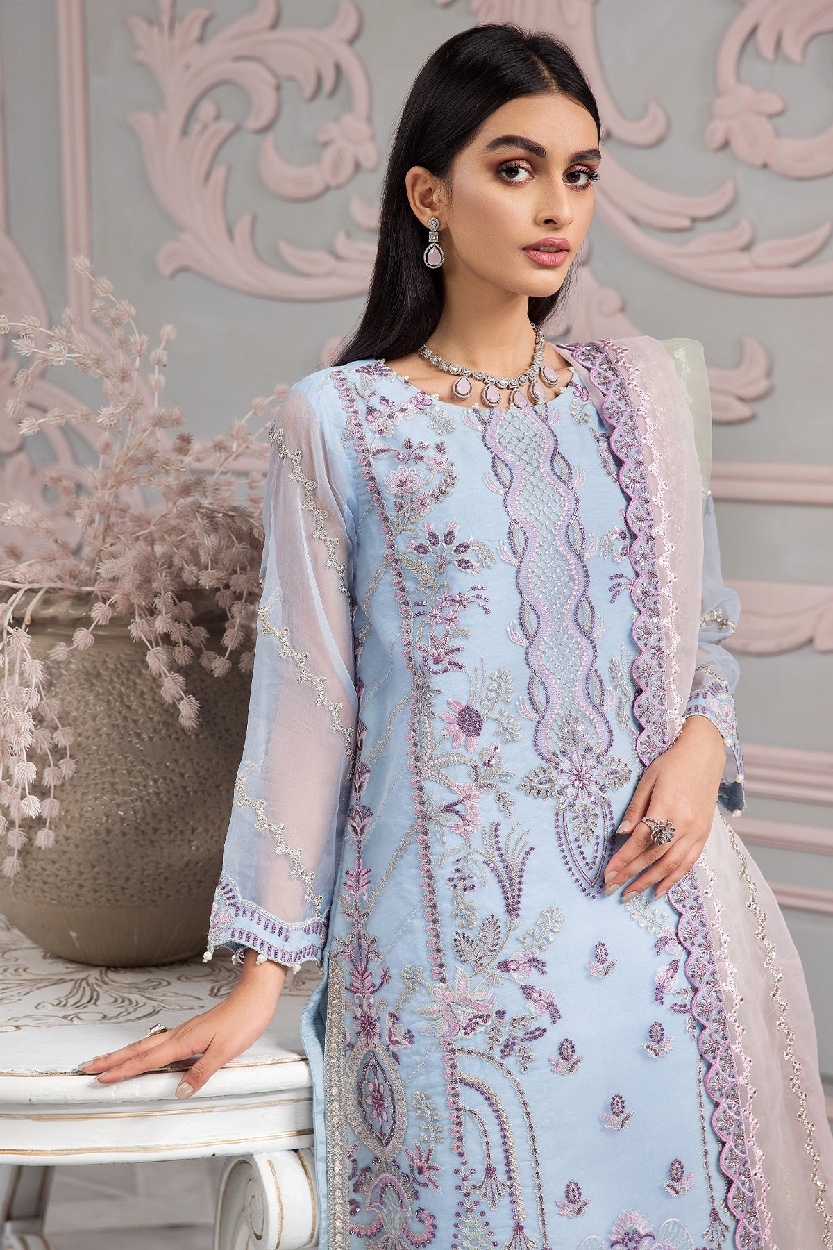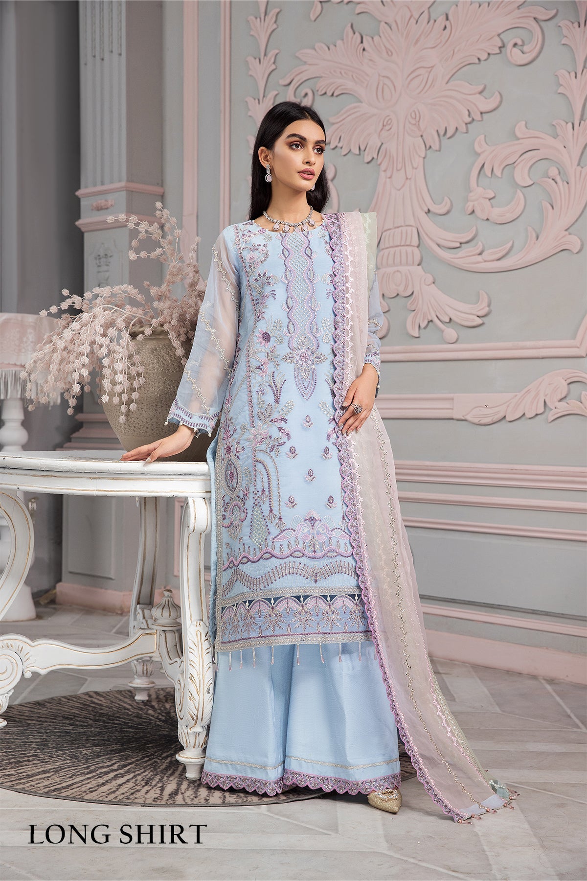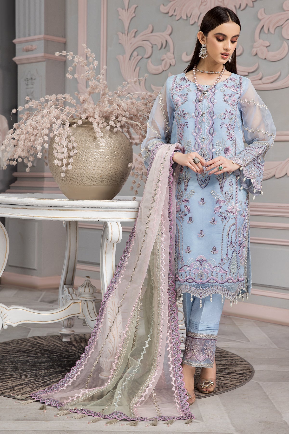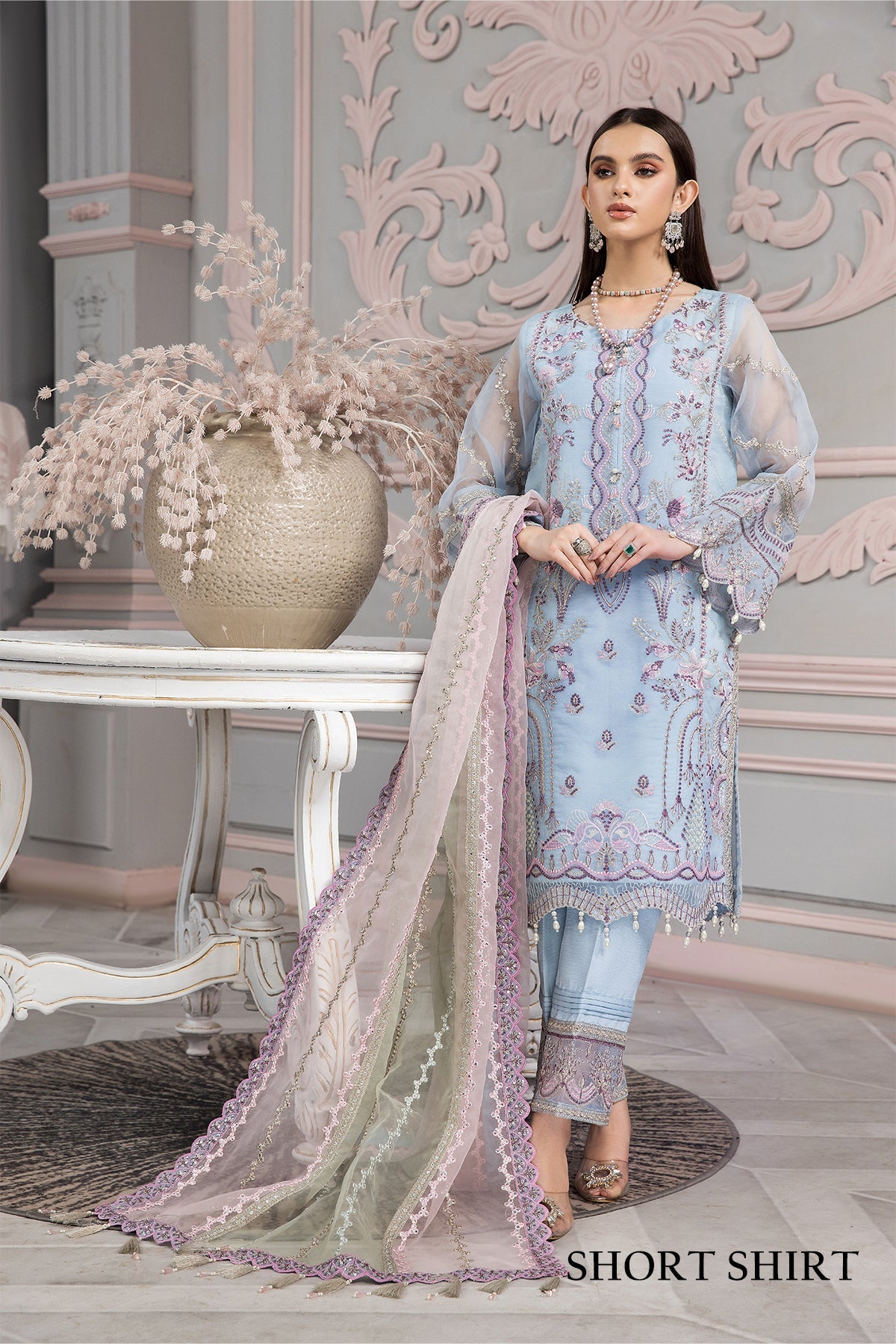 Fabric: Embroidered Organza Front Embroidered Organza Back Embroidered Organza Sleeves Embroidered Organza Dupatta Embroidered Front + Back Patch (2) Embroidered Sleeves Patch Embroidered Dupatta Patch Dyed Raw Silk Trouser |