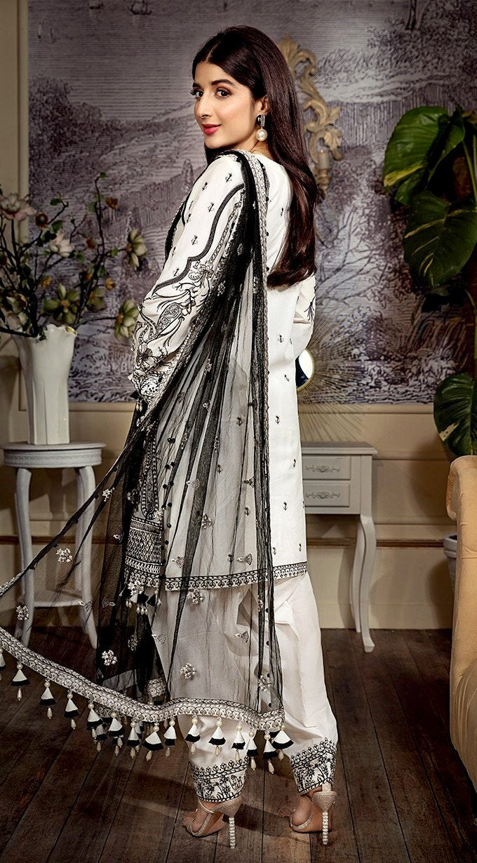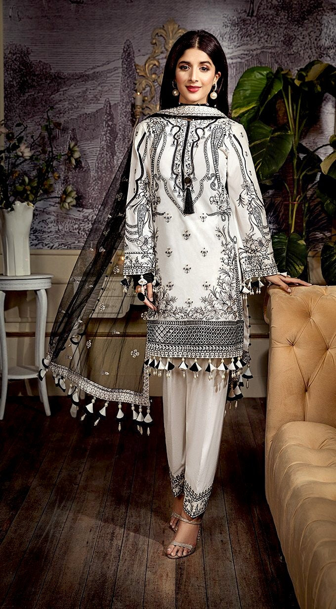 Fabric: Embroidered Lawn Shirt Front 1M Embroidered Lawn Shirt Back 1M Embroidered Lawn Sleeves 0.67M Embroidered Sleeves Border2PCS Embroidered Front & Back Shirt Hem Border 1.52M Embroidered Net Dupatta 2.5M Embroidered Dupatta Border 4 Sided 8M Dyed Cotton Cambric Trouser 2.5M Embroidered Trouser Patch 2PCS