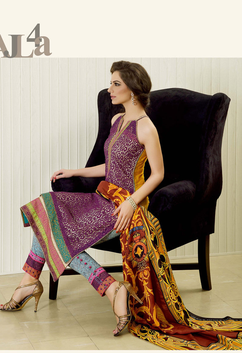 Feel like ultimate royalty in AJL4A Purple! This Design features an elegant lace front, printed slip with Gold Dust borders, a printed back and trousers with lace sleeves and a majestic Silk Dupatta.