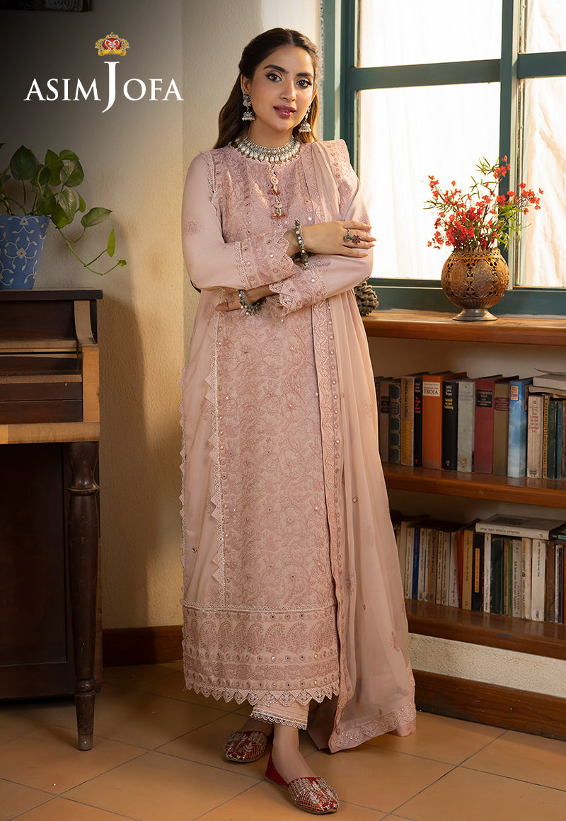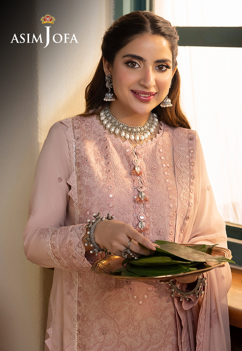 Fabric: Evoke the whispers of tradition with our ""Shadow Work"" collection, where tea pink hues become a canvas of elegance. Saboor Aly graces this ensemble, embodying the grace of threadwork that carve the shirt in intricate beauty. The Lockwood liberty embroidery is a homage to heritage, graces the shirt, while paisley elements twirl along the borders, like echoes from the past. Sequins twinkle like memories, adorning the dupatta's borders and the neckline and sleeves, creates an ensemble that's a fusion of tradition and style. Step into a world where threads carry the whispers of tea pink elegance. DESIGN DETAILS: Embroidered center panel on lawn silk 1.25 meter embroidered chan for back & right left side panels on lawn silk Pair of embroidered sleeves with border on lawn silk 30'' embroidered border for front daman on lawn silk 2.5 meter embroidered dupatta on chiffon 1.5 meter dyed lawn silk for trouser |