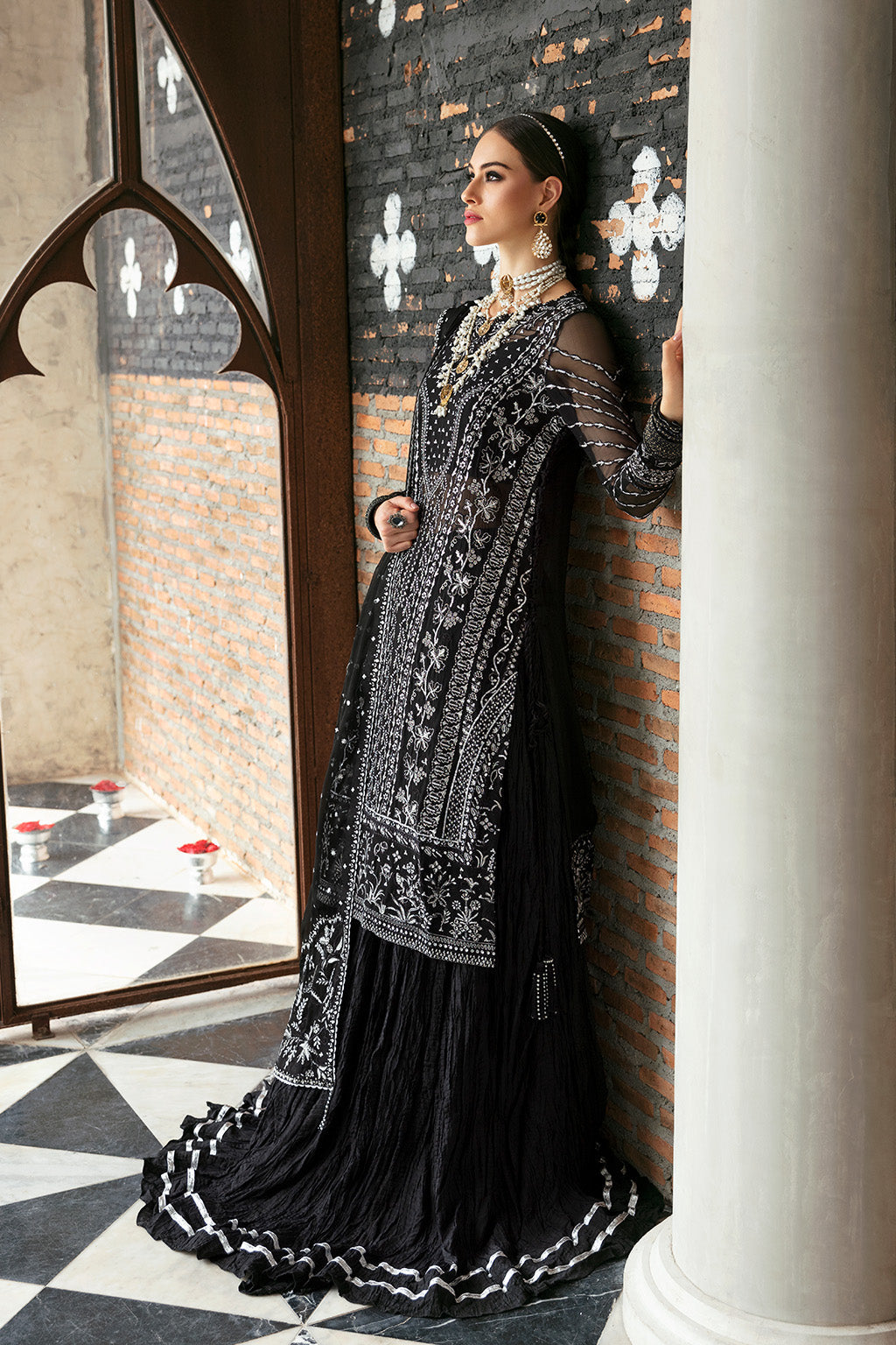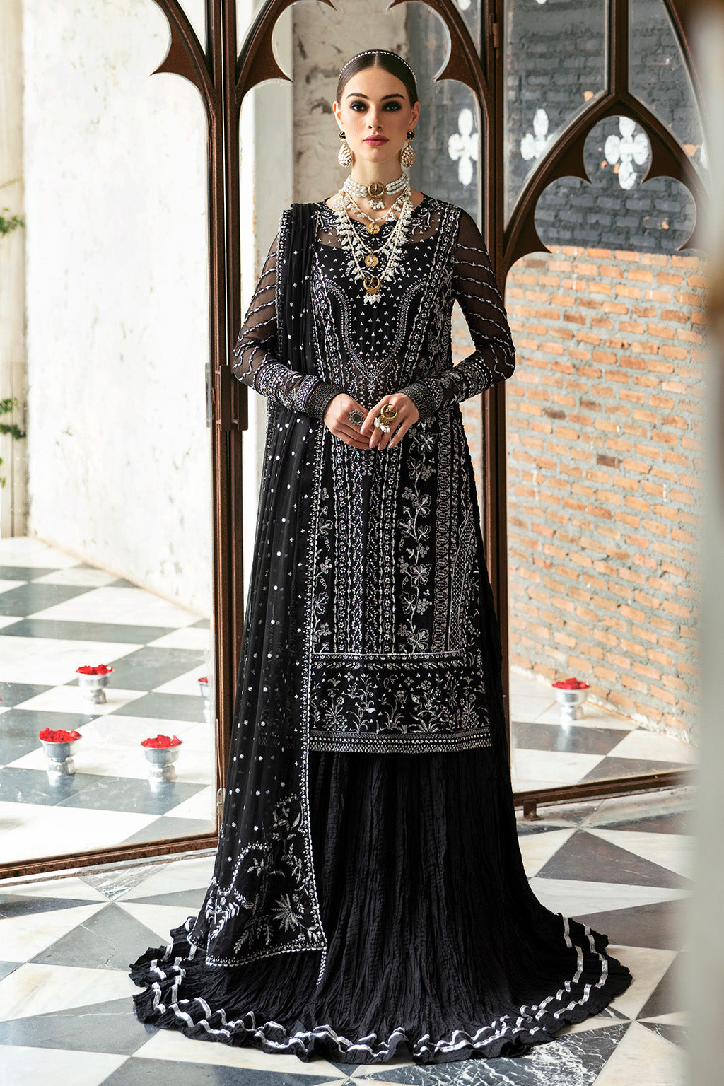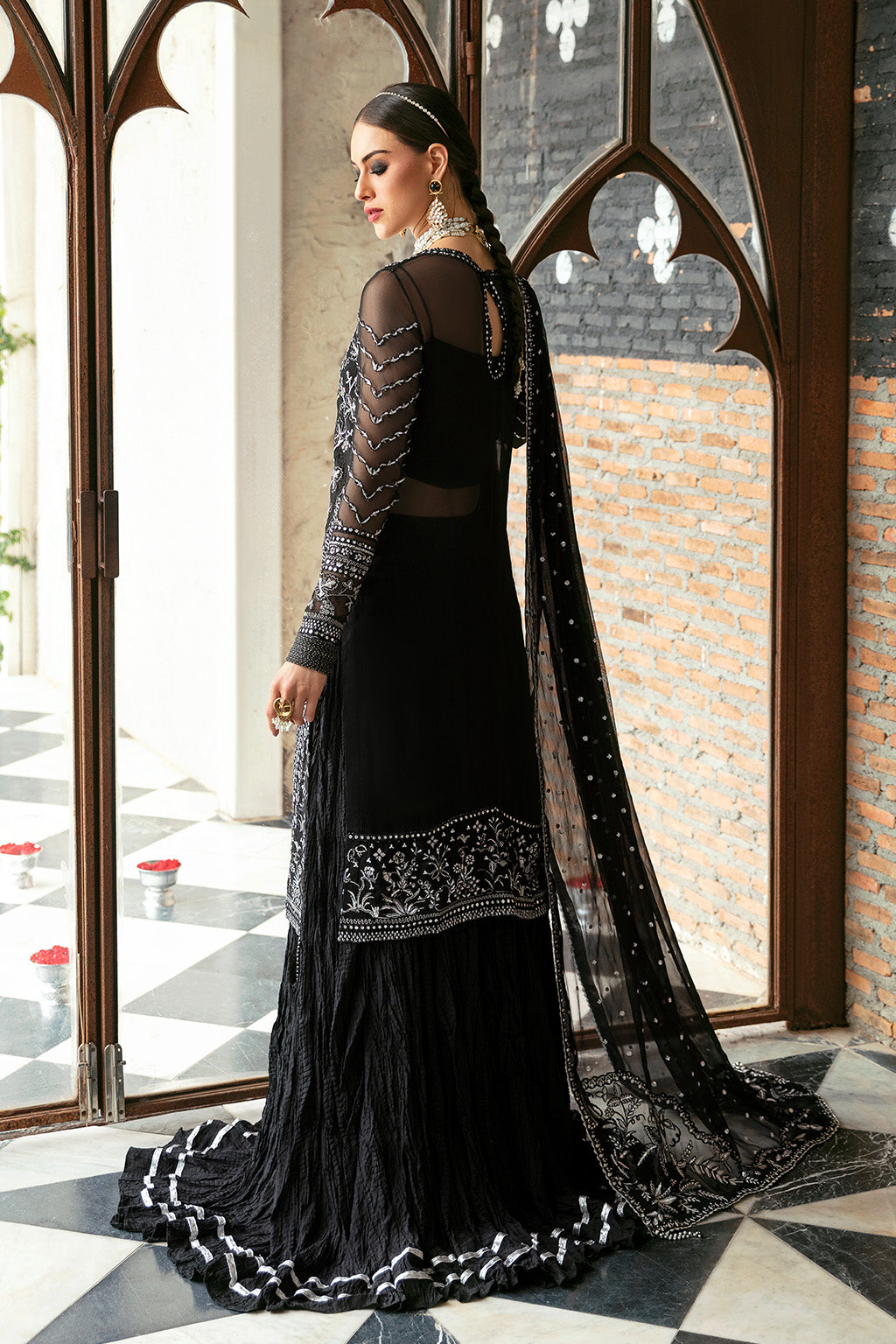 Fabric: Chiffon Embroidered Front (1 Pc) Chiffon Dyed Back (1 Pc) Organza Embroidered Front+Back Border (1.97 M) Chiffon Embroidered Sleeves (0.66 M) Organza Embroidered Sleeves Border (0.98 M) Chiffon Embroidered Dupatta (2.62 M) Organza Embroidered Dupatta Pallu Border (2 Pcs) Raw Silk Dyed Trouser (2.28 M) |