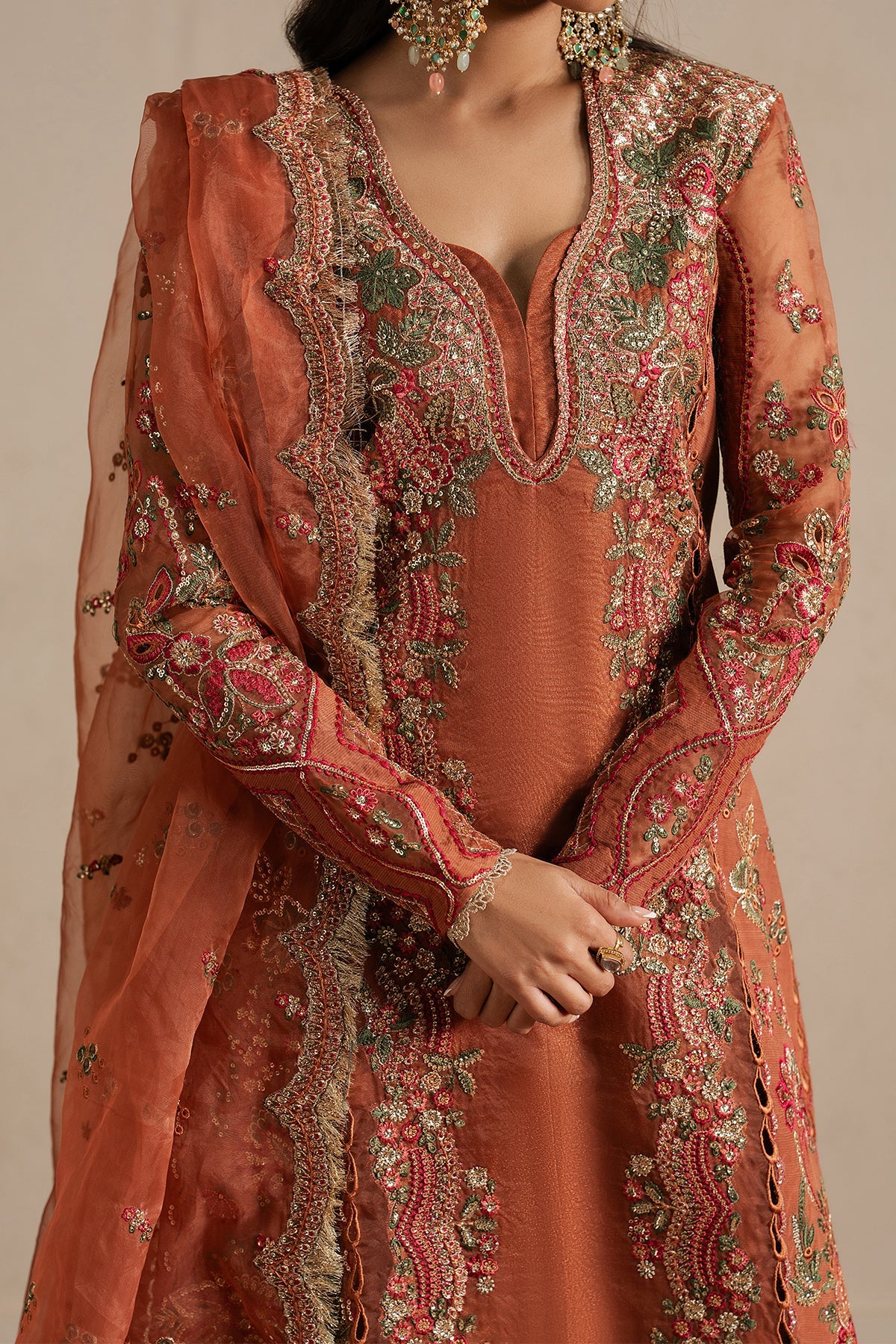 Summary: Radiate timeless elegance with the 'Sahaara' ensemble by Ayzel, a captivating piece from the Qurbat Silk Festive collection. This rust orange Pakistani suit is crafted from luxurious Raw Silk, featuring an intricate Organza center panel and heavy embroidery that exudes opulence. The unstitched dress material includes a matching Organza dupatta adorned with tissue Zari borders, adding a regal touch to the silhouette. Ideal for wedding guests and formal celebrations, this silk outfit blends traditional artistry with contemporary grace. Elevate your festive wardrobe with this stunning rust color, perfect for making a sophisticated statement at evening events. Shop this exquisite Pakistani dress online for a look of sheer luxury.