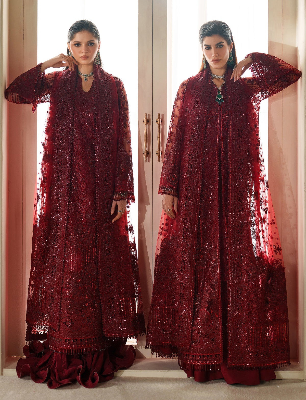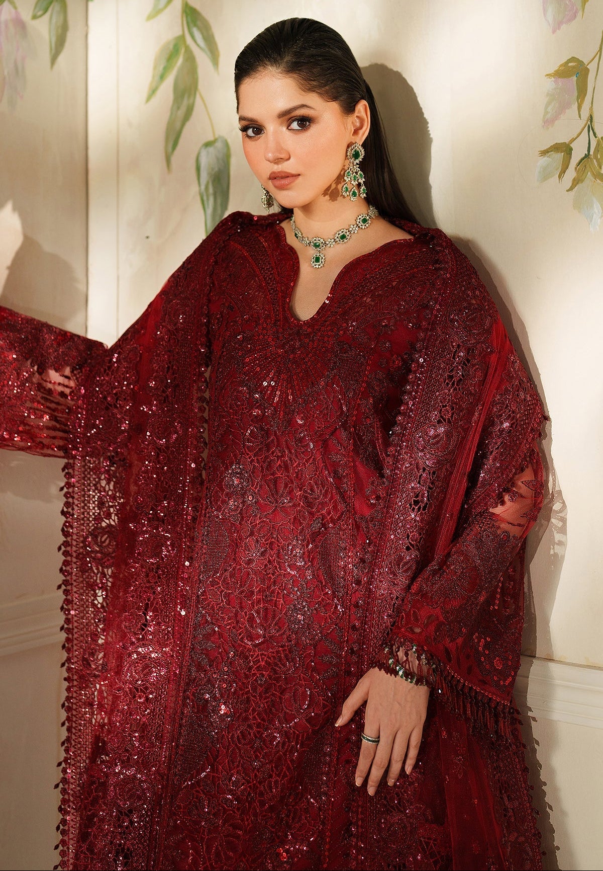 Summary: Embrace regal elegance with this stunning Maroon Pakistani suit from the Baroque Chantelle collection. Crafted from delicate net fabric, this ensemble is perfect for Spring/Summer festivities. The long shirt is a masterpiece of design, featuring intricate same-tone embroidery, shimmering tilla, and sparkling sequins meticulously applied with handwork. The rich maroon hue makes this ethnic wear a quintessential choice for grand celebrations, particularly as a wedding formal or bridal wear. This luxurious Pakistani dress offers a timeless, regal finish, ensuring you stand out at any high-end event. Ideal for those looking to buy an exquisite wedding outfit.