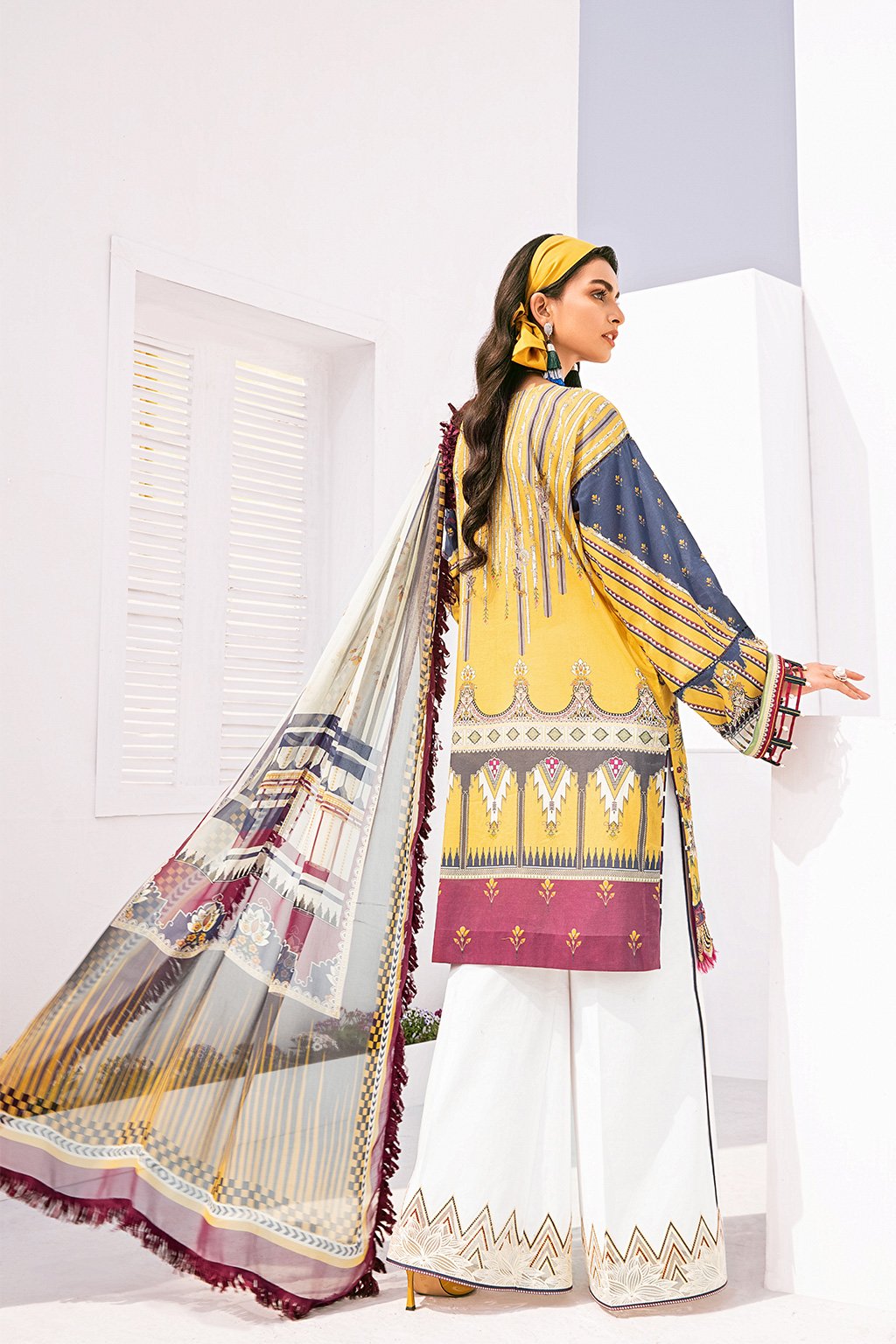 Fabric: Embroidered Lawn Front Embroidered Lawn Side Panel Digital Printed Lawn Back+Sleeves Embroidered Neckline Patch Embroidered Front Patches (2) Embroidered Trousers Patch Digital Printed Chiffon Dupatta Dyed Cambric Lawn Trouser |
