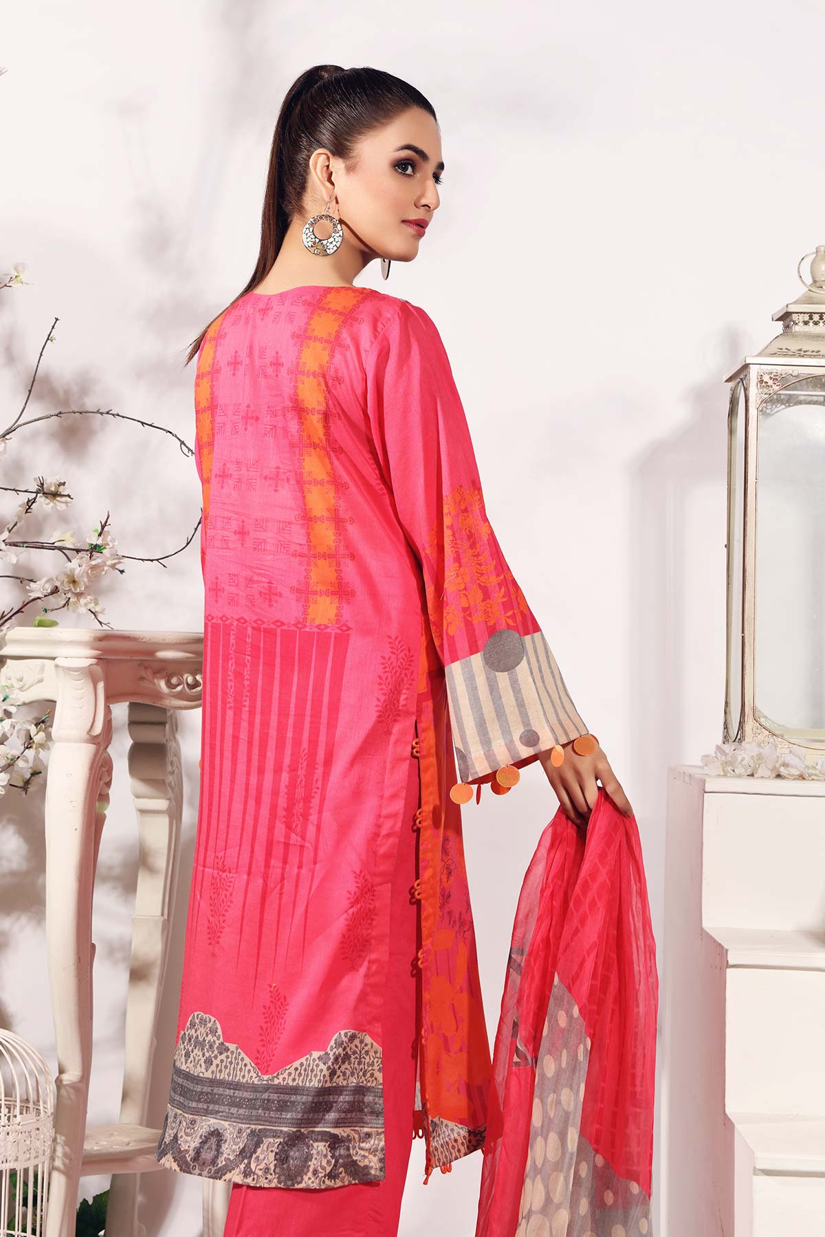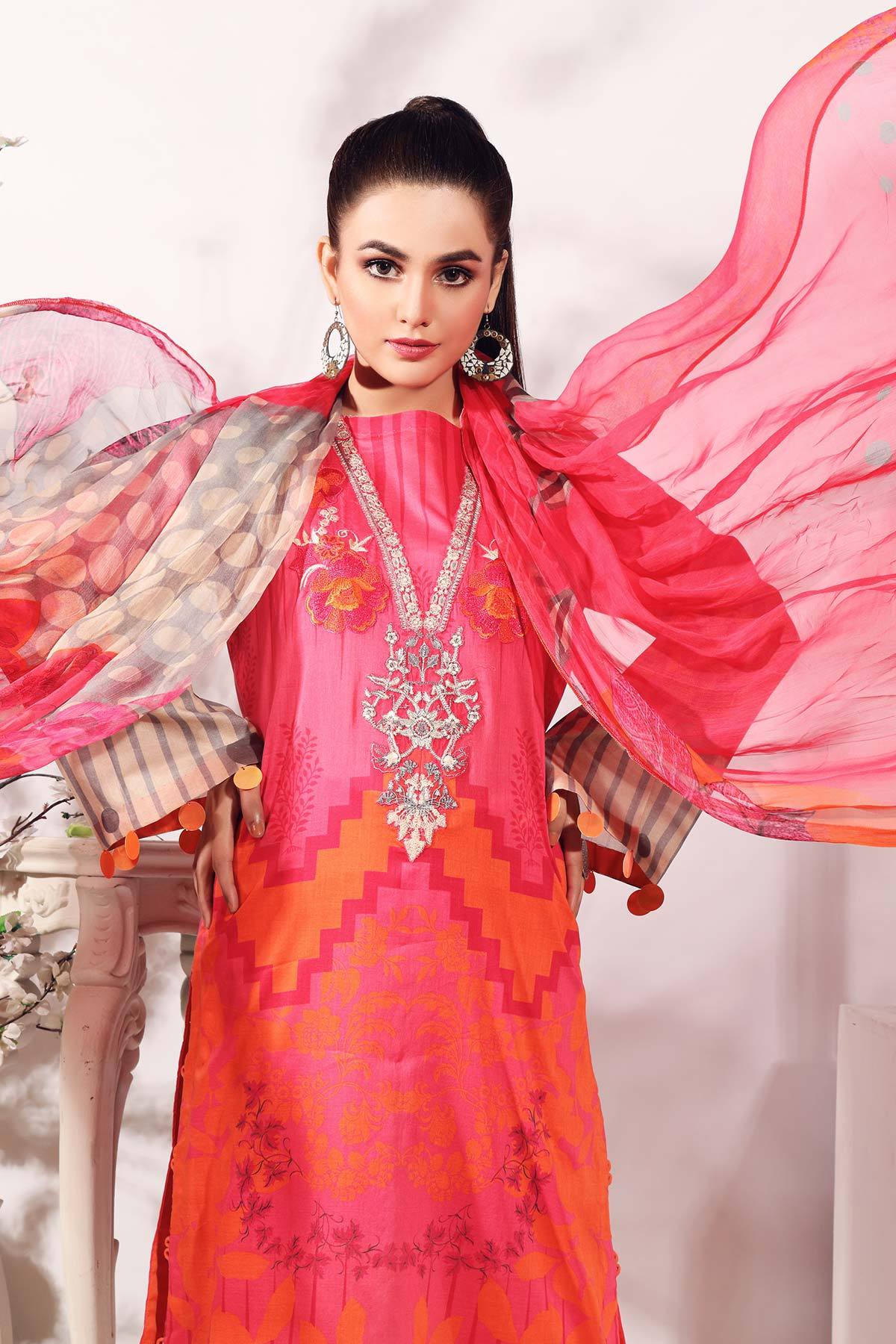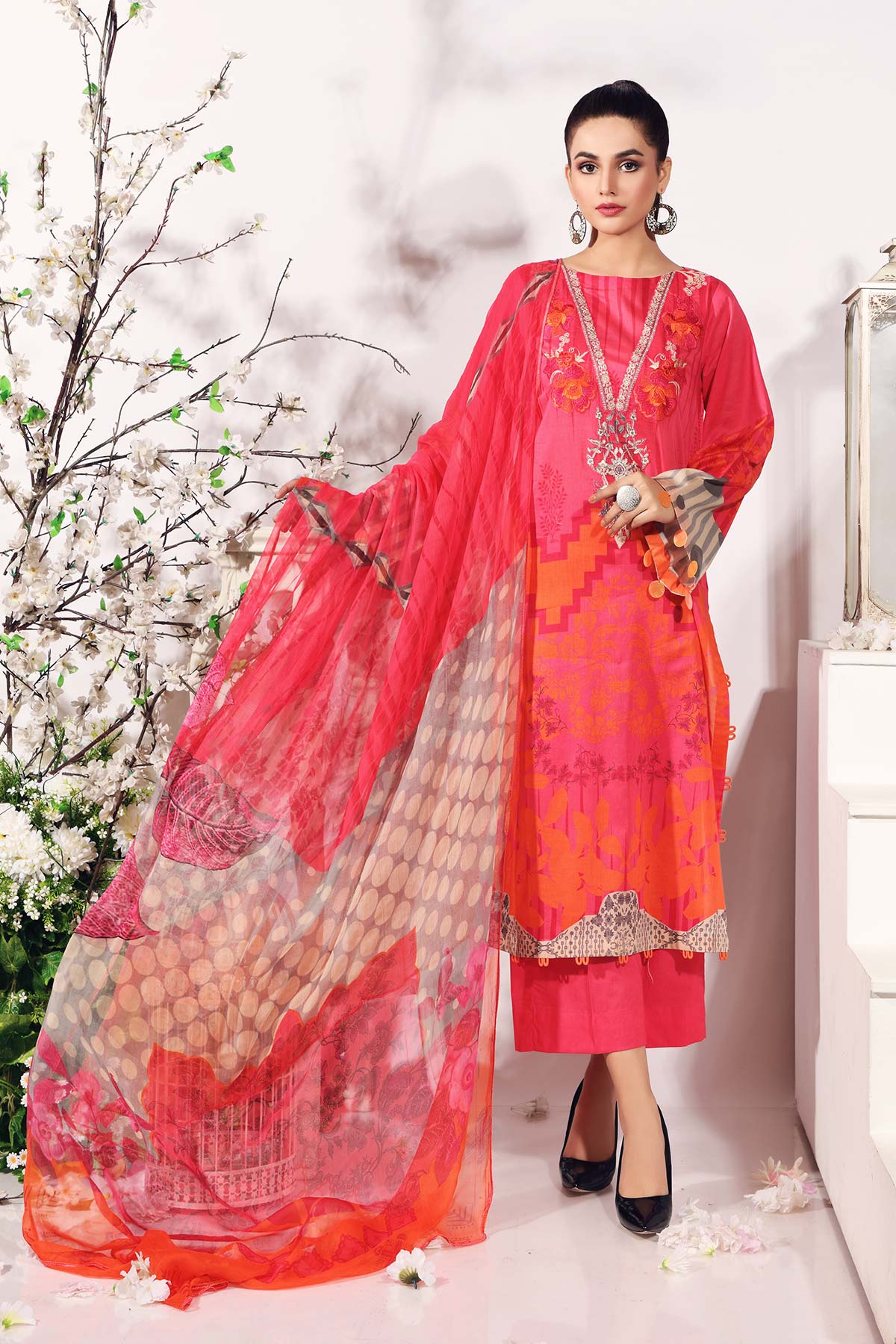Fabric: Shirt Printed lawn Front Back and sleeve 3.4M Embroidered Front Neckline 1Pcs Trouser Cotton Trouser 2.5 m Dupatta Printed Chiffon Dupatta 2.5 m |