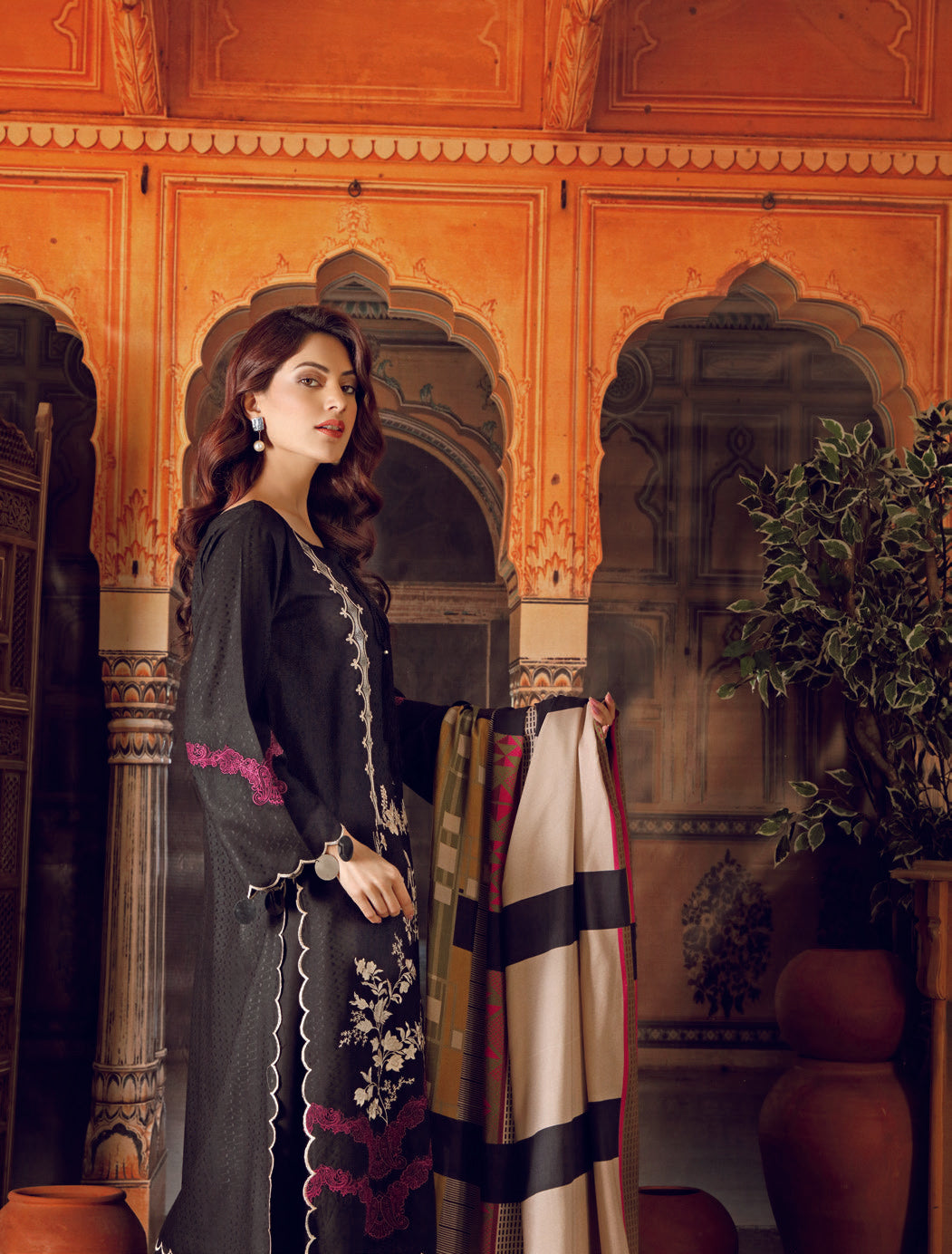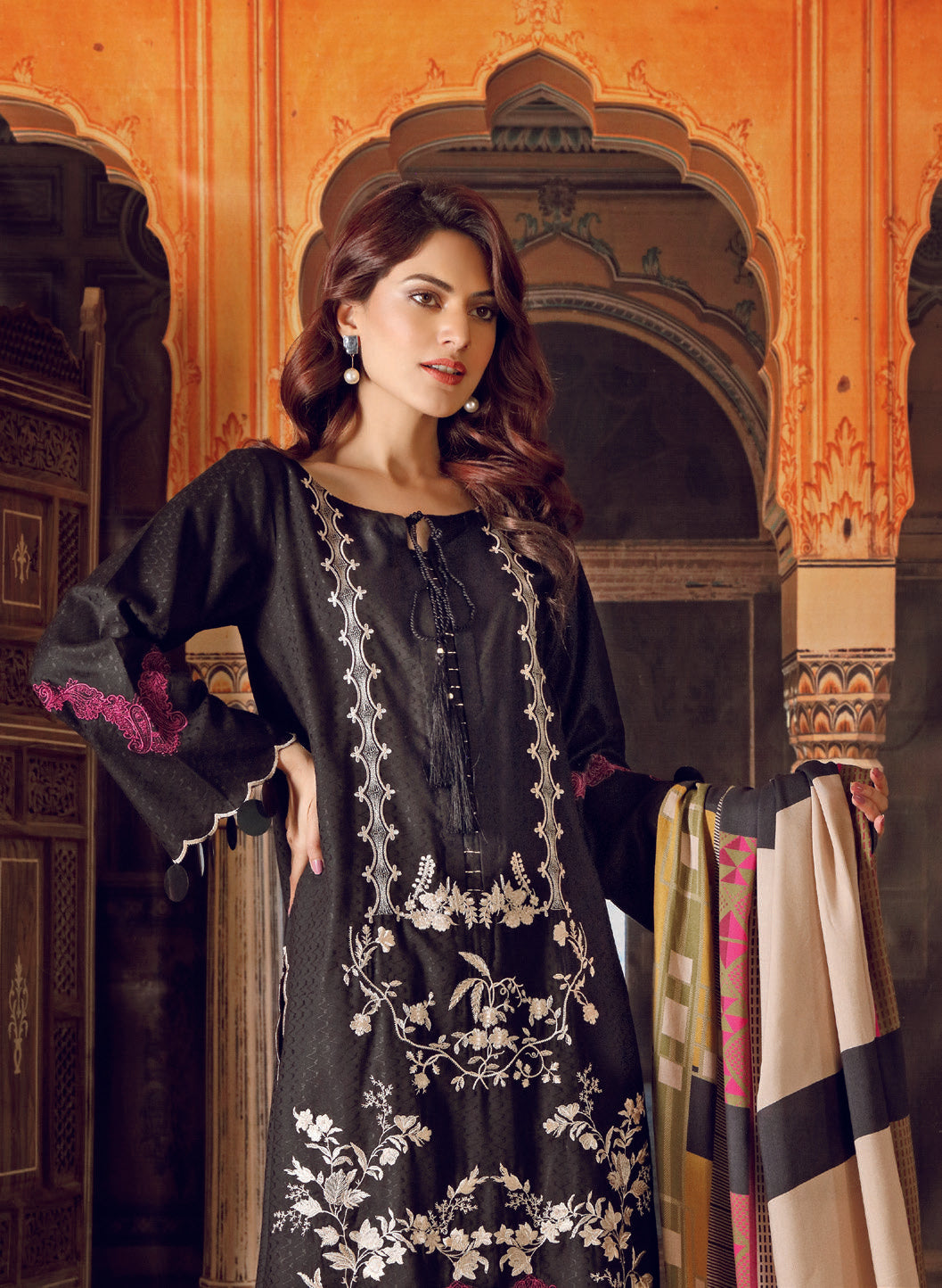 Fabric: Marina Embroidered Front Marina Back and Sleeves Embroidered Daman And Sleeve Patch Pashmina Shawl Dyed Linen Trouser |