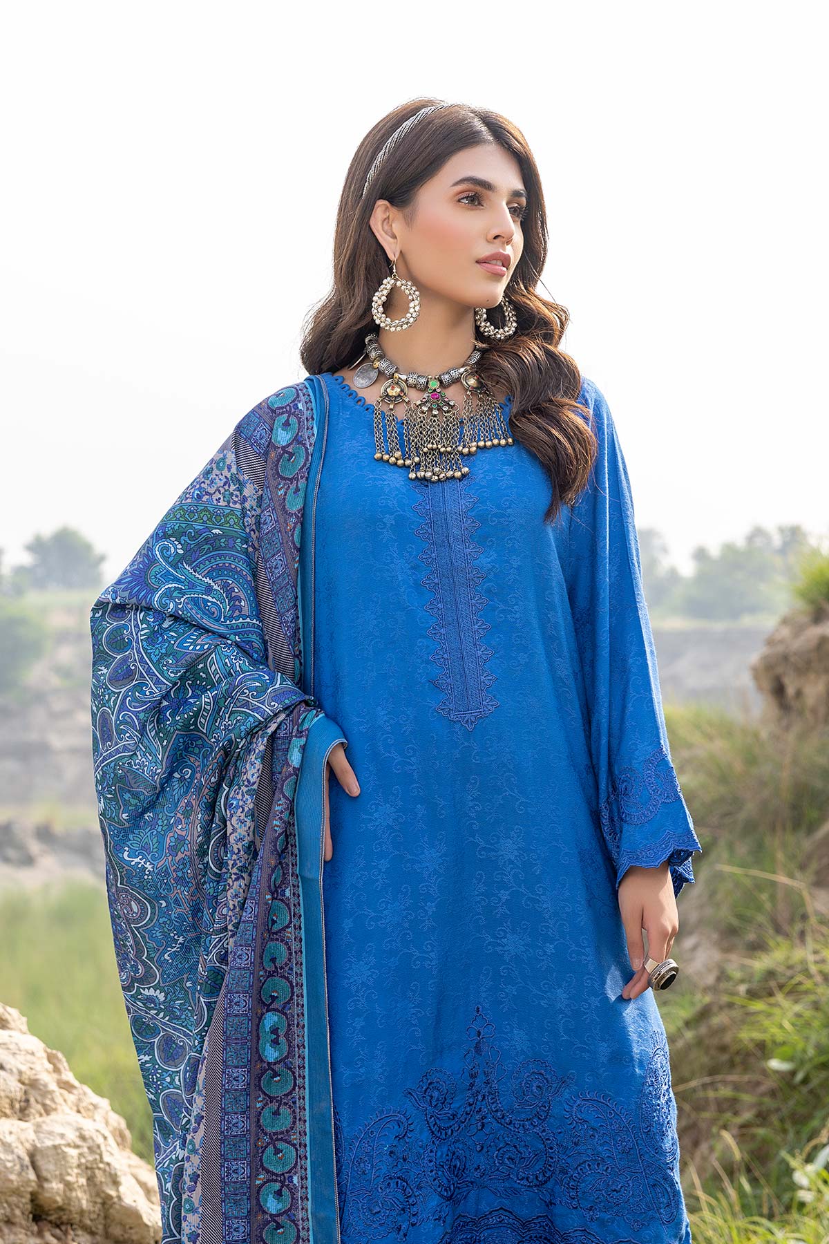 Fabric: Shirt - Embroidered Marina Jacquard Front 1.4M - Marina Jacquard Back 1.4M - Embroidered Marina Jacquard Sleeves 26 inches - Embroidered Front Neck Patti 1.4M Trouser - Marina Jacquard Trouser 2.5M Dupatta - Printed Pashmina Shawl 2.5M |
