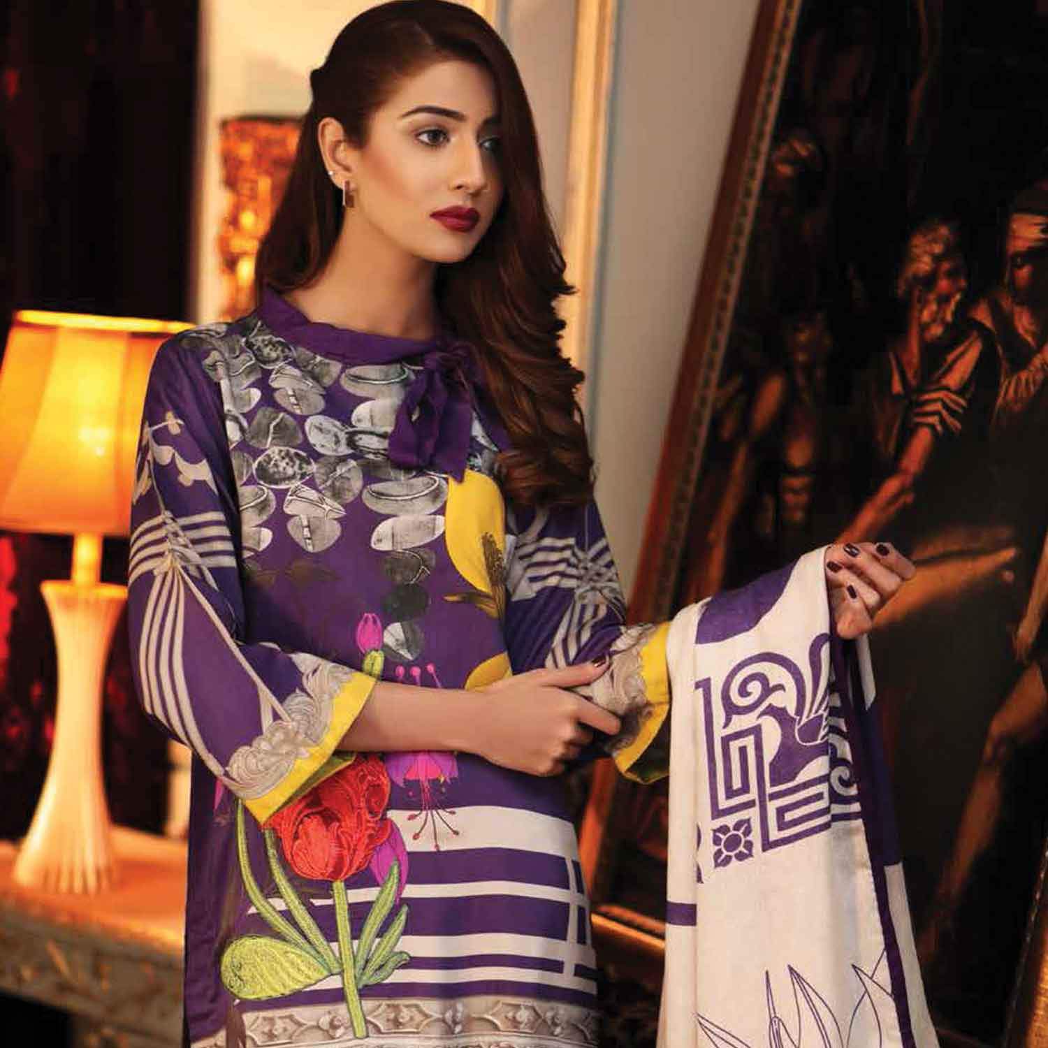 Fabric: Embroidered Silk Jacquard Suit with Jacquard Shawl Emb Front Staple Digital Print 1.25 Mtr Back + Sleeves Staple Digital Print 2 Mtr Emb Trouser Staple 2.5 Mtr Staple Jacquard Digital Print Shawl 2.5 Mtr |