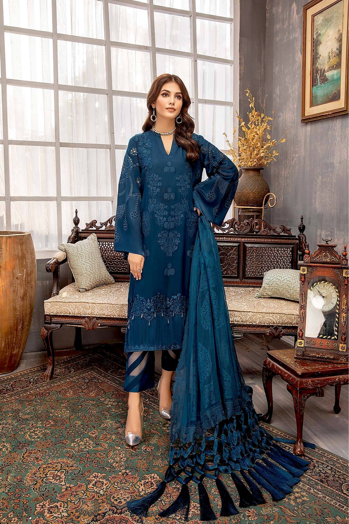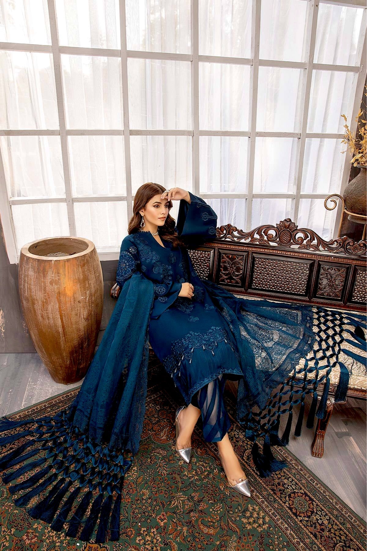Fabric: Shirt Embroidered karandi Front 1.4M Embroidered Karandi Sleeves 26 Inches Embroidered Front Daman Patti 1M Karandi back 1.4M Trouser Karandi Trouser 2.5M Dupatta Luxury Organza Dupatta 2.5M Embroidered Dupatta Patti 8M |