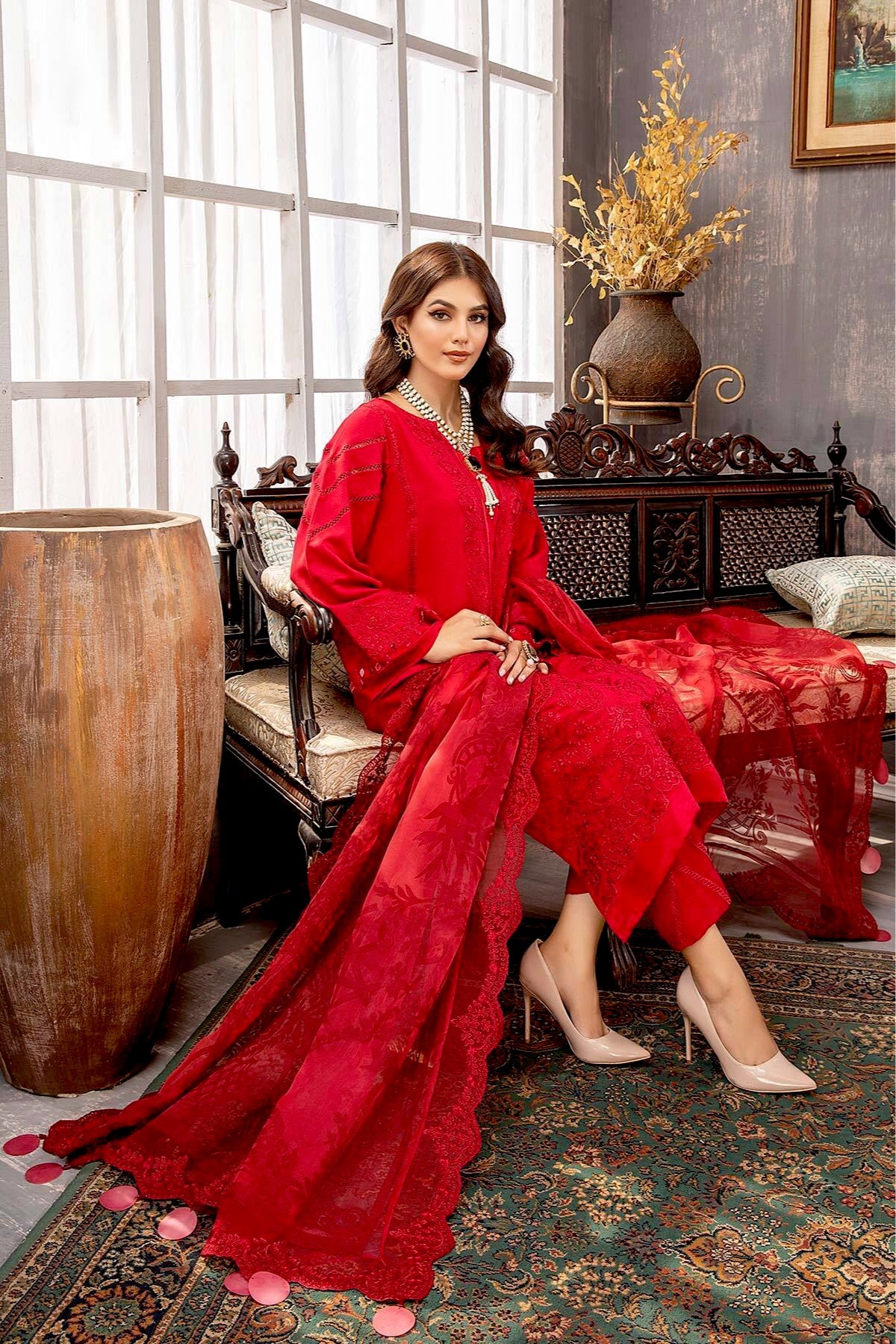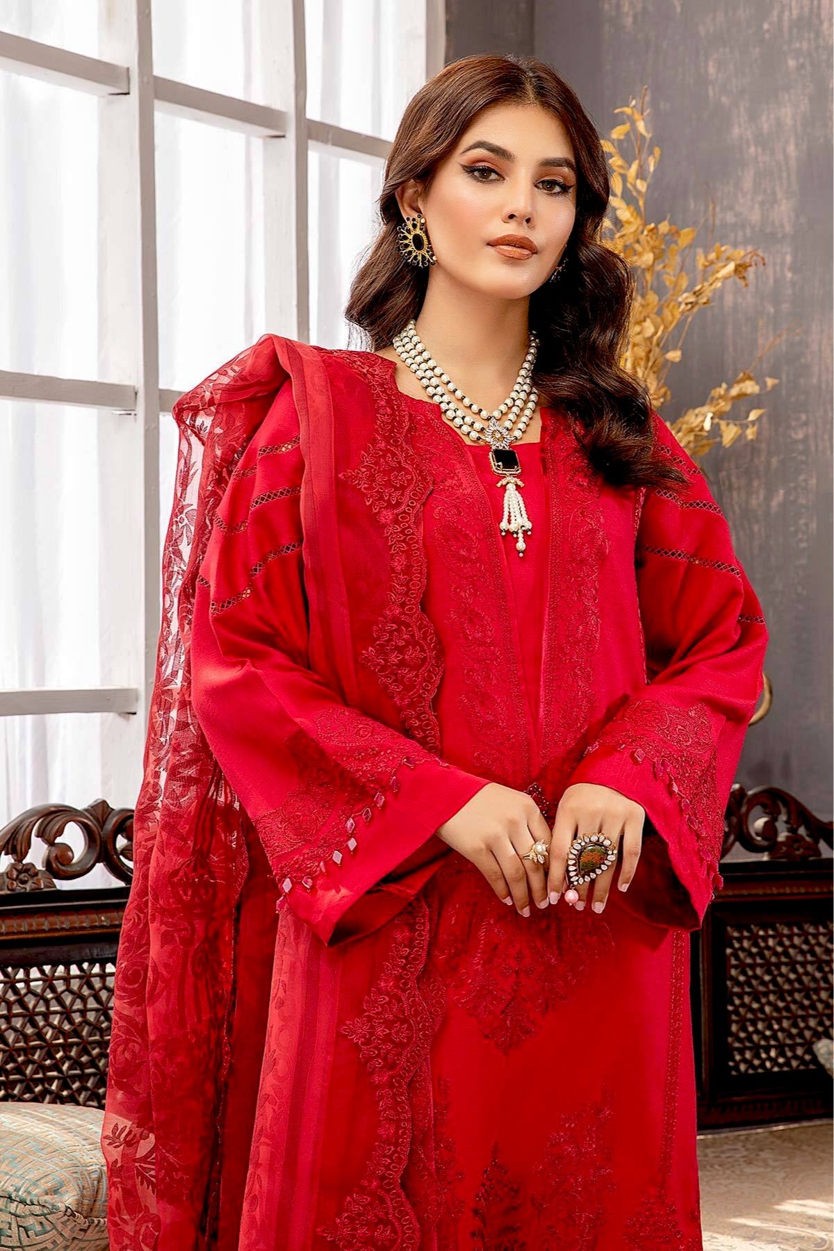 Fabric: Shirt Embroidered Karandi Front 1.4M Karandi Back+Sleeves 2M Embroidered Sleeves Patti 1.4M Trouser Karandi Trouser 2.5M Dupatta Embroidered Luxury Organza Dupatta 2.5 M Embroidered Dupatta Patti 8M |