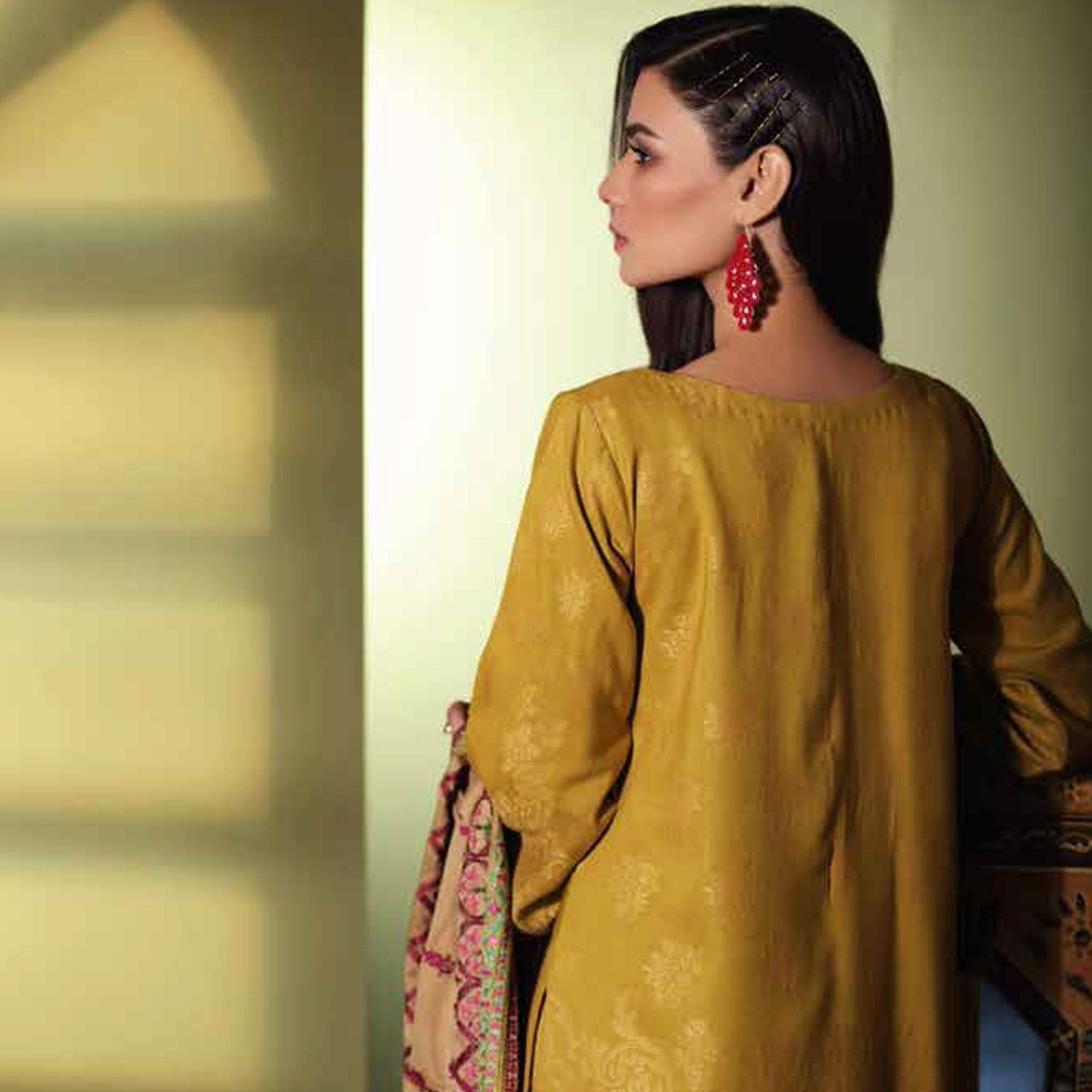 Fabric: Emb Front Neckline 0.75 Mtr Emb Front Hemline 1 Mtr Shirt Front + Back + Sleeves Leather Jacquard 3.25 Mtr Trouser Leather 2.50 Mtr Emb Wool Shawl 2.50 Mtr |