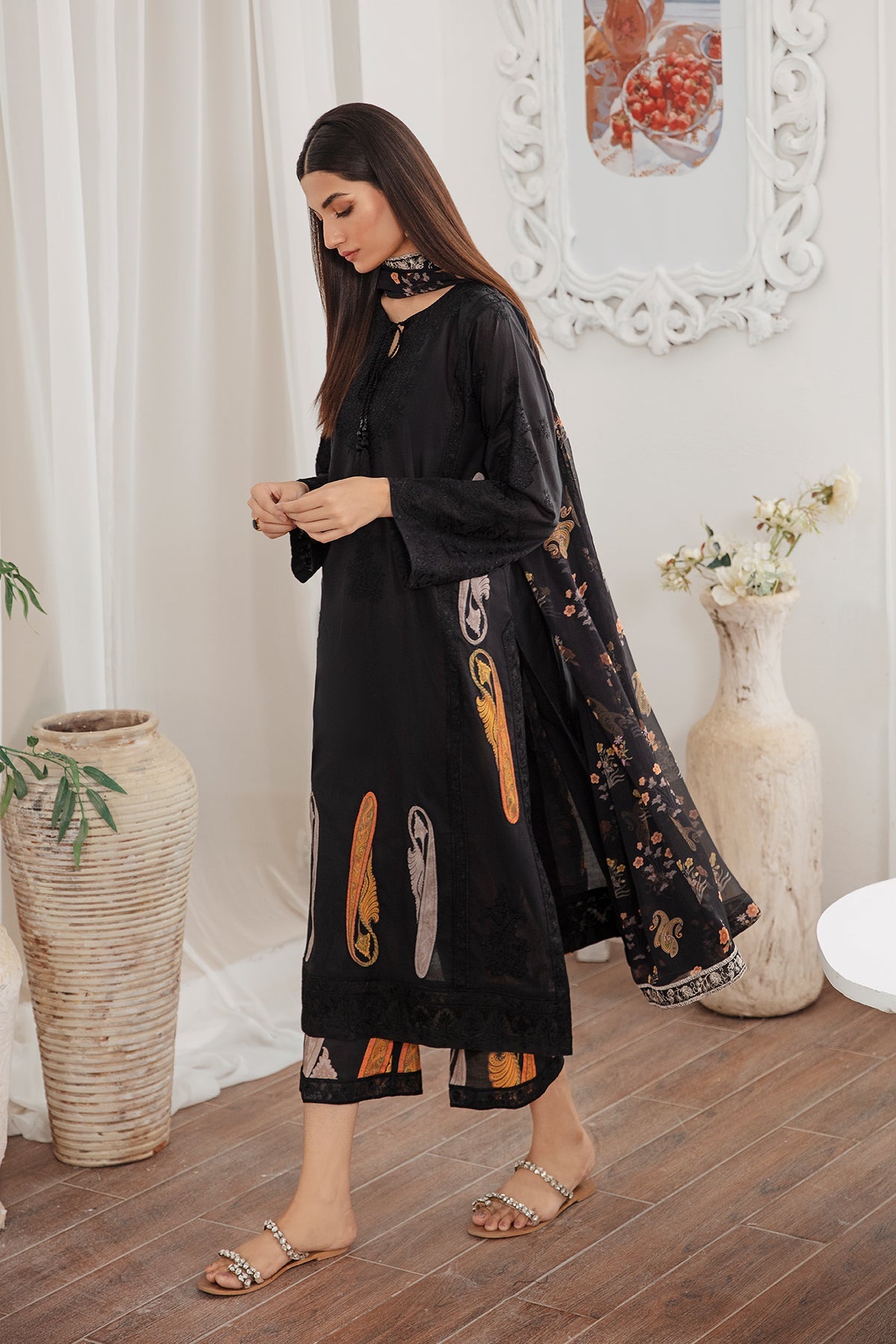 Fabric: Front Embroidered Lawn 1.25 mtr Embroidered Sleeves Lawn 0.66 mtr Back Plain Lawn 1.25 mtr Embroidered Sleeves+ Daman Motif 4 pcs Embroidered Front+ Back+ Trousers Patti 2.50 mtr Embroidered Chok Patti+ Panel Patti 8 mtr Front Printed Motif 7 pcs Embroidered Trousers Patti 1.25 mtr Trousers Cotton Printed 2.50 mtr Embroidered Dupatta Patti 8 mtr Dupatta Printed Chiffon 2.50 mtr |