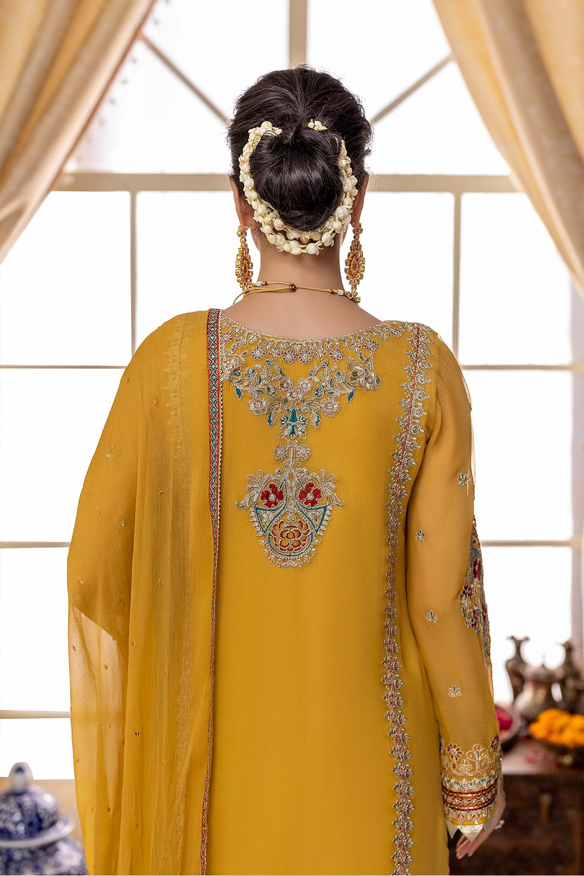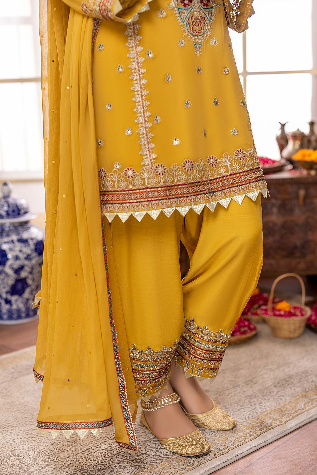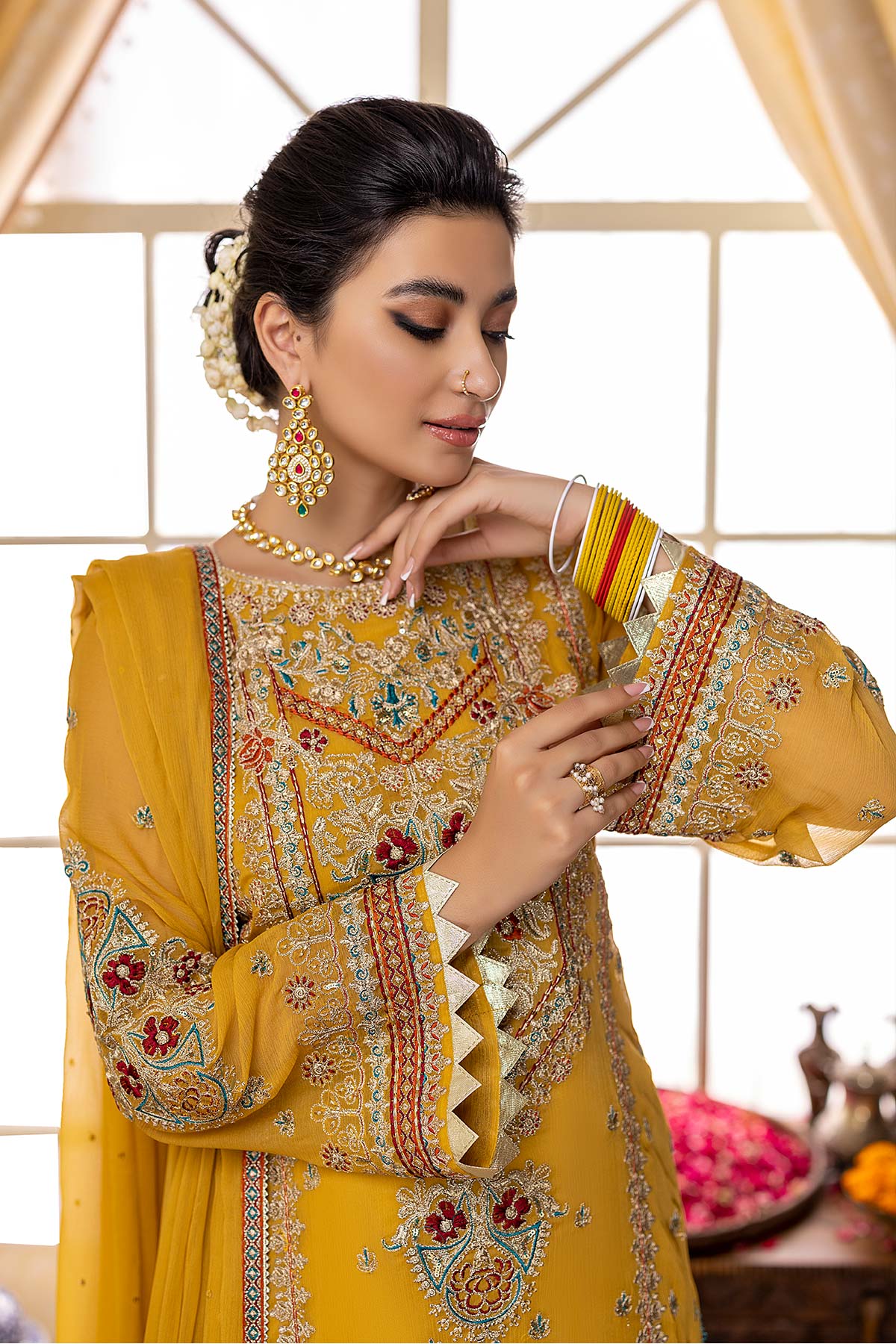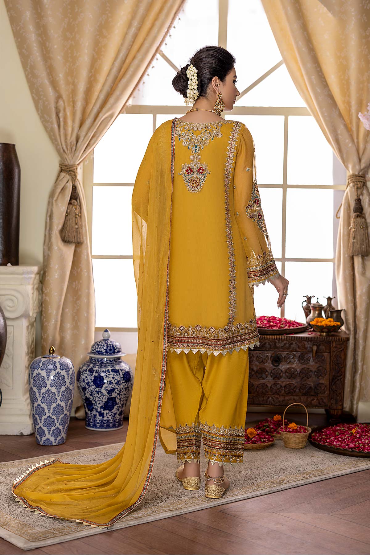 Fabric: Shirt - Embroidered Front Polly Chiffon 1M - Embroidered Polly chiffon sleeves 26 inches - Embroidered Polly Chiffon Back 1M - Embroidered Front +Back Daman Patti 2M Trouser - Plain Grip Trouser 2.5M Dupatta - Embroidered Polly Chiffon t Dupatta 2.5M |