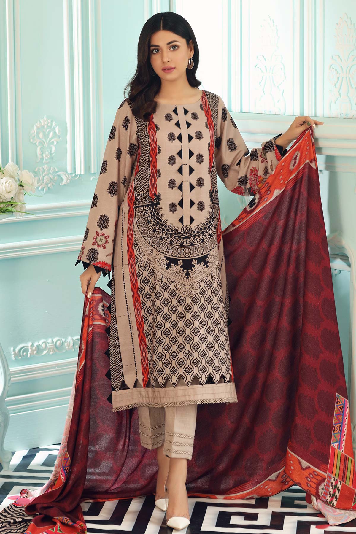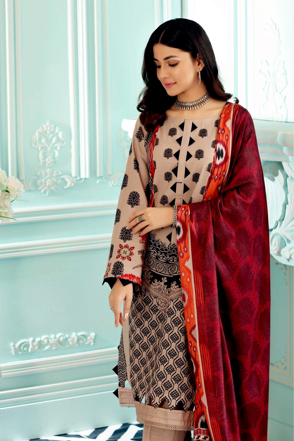 Fabric: Shirt Printed Khaddar Front +Back +Sleeves 3.4M Trouser Khaddar Trouser 2.5M Dupatta Printed wool Shawl 2.5M |