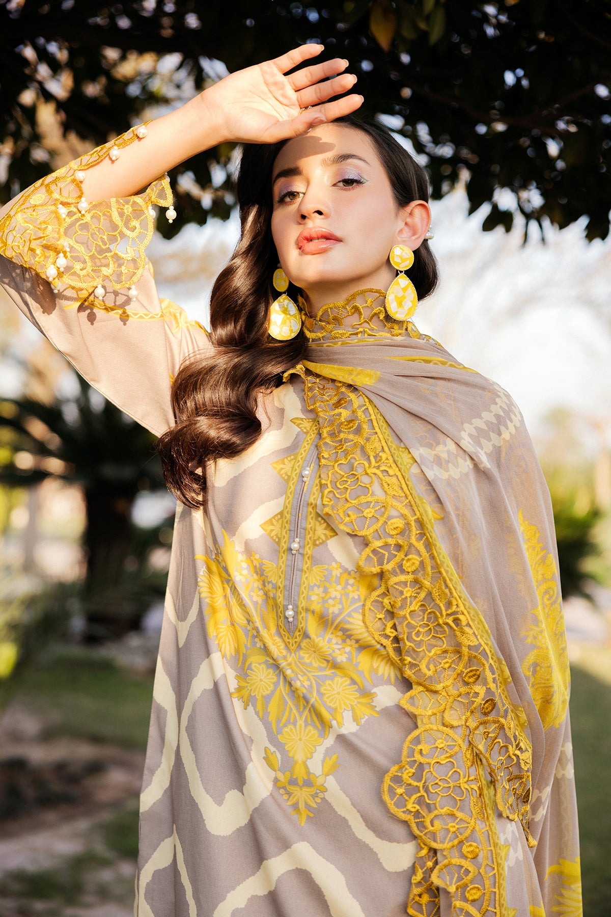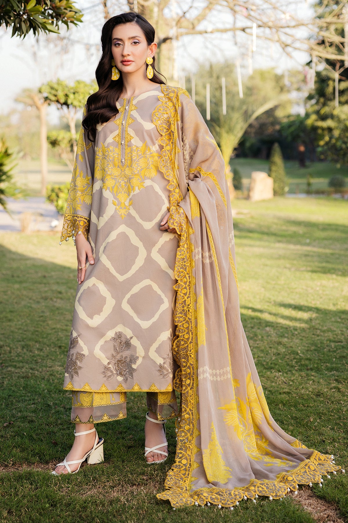 Summary: The Charizma Sheen Lawn SH5-10 offers a sophisticated yet comfortable style, perfect for daily wear. This unstitched three-piece suit showcases a beige printed lawn shirt, featuring intricate embroidery on the front, sleeves, and daman. The ensemble includes a printed cotton trouser and a beautifully embroidered printed chiffon dupatta in a contrasting yellow, enhancing the overall aesthetic. Made with high-quality lawn, the shirt promises breathability and comfort, making it ideal for the spring/summer season. This Pakistani suit offers versatility for casual outings or everyday elegance. Embrace the blend of traditional design and modern appeal with this Charizma creation. The unstitched format allows for customization according to your preference and ensures a perfect fit.
