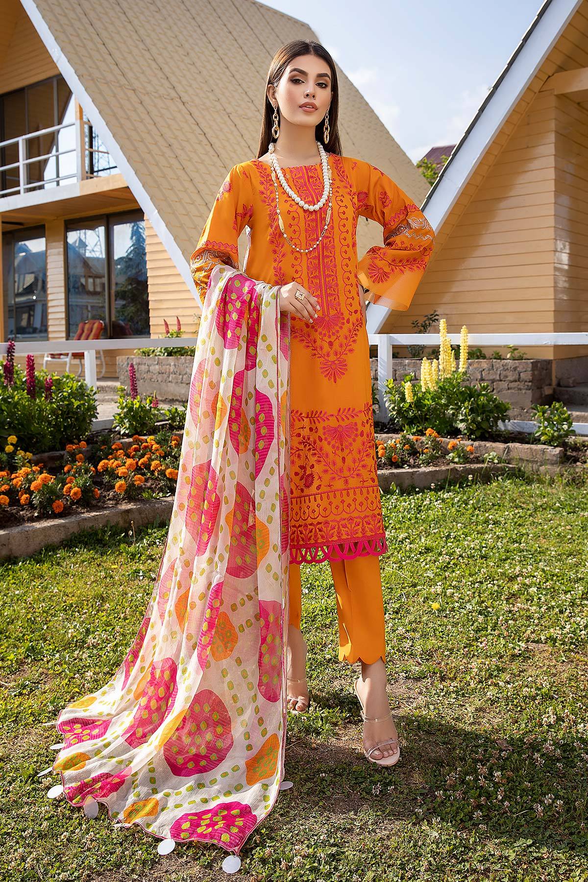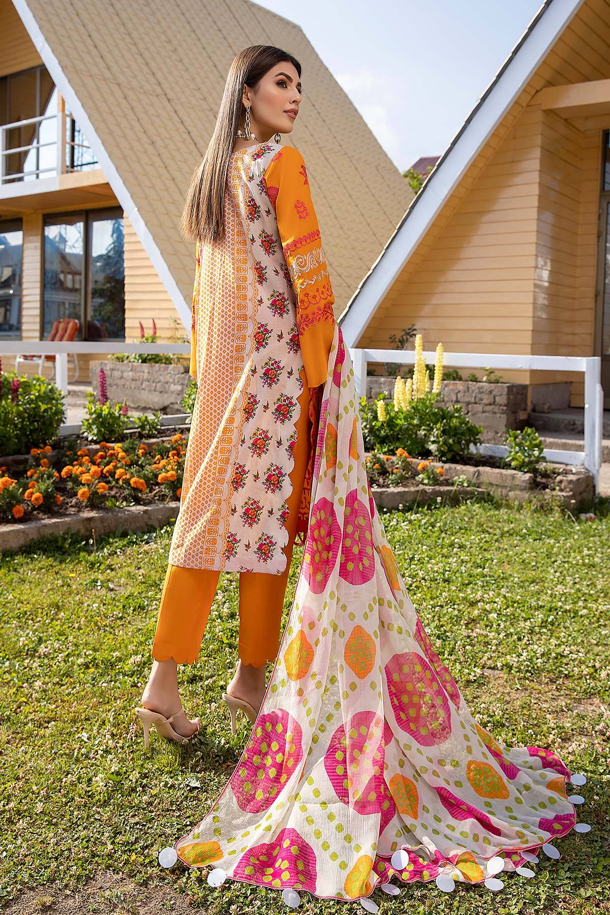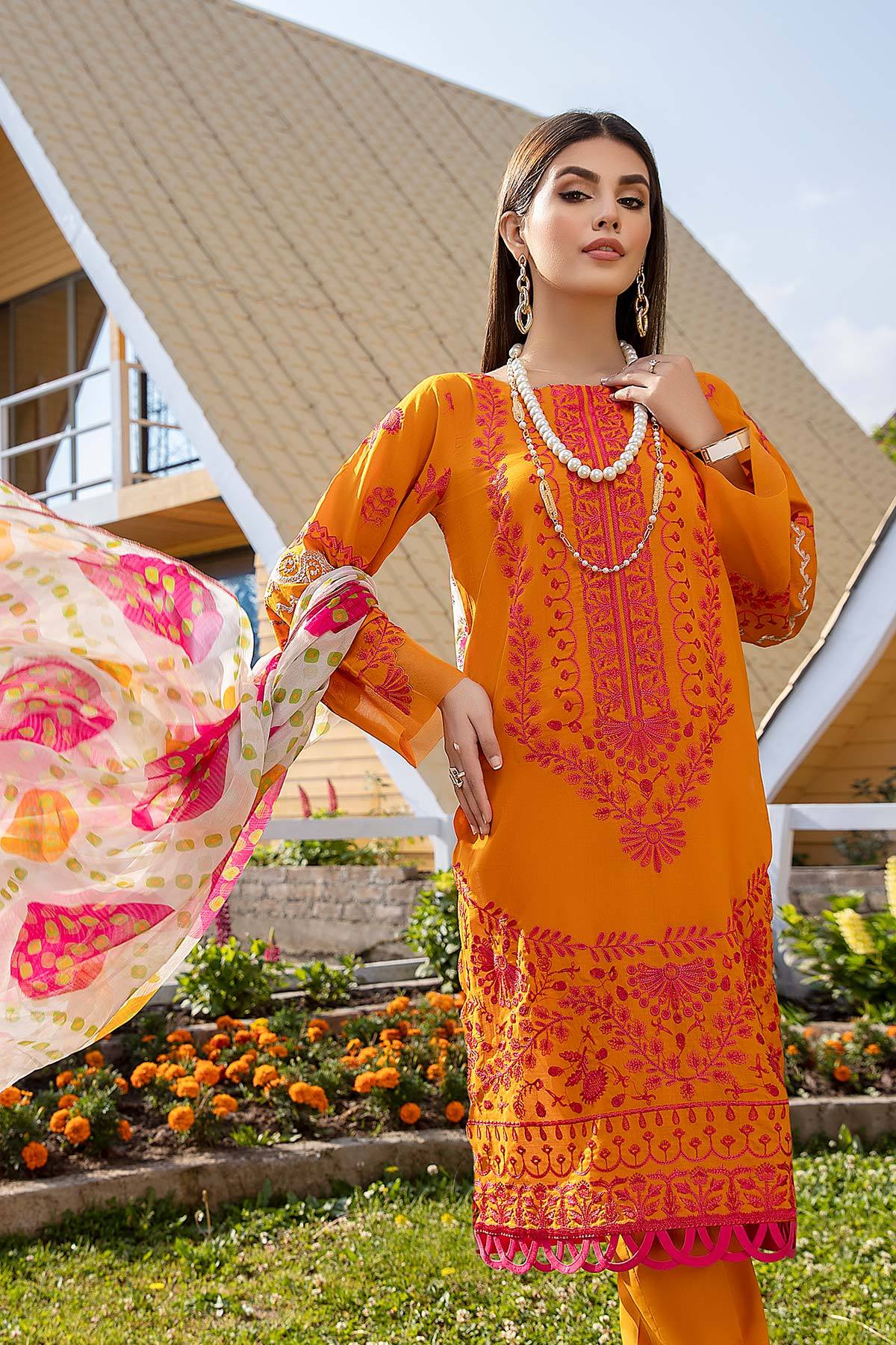 Fabric: Shirt Embroidered Front lawn 1M Back lawn print 1.4M Embroidered Sleeves lawn 26 inches Trouser Cotton Trouser 2.5 M Dupatta Print Chiffon Dupatta 2.5M |