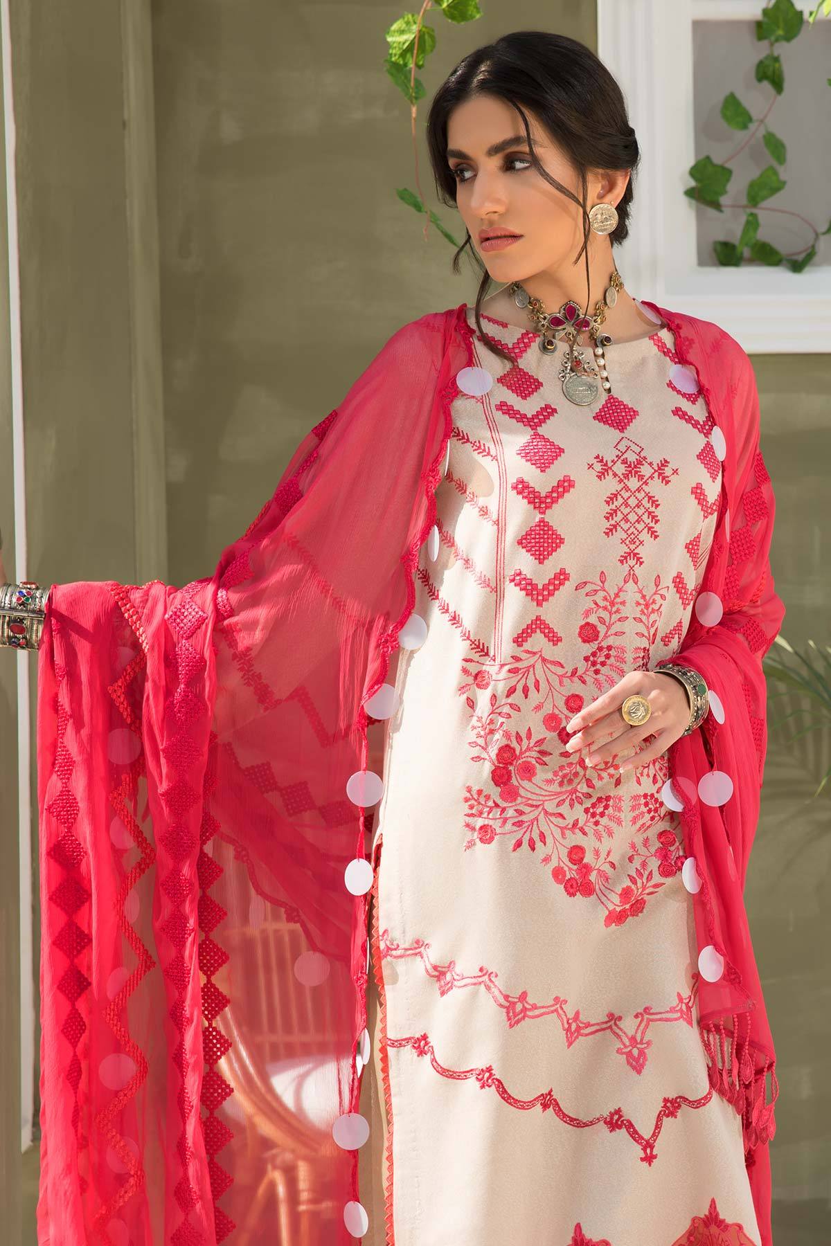 Fabric: Shirt Embroidered Lawn Karandi Front 1.4 m Embroidered Lawn Karandi Sleeves 26 inches Lawn Karandi Back 1.4 m Embroidered Front + Back Daman Patti 2 m Trouser\n Embroidered Trouser Patti 1.5 m Dupatta |