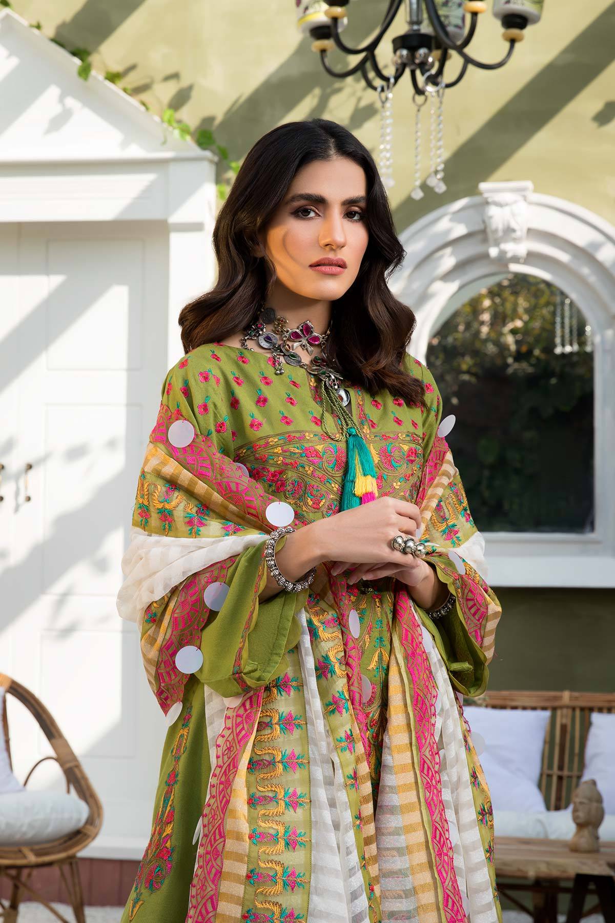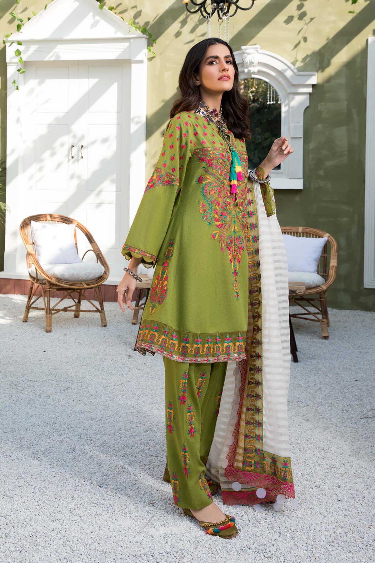 Fabric: Shirt Embroidered Lawn Karandi Front 1.4 m Embroidered Lawn Karandi Sleeve 26 inches Lawn Karandi Back 1.4 m Embroidered Front Daman Motif 2 Pieces Embroidered Front + Back Daman Patti 2 m Embroidered Sleeve + Neck Patti 2 m Embroidered Front + Back Daman Patti 2.5 m Trouser Embroidered Karandi Trouser 2.5 m Dupatta 2 Embroidered Dupatta Patti 8 m each Organza Karandi Dupatta 2.5 m |