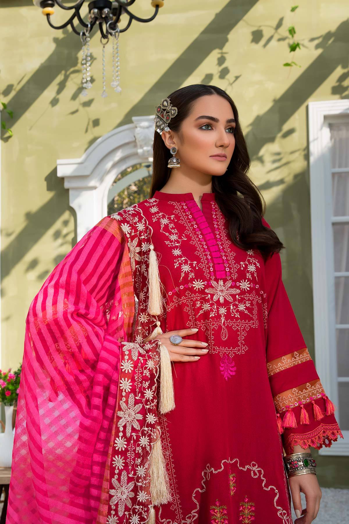 Fabric: Shirt Embroidered Lawn Karandi Front 1.4 m Lawn Karandi Back + Sleeves 2 m Embroidered Front + Back + Sleeves Patti 2.5 m 2 Embroidered Sleeves Patti 1.5 m each Trouser Embroidered Karandi Trouser 2.5 m Dupatta Embroidered Dupatta Patti 8 m Organza Karandi Dupatta 2.5 m |