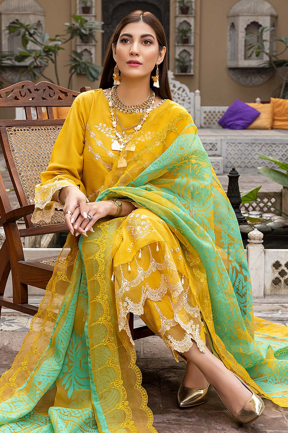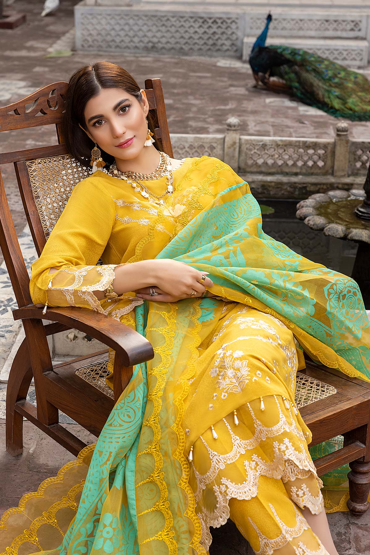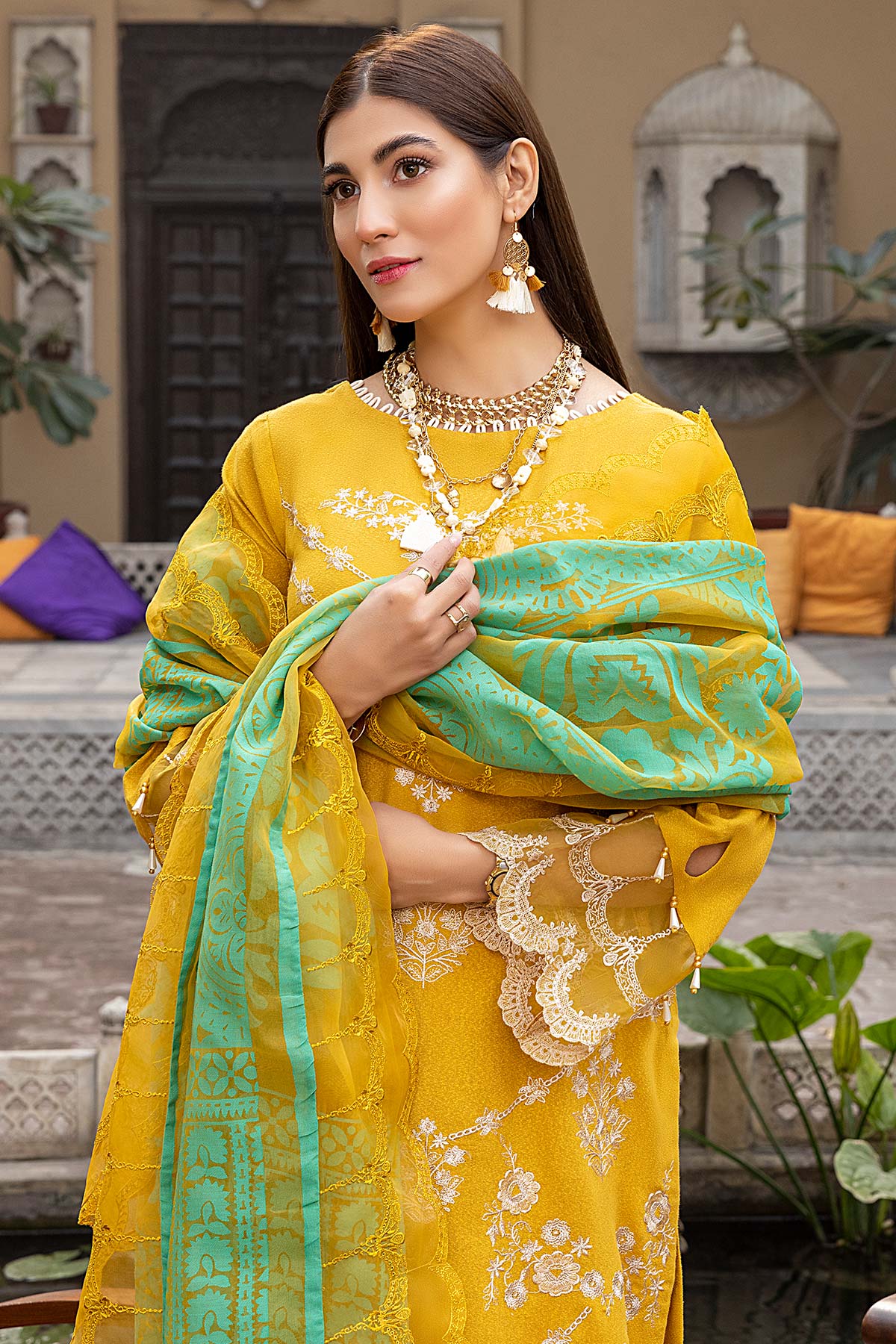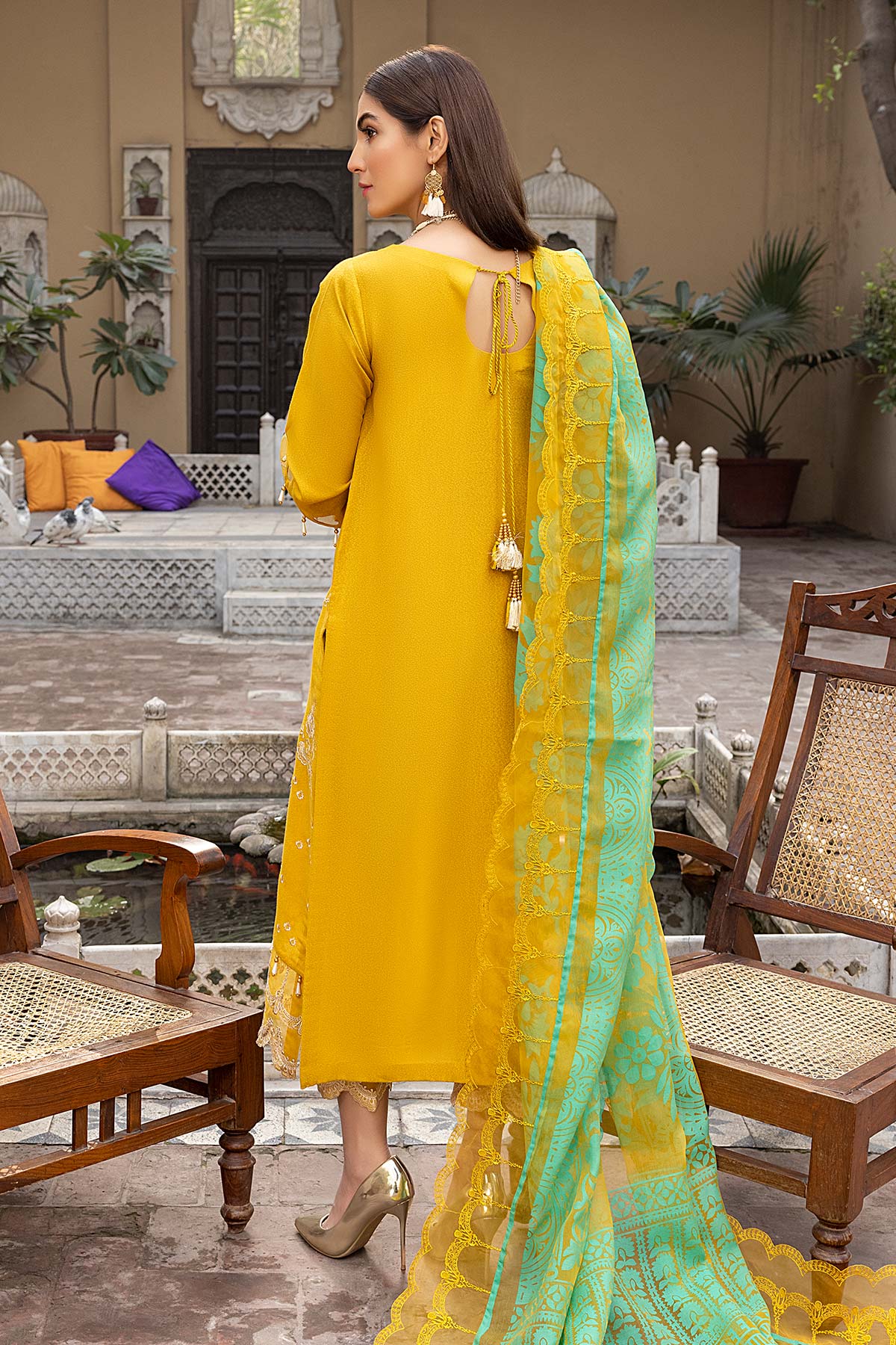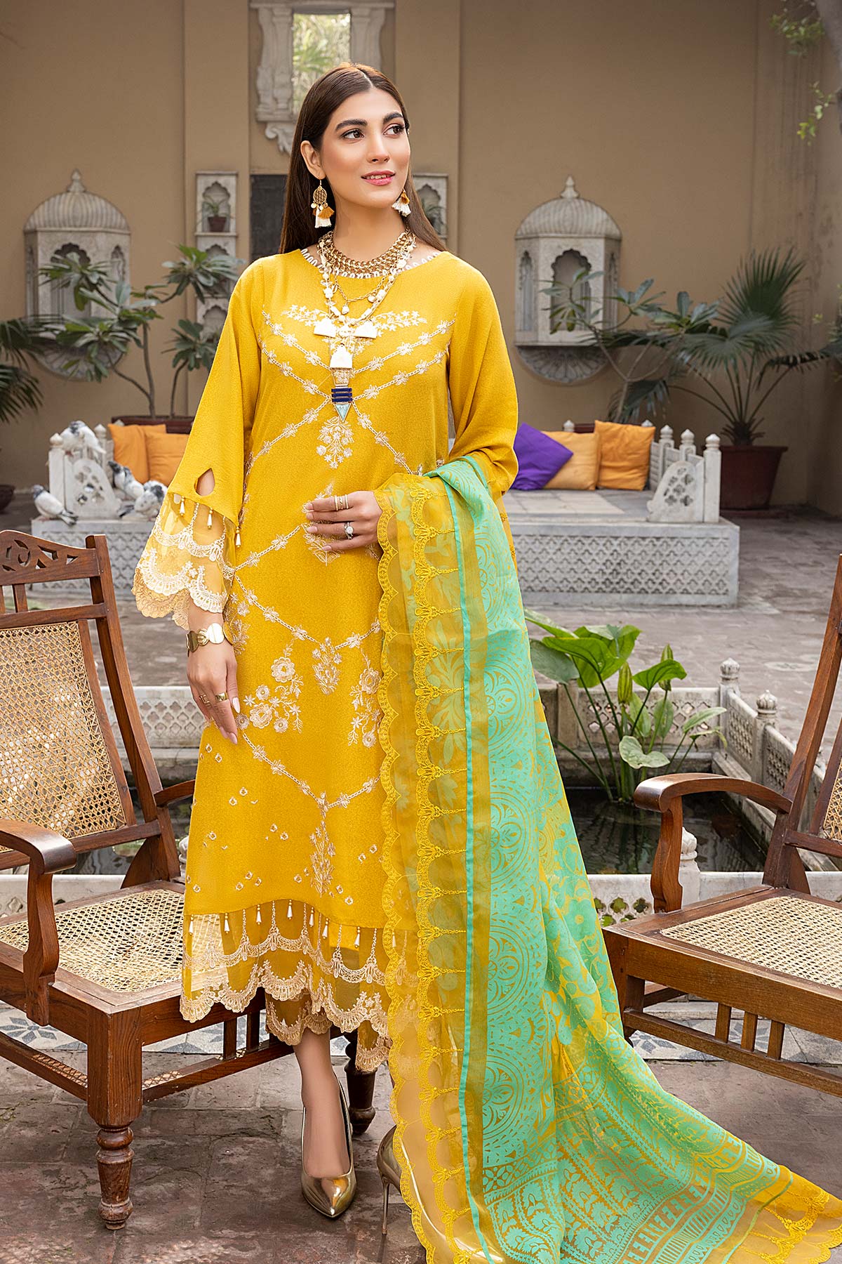 Fabric: Shirt Embroidered karandi Front 1.4M Embroidered Karandi Sleeves 26 Inches Karandi Back 1.4M Embroidered Front + Trouser Patti 2M Trouser Karandi Trouser 2.5M Dupatta Printed Organza Dupatta 2.5M Embroidered Dupatta Patti 8M |