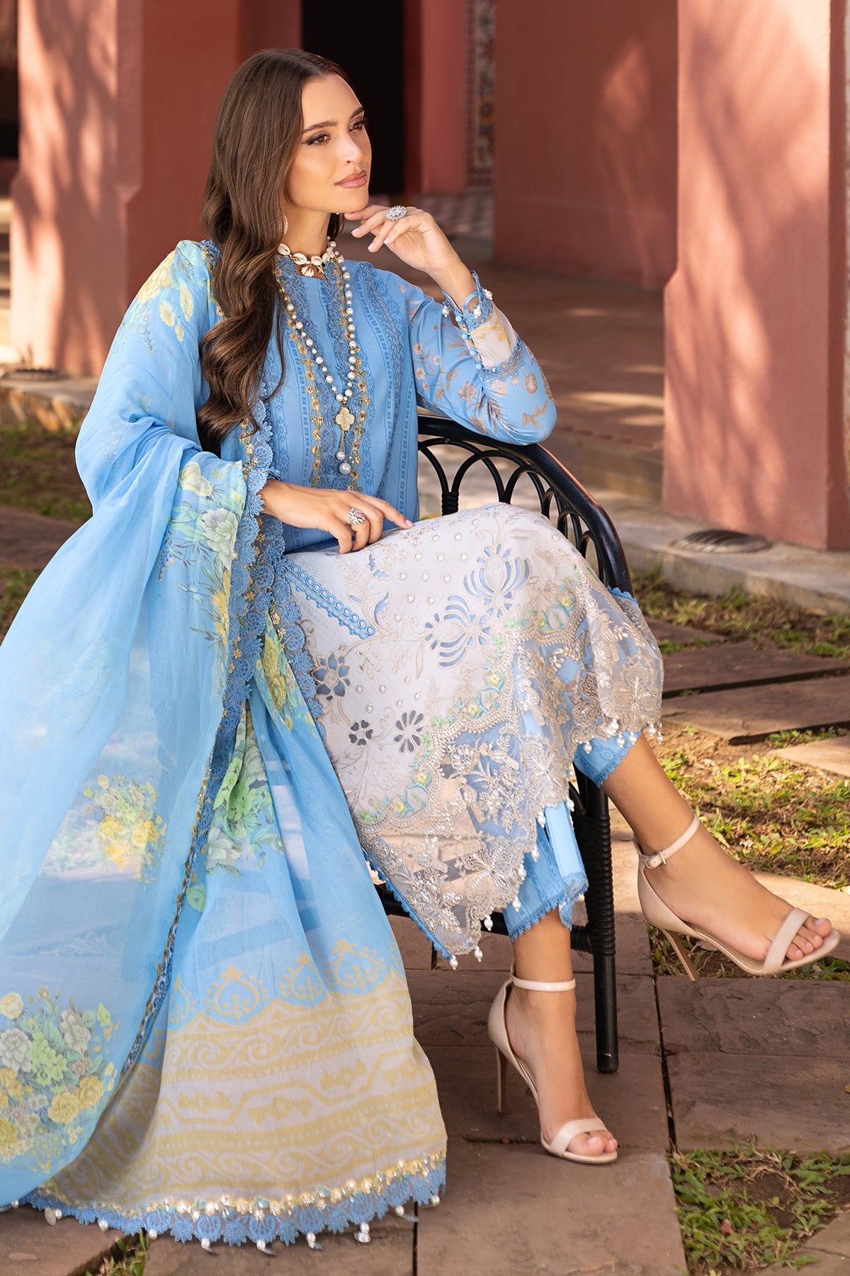 Summary: The Charizma Sunshine Lawn SN5-04 offers a refreshing take on daily wear with its calming sky blue hue. This unstitched, three-piece Pakistani lawn suit is perfect for the spring/summer season. It features an embroidered printed lawn front, complemented by a printed lawn back and sleeves. The intricate embroidery details on the front, back, daman, chok, trouser, and sleeves add a touch of elegance to the overall design. The printed cotton trouser provides comfort and breathability, while the embroidered printed chiffon dupatta drapes beautifully. This versatile suit is perfect for casual outings, daytime events, or simply adding a touch of elegance to your everyday wardrobe. Authentic and original, this Charizma creation is a must-have for those seeking effortless style and comfort.