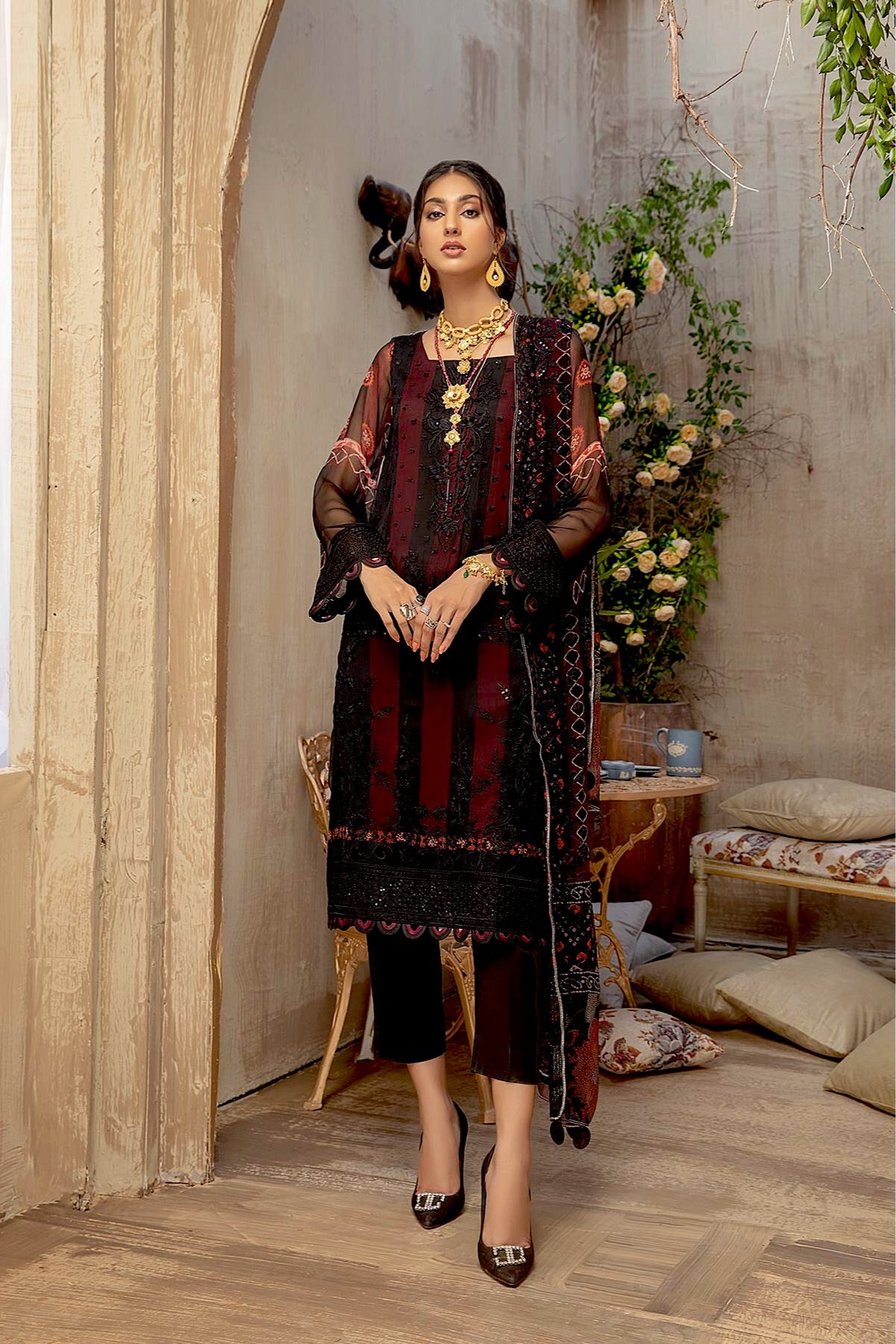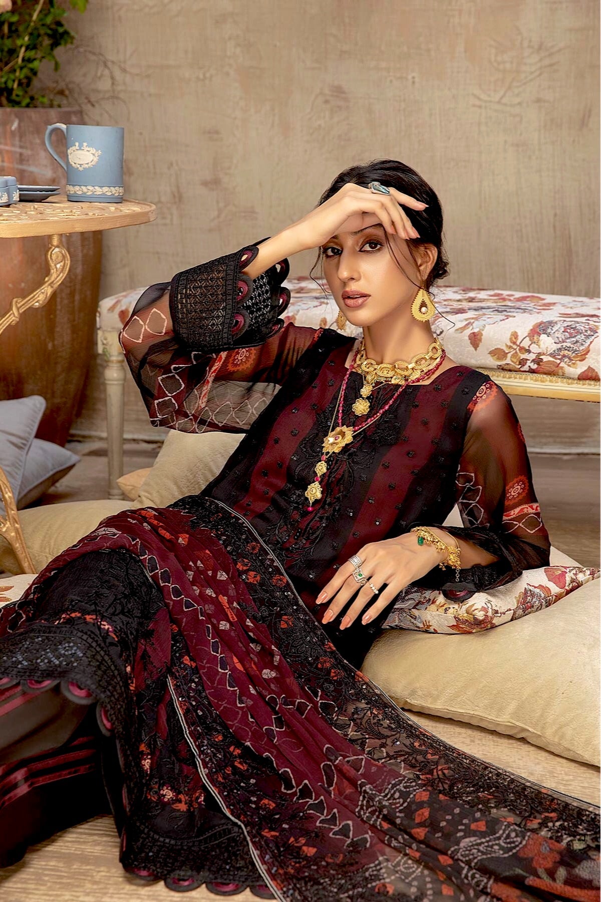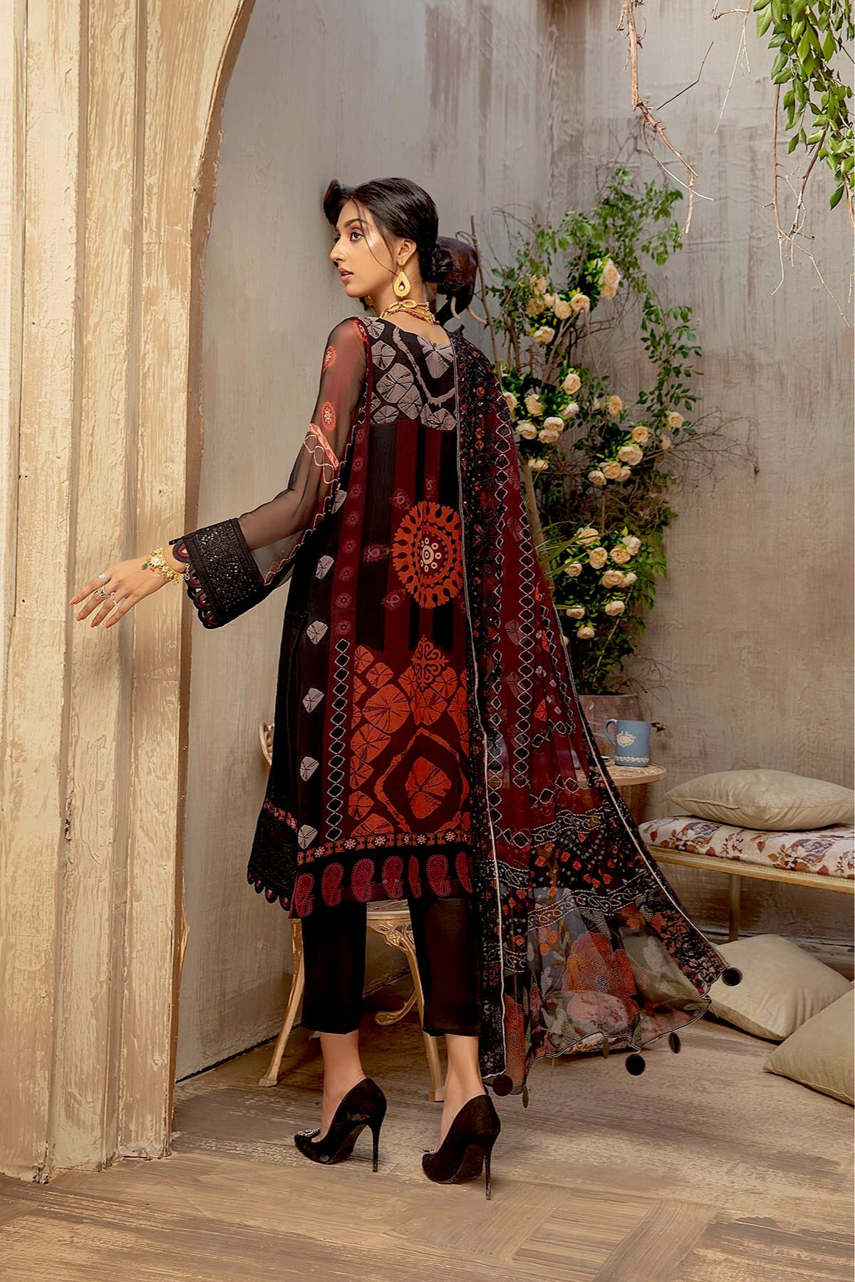 Fabric: Shirt Embroidered Print front chiffon 1.4M Print Chiffon back +sleeves 2M Embroidered Sleeves + Daman Patti 2M Inner Shirt 2.25M Trouser Raw Silk Trouser 2.5 M Dupatta Embroidered Printed Chiffon Dupatta 2.5 M |