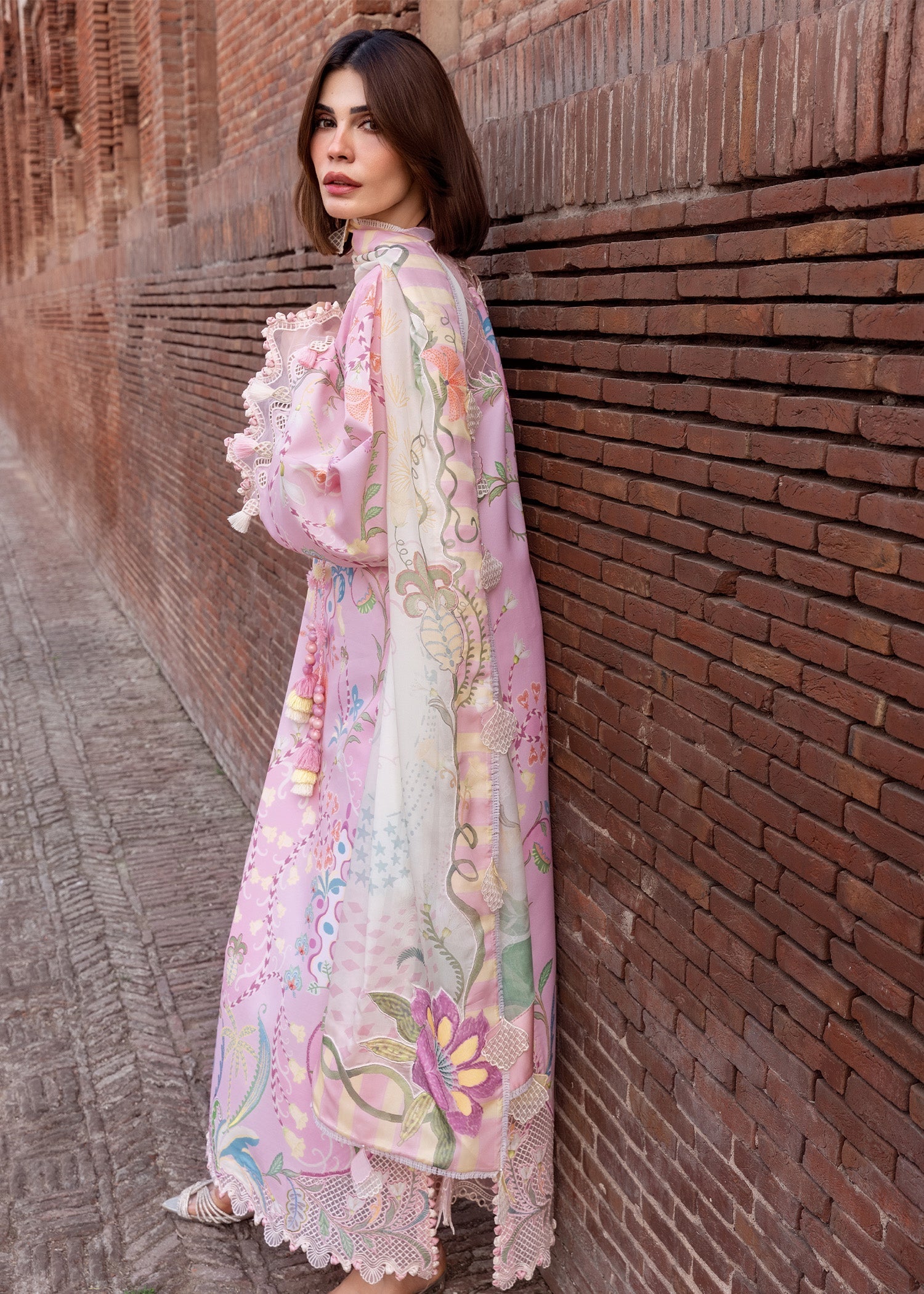 Fabric: Color: Candy One hand-printed center panel with marori work Two hand-printed side panels with marori work and organza appliques Front and back embroidered necklines 0.8 meters hand-printed lawn for back 0.56 meters hand-printed lawn for sleeves 1.1 meters embroidered border for sleeves 2 meters hand-printed fabric for trousers (large width) 8 meters embroidered border for dupatta 8 meters printed silk border for dupatta 2.3 meters solid dyed woven net for dupatta Embroidered Heart Neckline On Organza. Embroidered Daman On Organza For Front. 1.10m Embroidered Patti On Organza For Sleeves. Pair Of Embroidered Motifs On Organza For Trouser. 2.45m Printed Cambric For Trouser. 2.25m Printed Silk Dupatta. |