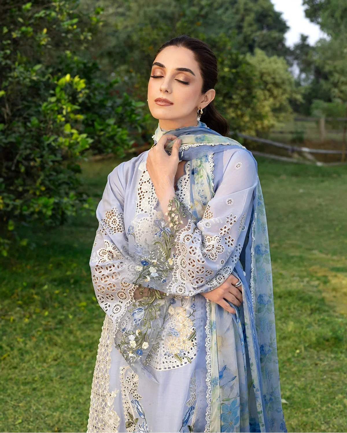 Summary: Embrace the serenity of summer with this exquisite Elaf Luxury Lawn ensemble, beautifully showcased by Maya Ali. The centerpiece is a breath-taking blue kameez crafted from premium lawn fabric, adorned with intricate schiffli embroidery and delicate organza patches that exude sophistication. Paired with a lightweight, digitally printed chiffon dupatta featuring floral artistry, this Pakistani suit is the epitome of grace. Perfectly suited for Spring/Summer, the breathable material ensures comfort while the luxurious detailing makes it an ideal choice for Eid, day weddings, or elegant garden parties. Elevate your festive wear collection with this authentic unstitched dress material.