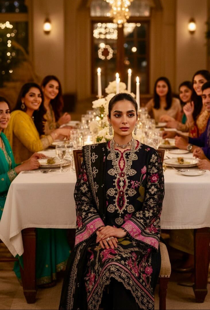 Fabric: Azureh — A Sublime Symphony in Twilight An ode to the night, Azureh unfolds on a deep black canvas—where ethereal artistry meets the mystery of the night’s allure. Lush embroidery in soft ivory, blush pink, and verdant tones conjures a whimsical floral garden in full bloom.Embroidered serpents and delicate lobsters glide with mythic grace, intertwined with etched butterflies and blooming botanicals, creating a surreal, twilight garden of dreamlike beauty—woven with couture craftsmanship.A regal paisley neckline shimmers in ivory threads, exuding timeless elegance, while the thread-stitched sleeves, finished with a contrasting turquoise patti, add a refined touch of color. Tribal-inspired accents and tasseled hems infuse the design with movement and eclectic sophistication.The look is completed with tonal trousers and a sheer cotton net dupatta, adorned with embroidered pink florals and ornate borders, cascading with an elegant ripple like a soft breeze. AZUREH (EL25-04 A) - 3 Pc - Unstitched Embroidered Front Centre Panel (Lawn) 1 Piece Embroidered Front Left Side Panel (Lawn) 1 Piece Embroidered Front Right Side Panel (Lawn) 1 Piece Dyed Back (Lawn) 1 Meter Embroidered Applique Sleeves (Lawn) 1 Pair Embroidered Border 1 (Poly Satin) 1 Meter Embroidered Border 2 (Poly Satin) 1 Meter Embroidered Border 3 (Poly Satin) 1 Meter Embroidered Border 4 (Poly Satin) 1 Meter Embroidered Duppatta Centre (Khaddi Net) 2 Meters Embroidered Duppatta Left Pallu (Khaddi Net) 1 Piece Embroidered Duppatta Right Pallu (Khaddi Net) 1 Piece Dyed Trouser (Cambric) 2 Meters |