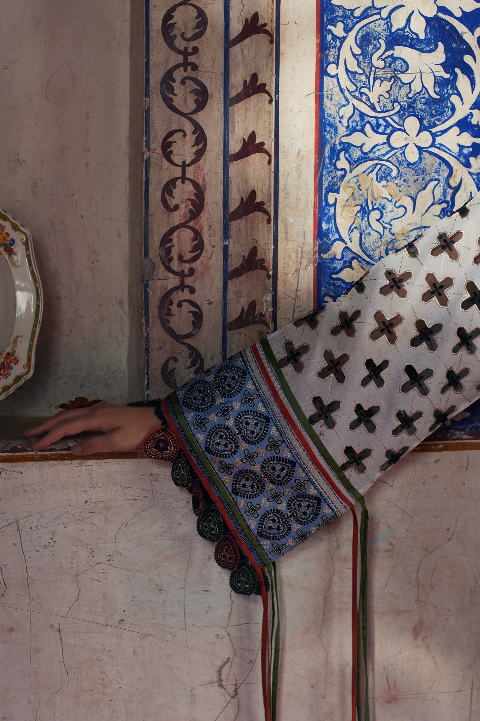 Fabric: Azureh — A Sublime Symphony Beneath the Waves An ode to the deep, Azureh unfolds on an opalescent pearl canvas—where ethereal artistry meets the untamed beauty of the sea. Vivid embroidery in cerulean, crimson, and verdant hues conjures a fantastical reef of flora and fluidity.Embroidered serpents and delicate lobsters glide with mythic grace, intertwined with etched butterflies and blooming underwater botanicals—a surreal aquatic garden, woven in couture craftsmanship.A regal paisley neckline shimmers in metallic threads, while thread-stitched sleeves, finished with a contrasting turquoise patti, add a refined touch. Tribal-inspired accents and tasseled hems lend movement and eclectic charm.The look is completed with tonal trousers and a gossamer cotton net dupatta, adorned with embroidered florals and ornate borders that ripple like waves.Azureh is a sartorial immersion—luxurious, enigmatic, and effortlessly captivating. AZUREH (EL25-04 B) - 3 Pc - Unstitched Embroidered Front Centre Panel (Lawn) 1 Piece Embroidered Front Left Side Panel (Lawn) 1 Piece Embroidered Front Right Side Panel (Lawn) 1 Piece Dyed Back (Lawn) 1 Meter Embroidered Applique Sleeves (Lawn) 1 Pair Embroidered Border 1 (Poly Satin) 1 Meter Embroidered Border 2 (Poly Satin) 1 Meter Embroidered Border 3 (Poly Satin) 1 Meter Embroidered Border 4 (Poly Satin) 1 Meter Embroidered Duppatta Centre (Khaddi Net) 2 Meters Embroidered Duppatta Left Pallu (Khaddi Net) 1 Piece Embroidered Duppatta Right Pallu (Khaddi Net) 1 Piece Dyed Trouser (Cambric) 2 Meters |